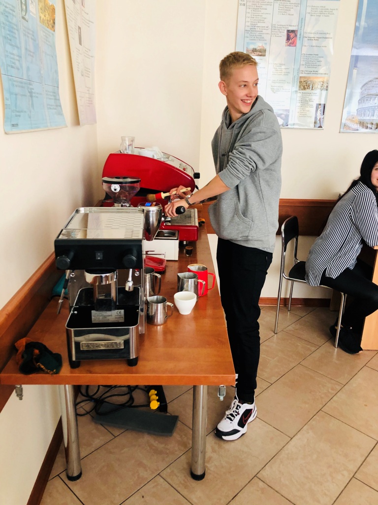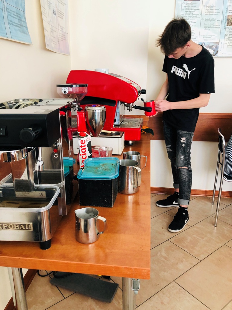 W terminie 03-04.10.2020r. w Łomży odbył się Kurs baristy w ramach Zadania 1 projektu „Kompleksowy program rozwoju ZSTiO nr 4 w Łomży” organizowany przez PROTINUS Ośrodek Szkoleniowo- Badawczy. W kursie uczestniczyło 16 uczniów ZSTiO nr 4 w Łomży. Uczestnicy poznali pochodzenie, rodzaje, gatunki kawy i zdobyli umiejętności takie jak – obsługa ekspresu ciśnieniowego, przygotowywanie espresso, przygotowywanie różnych rodzajów kaw, technika malowania mlekiem – latte art, obsługa klienta w kawiarni.