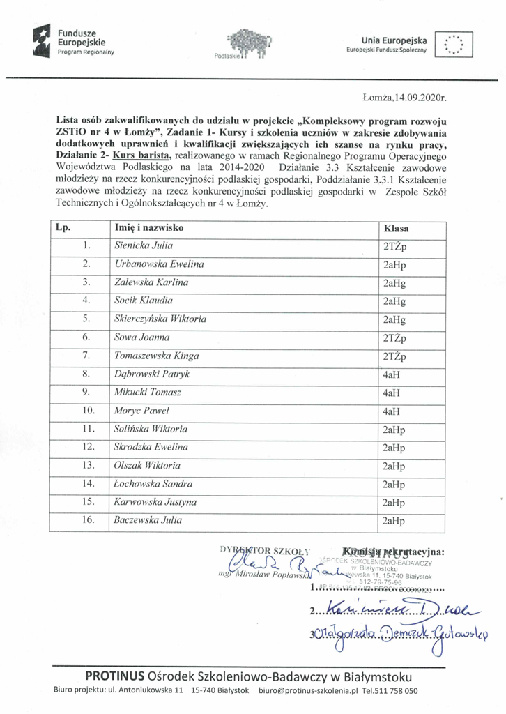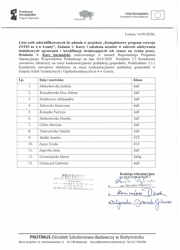 Ogłaszamy rekrutację skierowaną do uczniów klas II-IV o profilu technik żywienia i usług gastronomicznych oraz technik hotelarstwa uczących się w Zespole Szkół Technicznych i Ogólnokształcących nr 4 w Łomży na Kurs barmański (20 godzin) i Kurs barista (15 godzin). Kursy będą realizowane w ramach projektu „Kompleksowy program rozwoju ZSTiO nr 4 w Łomży”, Zadanie 1 - Kursy i szkolenia uczniów w zakresie zdobywania dodatkowych uprawnień i kwalifikacji zwiększających ich szanse na rynku pracy. Dokumenty dostępne są w Punkcie rekrutacyjnym na terenie szkoły. Regulamin rekrutacji jest dostępny na stronie Szkoły.