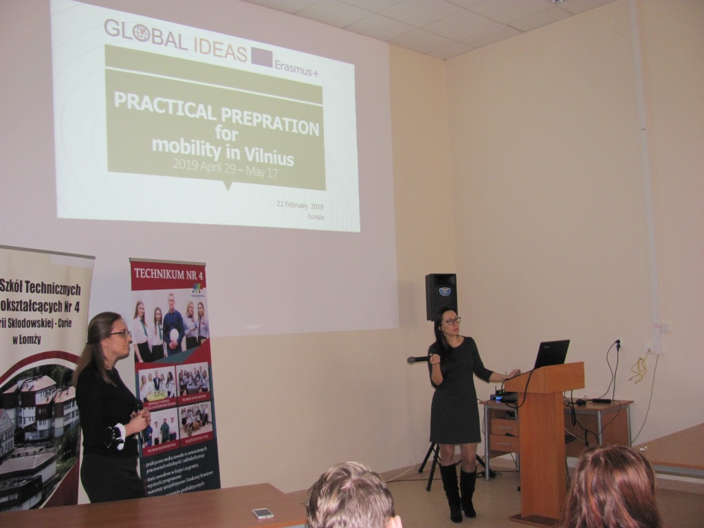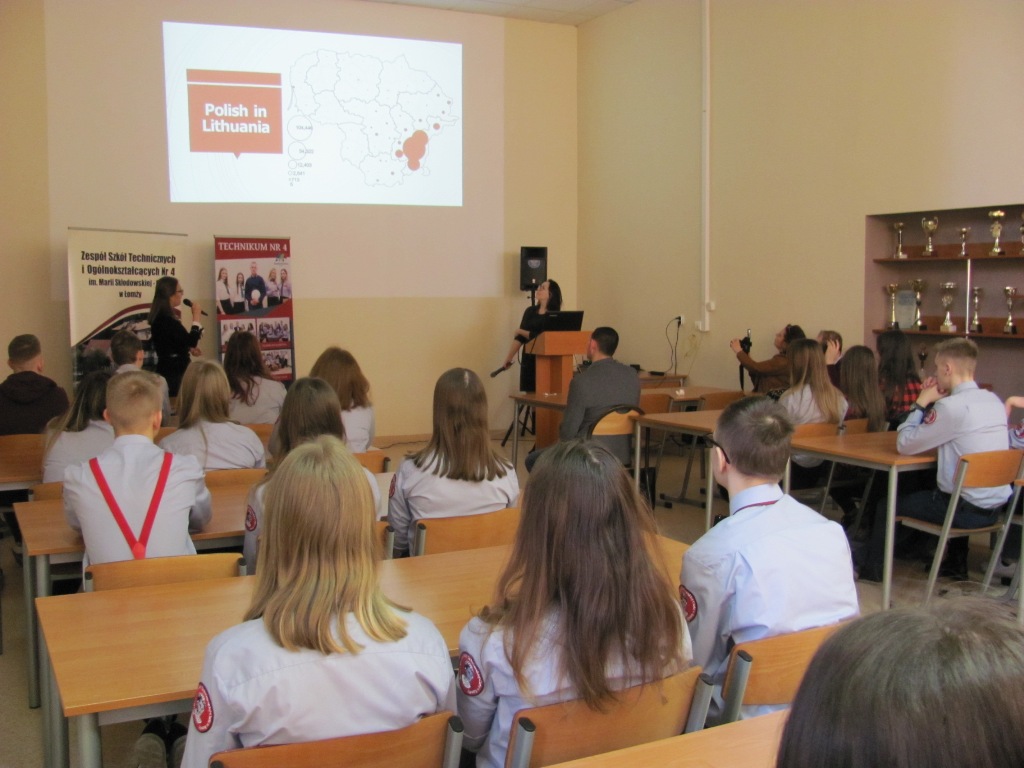 Pierwsza część spotkania była dedykowana uczniom wszystkich klas, chcących w przyszłości aplikować o udział w zagranicznych stażach. Pani Loreta Golubevaite podała najważniejsze informacje kulturoznawcze dotyczące Litwy i zaprezentowała miejsca stażowe przybliżając profil zawodowy przyszłych pracodawców. Uczniowie mogli zapoznać się również z oferowanymi warunkami zakwaterowania, możliwościami spędzania czasu wolnego oraz uzyskać wskazówki niezbędne w przypadku wyjazdów zagranicznych. W drugiej części spotkania wzięli udział wyłącznie uczniowie wyjeżdżający na staż w pierwszym terminie (maj 2019r.). Była to okazja do bliższego poznania się, wymiany bardziej szczegółowych informacji, a tym samym pierwszych prób porozumiewania się z partnerem litewskim w języku angielskim. Zapraszamy do galerii zdjęć.