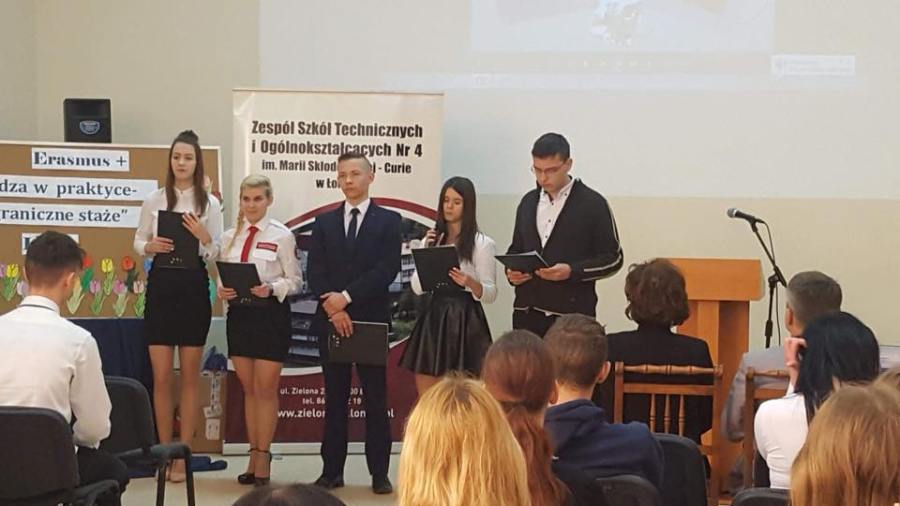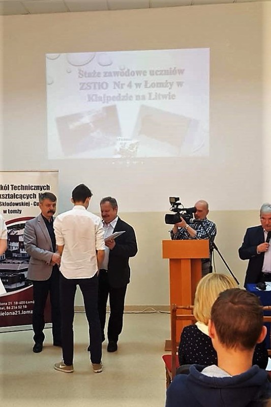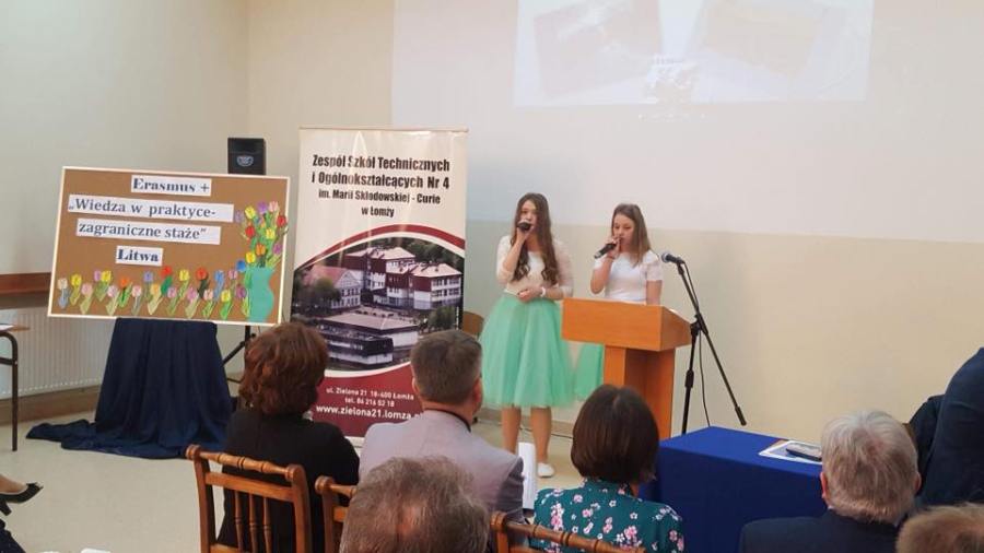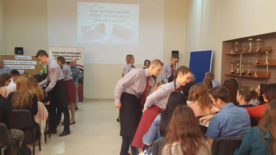 Dnia 21.04.2018 r. odbyło się podsumowanie I etapu projektu „Wiedza w Praktyce – zagraniczne staże” oraz wręczenie uczestnikom projektu Certyfikatów Europass - dokumentów potwierdzających wiedzę i kwalifikacje nabyte w innym kraju europejskim oraz stanowiących przepustkę do polskich i europejskich rynków pracy. W ramach projektu grupa 25 uczniów naszej szkoły z klas II i III o profilach kształcenia: technik żywienia, technik hotelarstwa i technik budownictwa wyjechała na Litwę do Kłajpedy, gdzie w okresie 01-19.05.2017 r. odbywała trzytygodniowe staże w litewskich przedsiębiorstwach w branżach spójnych z obranym przez siebie profilem kształcenia.