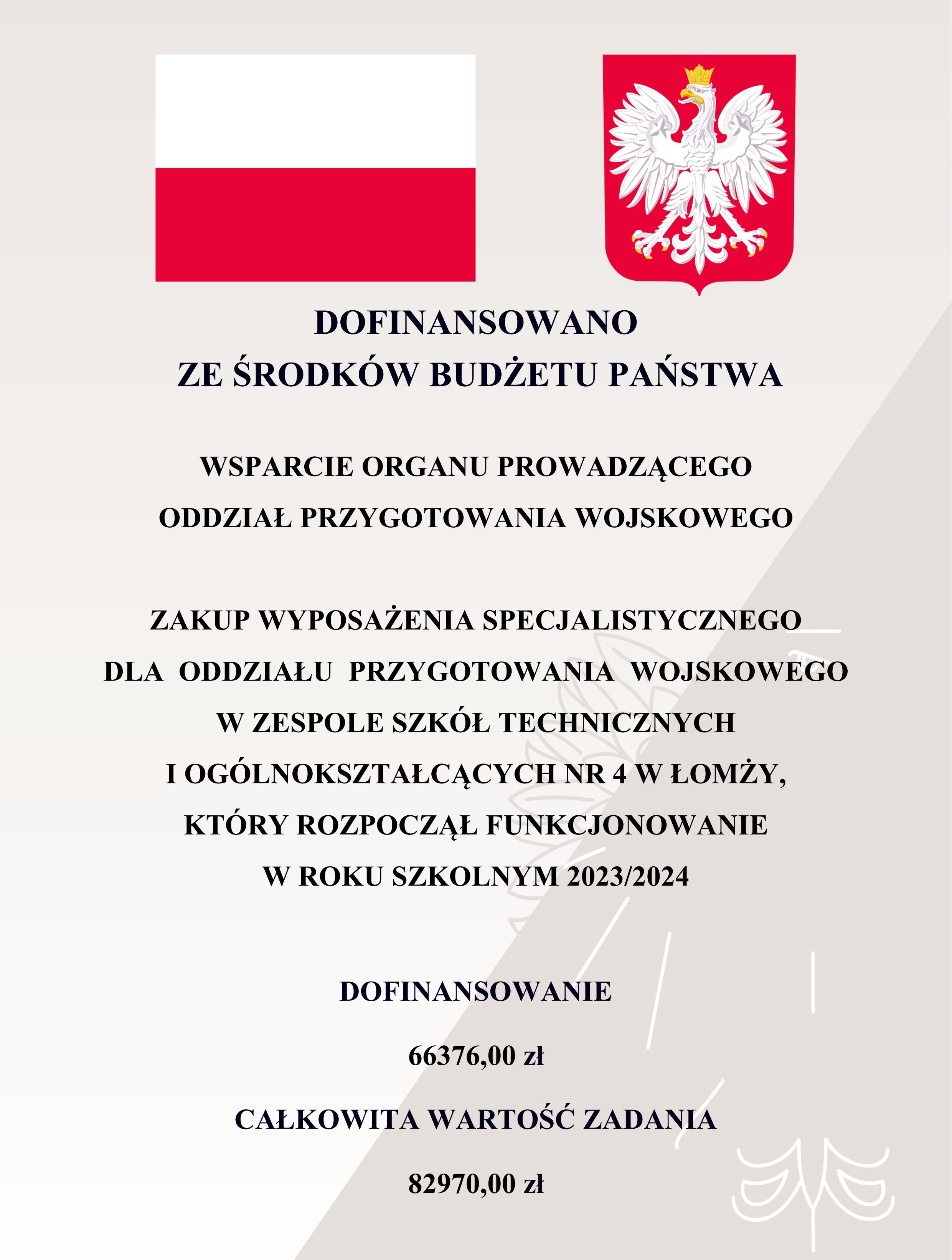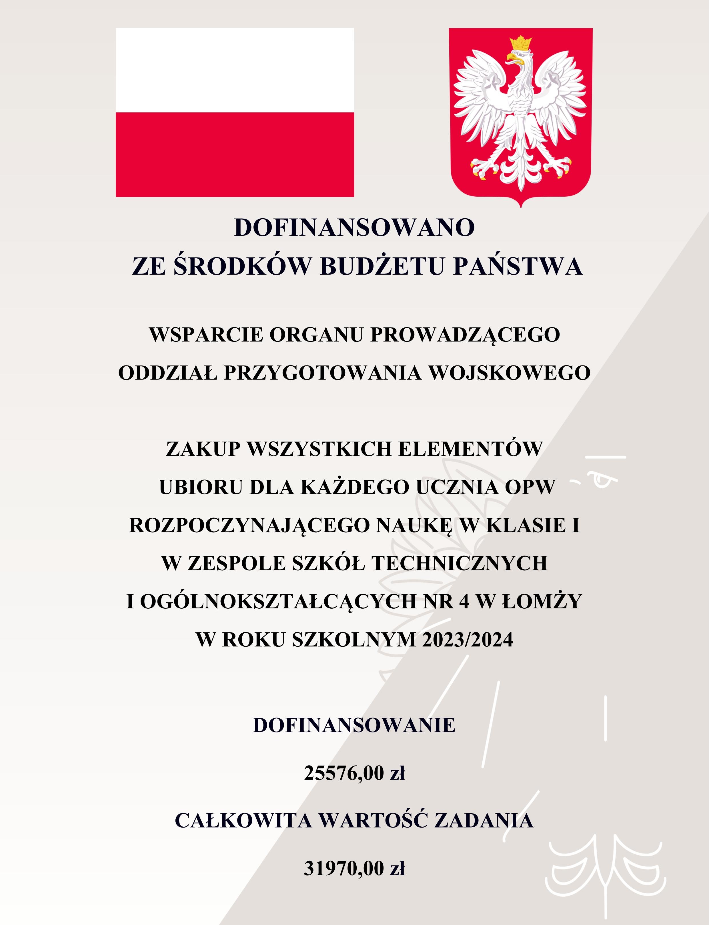 Miasto Łomża – organ prowadzący Oddział Przygotowania Wojskowego (OPW) w Zespole Szkół Technicznych i Ogólnokształcących Nr 4 w Łomży, otrzymało dotację celową od Skarbu Państwa, reprezentowanego przez Ministra Obrony Narodowej.