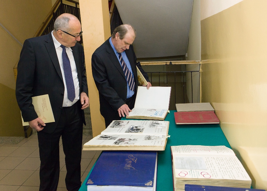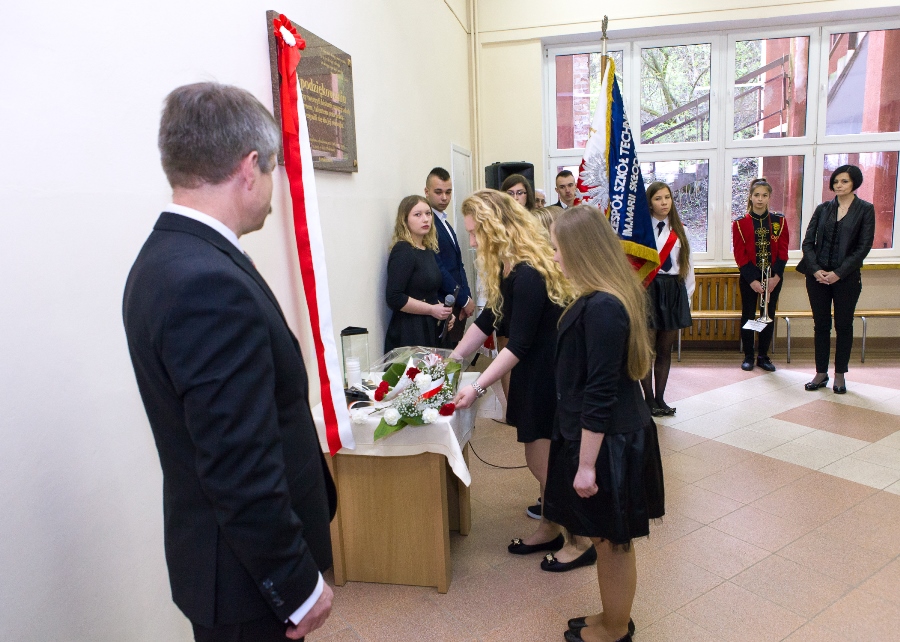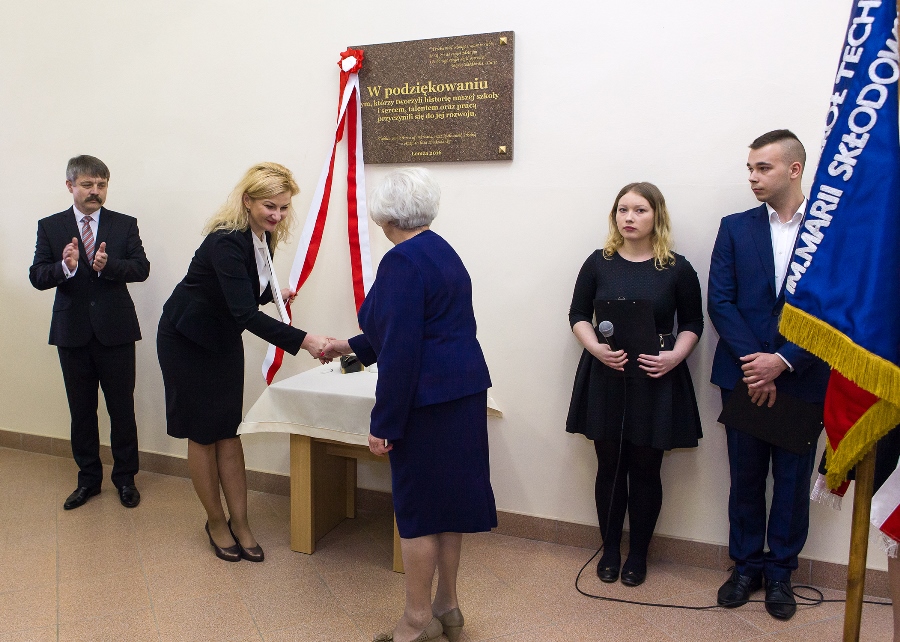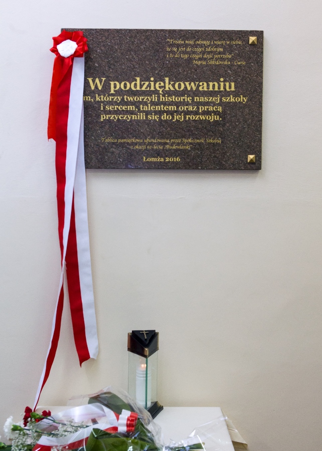 W podziękowaniu tym, którzy tworzyli historię Szkoły „sercem, talentem oraz pracą przyczynili się do jej rozwoju”, Prezydent Miasta Łomży Agnieszka Muzyk i emerytowana Dyrektor Szkoły Pani Maria Ogrodnik odsłoniły kamienną tablicę ufundowaną przez absolwenta Technikum Budowlanego Pana Stanisława Najdę. Biskup Tadeusz Bronakowski poświęcił tablicę i modliliśmy się za „wszystkie pokolenia i nowe pokolenia, które będą tworzyć historię”.