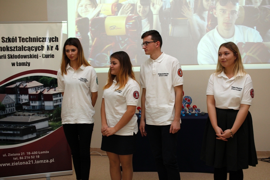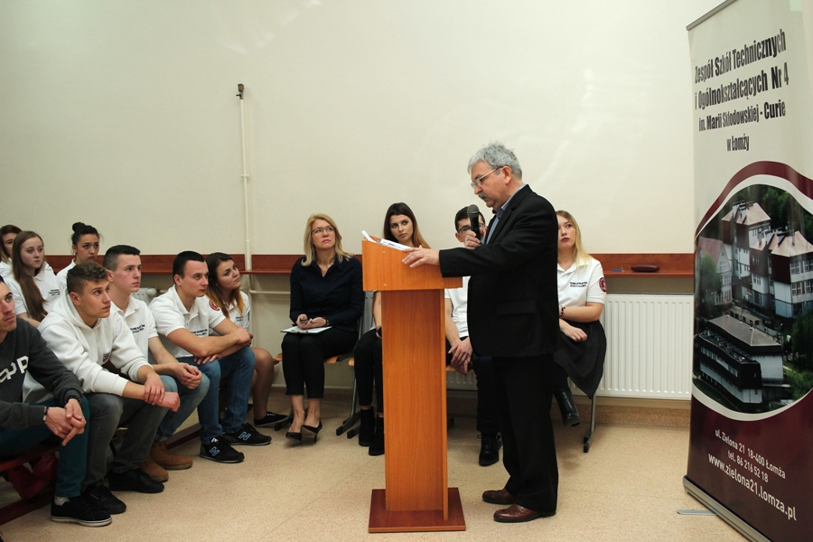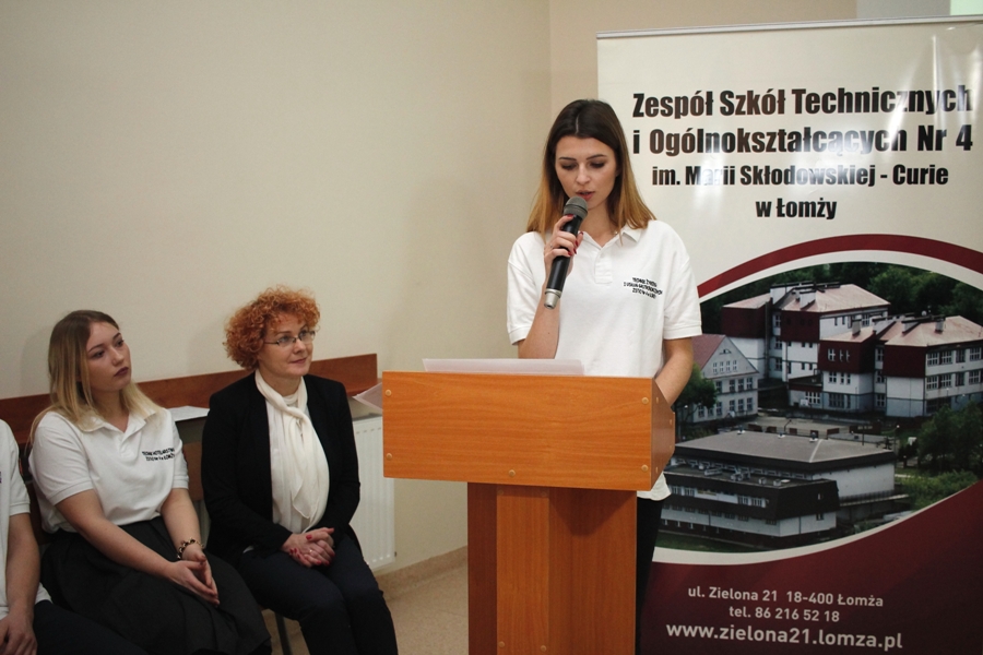 Spotkanie rozpoczął pan dyrektor Artur Ciborowski, który powitał wszystkich zaproszonych gości. Następnie wręczył podziękowania pani Renacie Frankowskiej i pani Iwonie Masalskiej , za umożliwienie udziału młodzieży Technikum Nr 4 w Łomży w tym projekcie. W dalszej części spotkania p. Kazimierz Duda – kierownik kształcenia praktycznego przedstawił cele i znaczenie tego projektu w nauce zawodu uczniów oraz w procesie dydaktycznym. Podkreślił również rangę przedsięwzięcia - pierwszego międzynarodowego projektu kształcenia zawodowego, w którym uczestniczyli uczniowie i nauczyciele tej placówki. Podziękował także wszystkim osobom zaangażowanym w jego realizację.