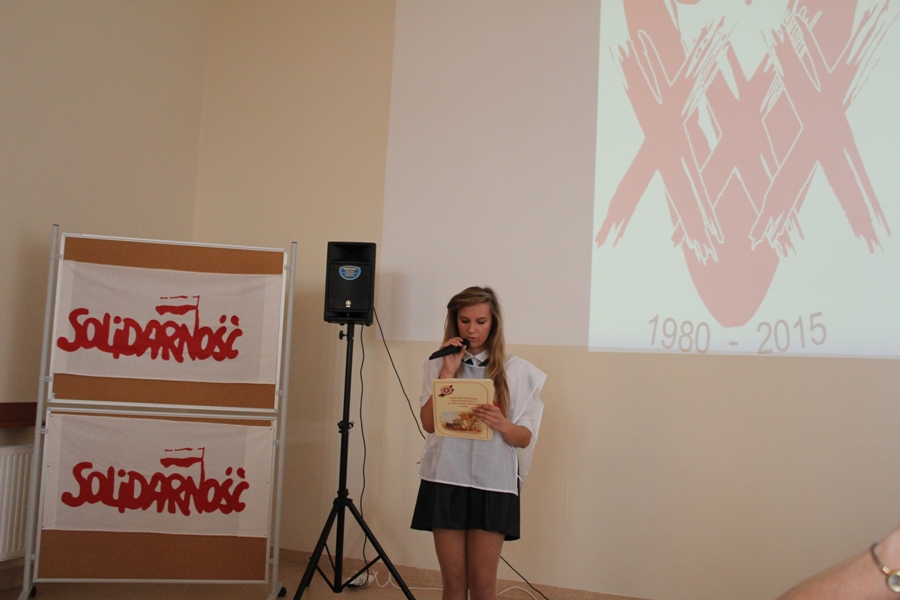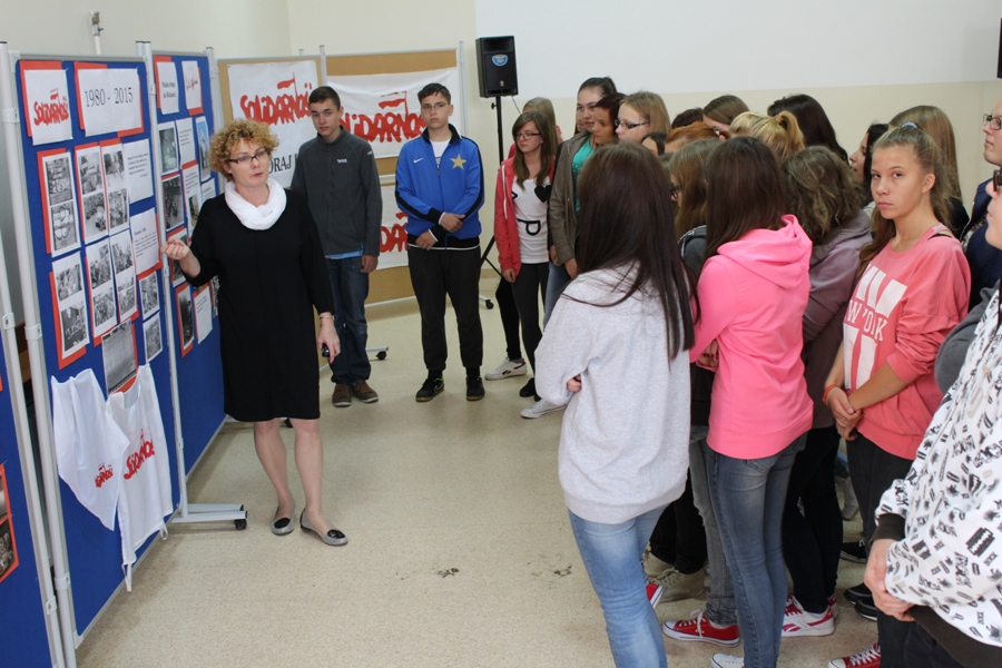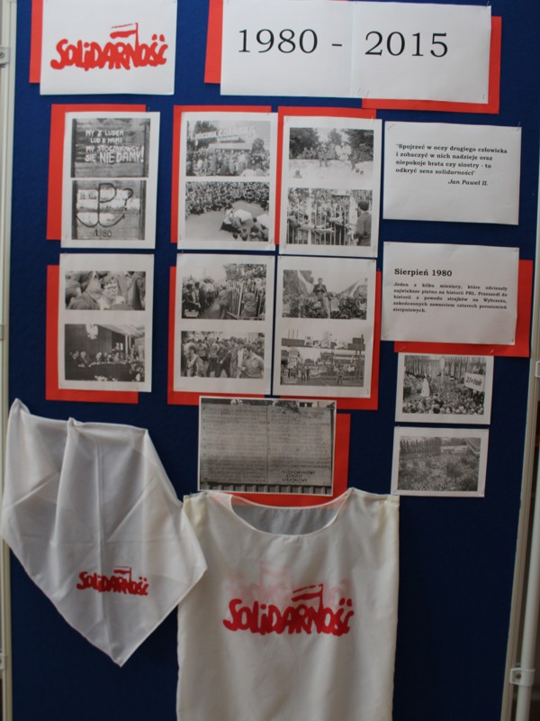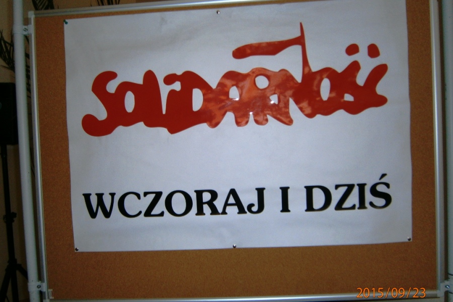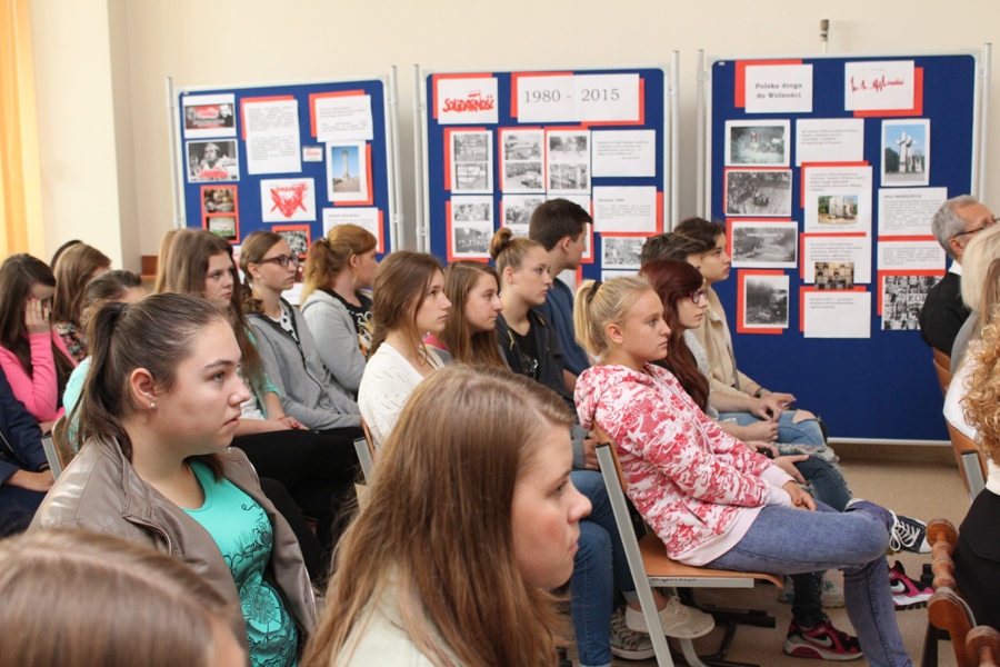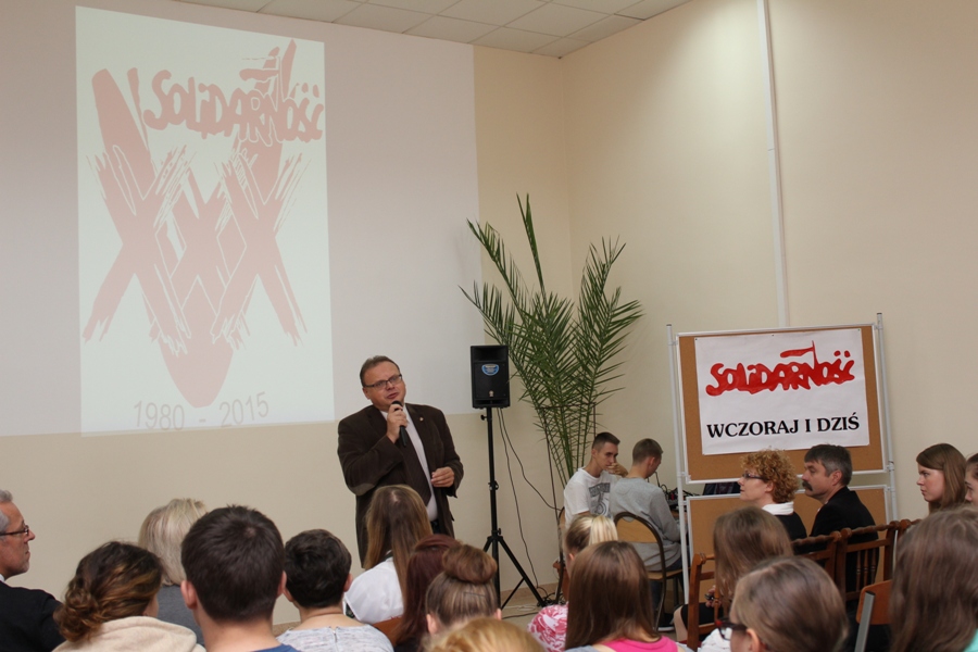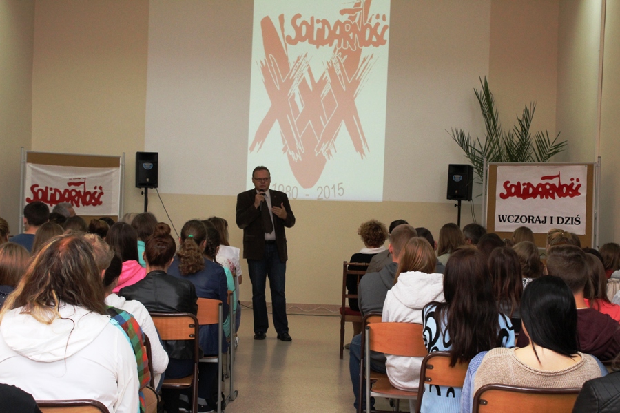 Dnia 23 września 2015r. w ramach realizacji projektu „Solidarność wczoraj i dziś” w naszej szkole odbyła się uroczystość związana z obchodami 35 rocznicy podpisania porozumień sierpniowych i powstania NSZZ „Solidarność”. Pieśń „Mury” Jacka Kaczmarskiego i „Piosenka dla córki” J. Pietrzyka wprowadziły uczestników spotkania w klimat strajków na Wybrzeżu w 1980 roku, natomiast krótki film z filmoteki IPN-u zapoznał ich z okolicznościami i źródłami społecznej rewolucji - czyli okresem powstania ruchu „Solidarności”. Integralną częścią spotkania był wykład dr. hab. Krzysztofa Sychowicza – historyka, zajmującego się m.in. problematyką „Solidarności” w naszym regionie. Przedstawiciel białostockiego oddziału IPN,