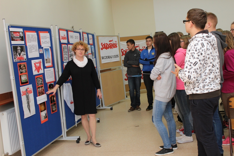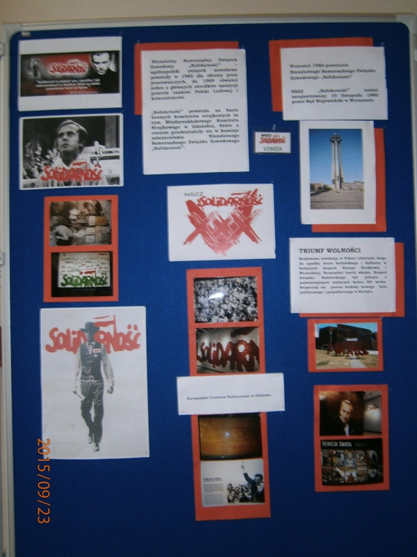 odwołując się do wyobraźni uczniów, przybliżył im tło ówczesnych - komunistycznych realiów życia oraz przemian demokratycznych w PRL-u po podpisaniu „porozumień sierpniowych". Przedstawił także sylwetki i działania członków naszej łomżyńskiej „Solidarności”. Dopełnieniem owego wykładu była szkolna ekspozycja „Solidarność wczoraj i dziś”, ilustrująca polską drogę do wolności oraz 35 lat działalności Związku. Wystawa została przygotowana przez młodzież pod kierunkiem nauczycieli realizujących projekt na podstawie materiałów pochodzących z Europejskiego Centrum „Solidarności” w Gdańsku, z zasobów internetowych IPN-u oraz Łomżyńskiego Oddziału NSZZ „Solidarność”. W trakcie realizacji projektu wykorzystano też materiały pozyskane przez p. Elżbietę Wiśniewską podczas uczestnictwa w Akademii Letniej, zorganizowanej przez Fundację Centrum Solidarności w Gdańsku. W oparciu o wystawę zostały również przeprowadzone lekcje historii w klasach pierwszych LO i Technikum oraz historii i społeczeństwa w klasie drugiej na temat 35 rocznicy powstania „Solidarności”.