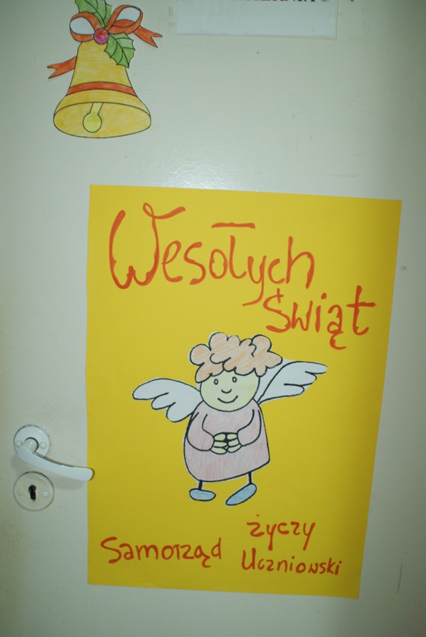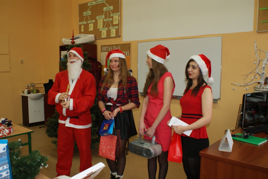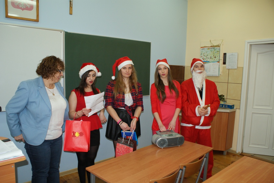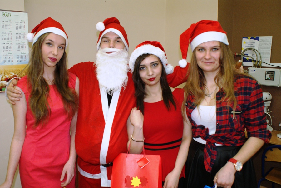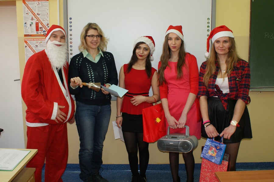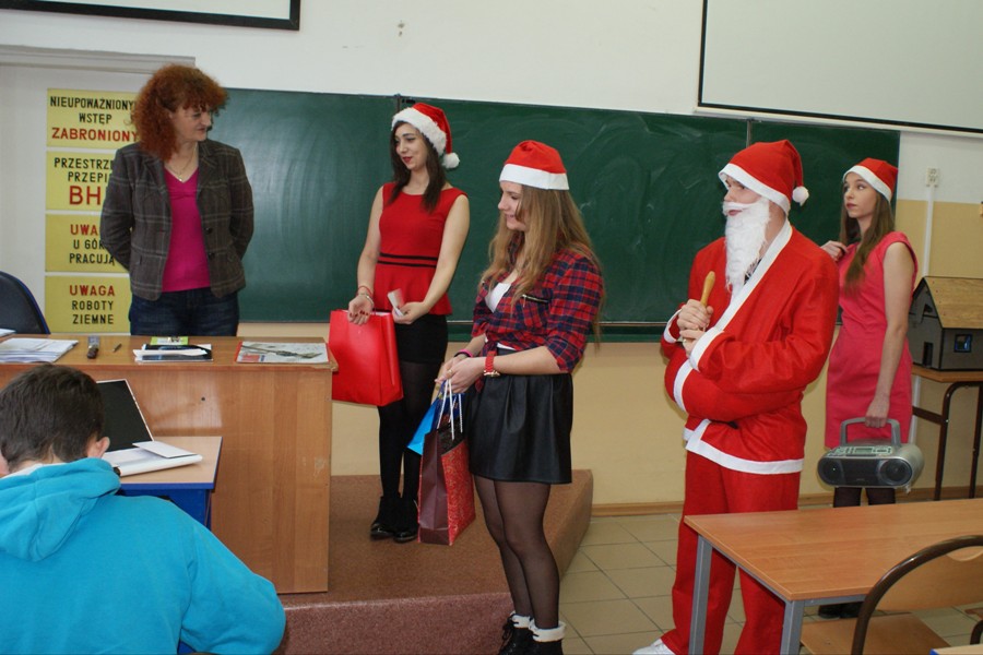 00W piątek 4 grudnia w murach naszej szkoły rozlegał się dźwięk tradycyjnego dzwonka, jakim Święty Mikołaj obwieszcza swoje przybycie. W związku z obchodzonymi 6 grudnia Mikołajkami, na zaproszenie Samorządu Uczniowskiego zagościł u nas Święty Mikołaj wraz z trzema Śnieżynkami. Odwiedzając uczniów podczas lekcji, życzył wesołych świąt Bożego Narodzenia; Śnieżynki zaś przy dzwięku kolęd częstowały wszystkich słodkościami i zadawały świąteczne zagadki. Ponadto, nauczyciele i pracownicy szkoły otrzymali kartki okolicznościowe wykonane przez Samorząd Uczniowski. W szkole zagościła już świąteczna atmosfera dzięki wizycie  Świętego  Mikołaja, jak również za sprawą licznych dekoracji