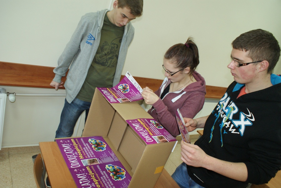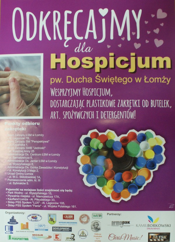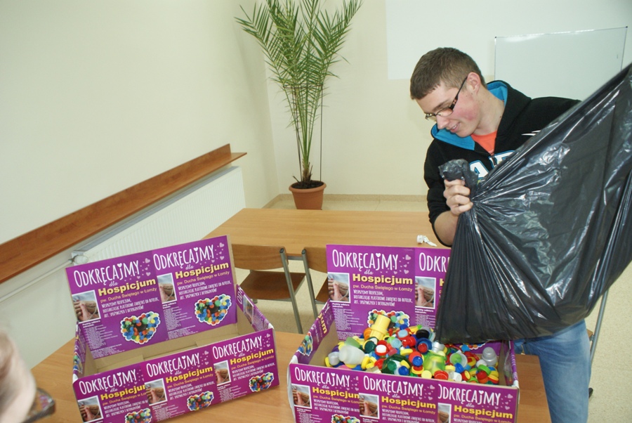 00Informujemy, że nasza szkoła przyłączyła się do akcji „Odkręcajmy dla Hospicjum". Jest to kontynuacja prowadzonych już wcześniej działań, gdyż szkoła od kilku lat systematycznie wspiera Hospicjum pw. Ducha Świętego w Łomży m.in. poprzez zbiórkę nakrętek czy detergentów. Przygotowaliśmy dwa duże pudełka, które zostały ustawione w sklepiku szkolnym oraz w czytelni.Pierwsze zakrętki już znalazły się w pudełkach. Rozwiesiliśmy liczne plakaty informujące o zbiórce, będziemy też Wam o niej regularnie przypominać poprzez radiowęzeł i ogłoszenia w klasach. Przynoście plastikowe nakrętki z domu, a pijąc napoje w szkole, pamiętajcie aby zakrętki - zamiast do koszy na śmieci – wkładać do przygotowanych pudełek. Wesprzecie tym samym szczytny cel, jak również zaangażujecie się w działania na rzecz środowiska – recykling plastiku. Szkoła przystąpiła do akcji z inicjatywy Samorządu Uczniowskiego. Zachęcamy do udziału w akcji!
