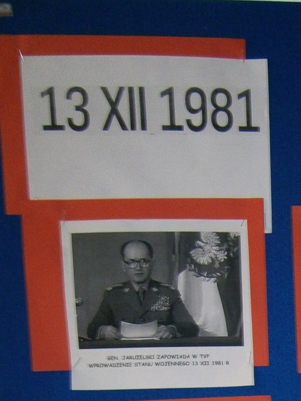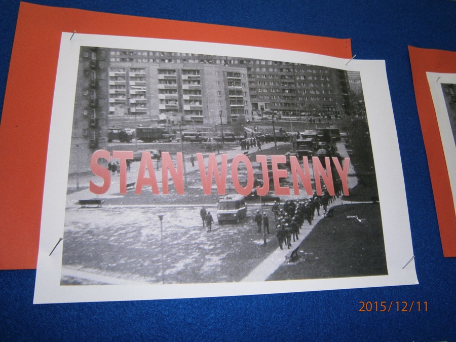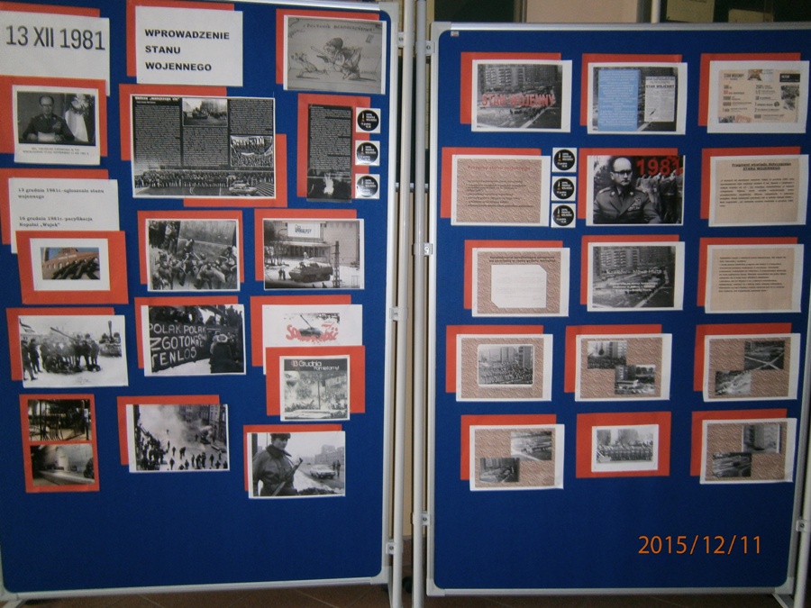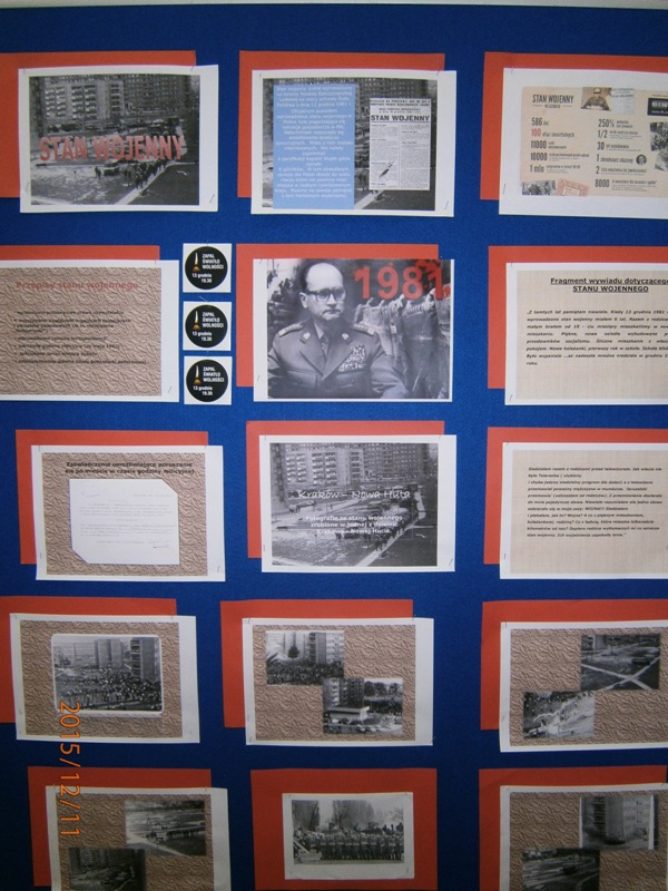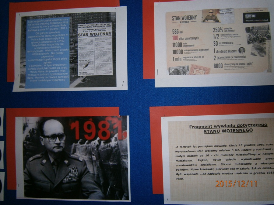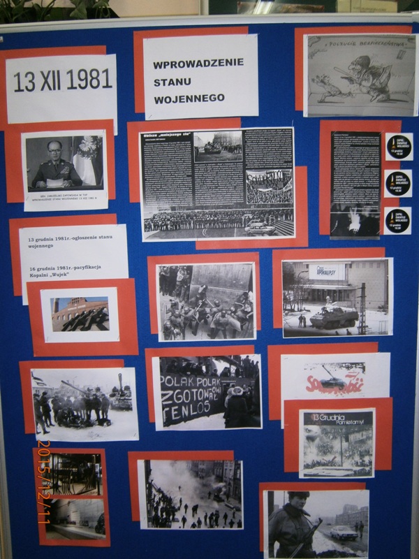 Przypomnieniu i utrwaleniu pamięci tych tragicznych wydarzeń w naszej szkole służy ekspozycja „Stan wojenny”, przygotowana przez uczniów pod kierunkiem pani Elżbiety Wiśniewskiej, na podstawie