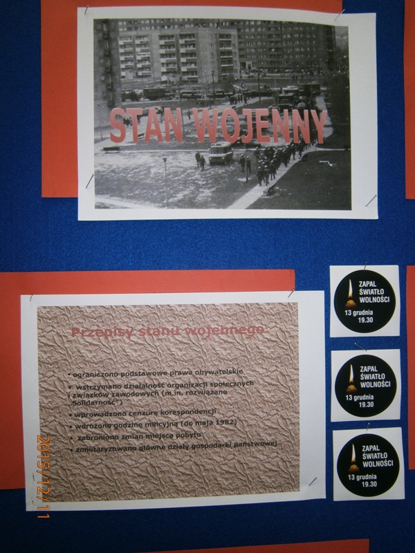 materiałów Instytutu Pamięci Narodowej oraz Europejskiego Centrum Solidarności. Zamieszczone tam zdjęcia, dokumenty, fragmenty wspomnień i wypowiedzi historyków z IPN przybliżają młodzieży okoliczności wprowadzenia stanu wojennego i realia życia codziennego w tamtym czasie. Prezentują represje władz wobec społeczeństwa oraz formy oporu społecznego. Na wystawie nie zabrakło też apelu IPN o zapalenie światełka wolności 13 grudnia o godzinie 19.30 dla uczczenia pamięci 100 ofiar stanu wojennego.