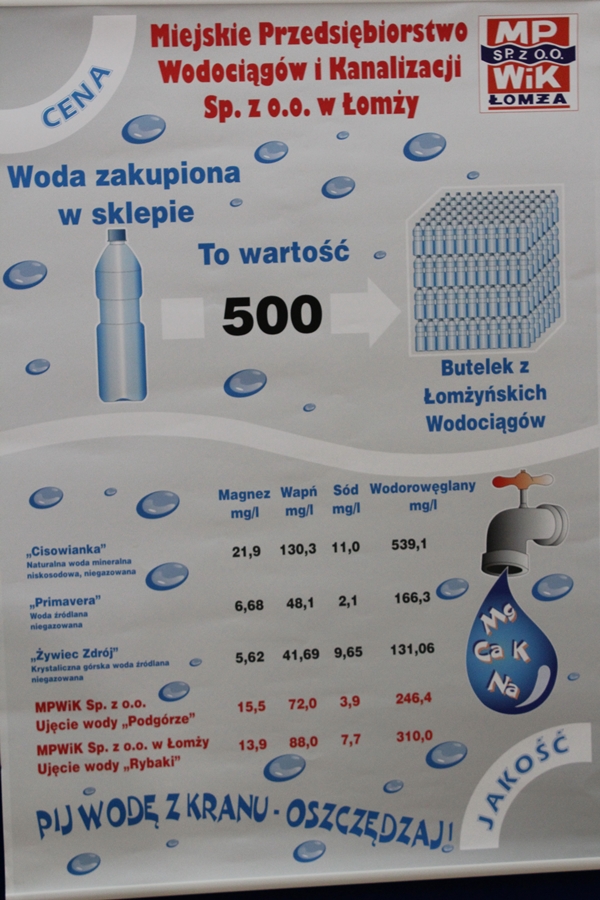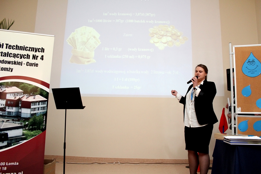 W dniach 22, 23, 30 marca 2016 r. uczniowie ZSTiO Nr 4 w Łomży uczestniczyli w wycieczkach do oczyszczalni ścieków MPWiK Sp. z o.o. w Łomży. Informacje tam uzyskane wykorzystali w konkursie o wodzie i MPWiK Sp. z o.o. w Łomży. W pierwszym konkursie o wodzie i MPWiK Sp. z o.o. w Łomży zwyciężyła uczennica klasy 1TŻ Sylwia Łada. Drugie miejsce zdobyła Rozalia Psiak z klasy 1TŻ, a trzecie Natalia Rogowska(1TŻ) i Katarzyna Mroczkowska (1AH). Uczniowie naszej szkoły obejrzeli film „Woda w naszym otoczenie” i uczestniczyli w prelekcji przygotowanej przez pracowników MPWiK Sp. z o.o. w Łomży na temat stacji poboru i uzdatniania wody.