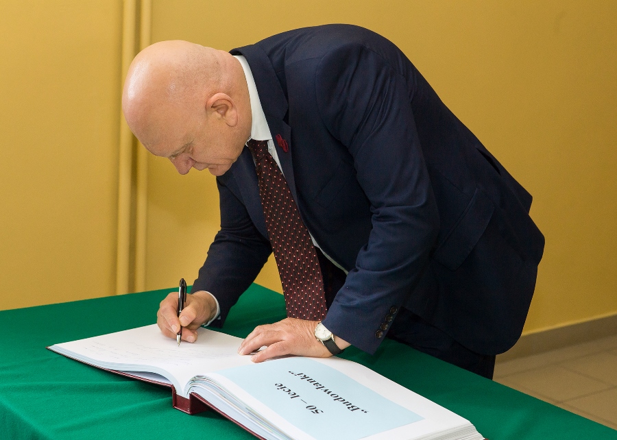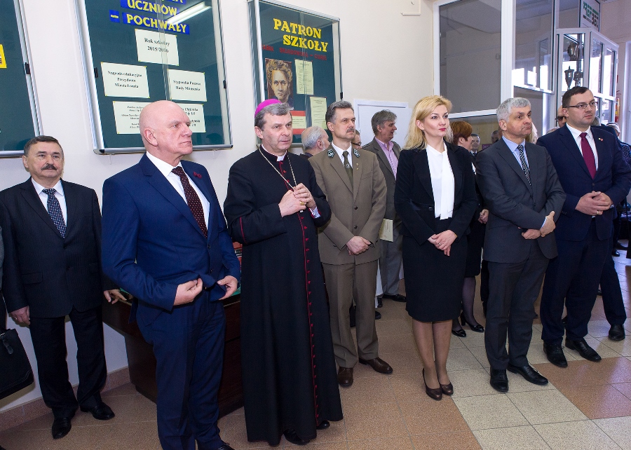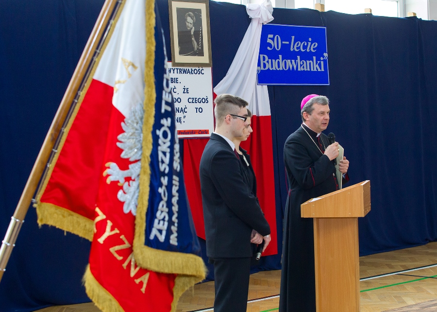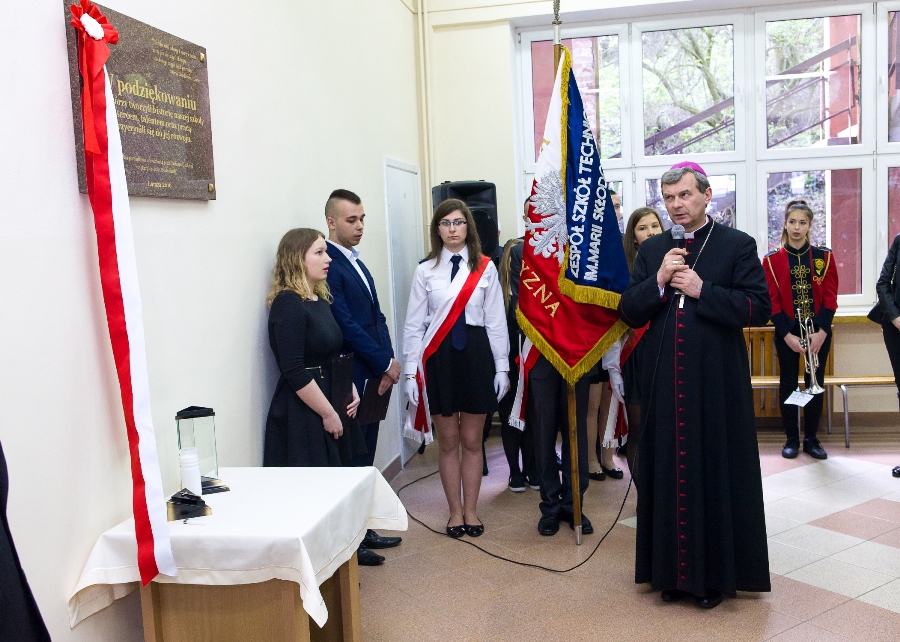 W podziękowaniu tym, którzy tworzyli historię Szkoły „sercem, talentem oraz pracą przyczynili się do jej rozwoju”, Prezydent Miasta Łomży Agnieszka Muzyk i emerytowana Dyrektor Szkoły Pani Maria Ogrodnik odsłoniły kamienną tablicę ufundowaną przez absolwenta Technikum Budowlanego Pana Stanisława Najdę. Biskup Tadeusz Bronakowski poświęcił tablicę i modliliśmy się za „wszystkie pokolenia i nowe pokolenia, które będą tworzyć historię”.