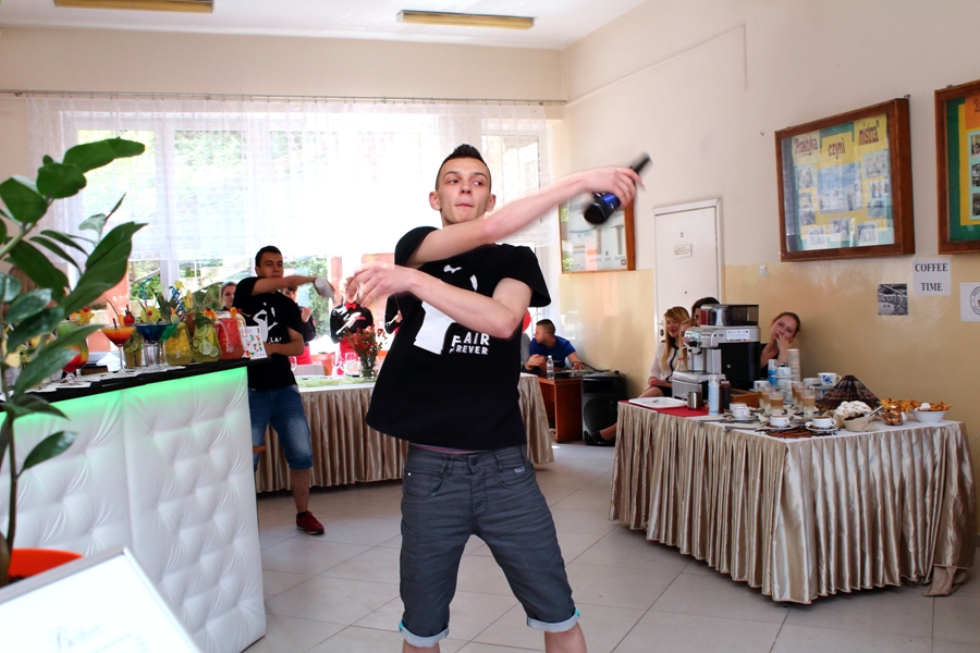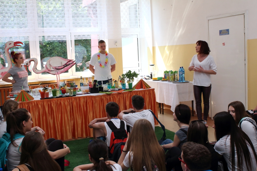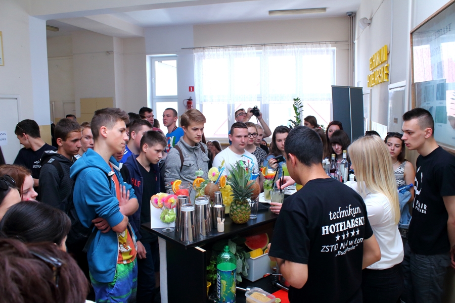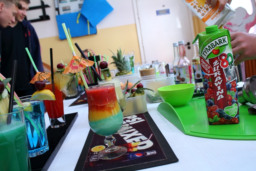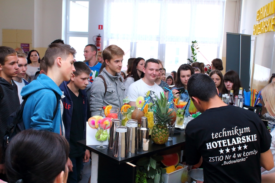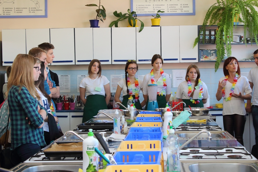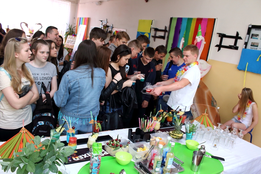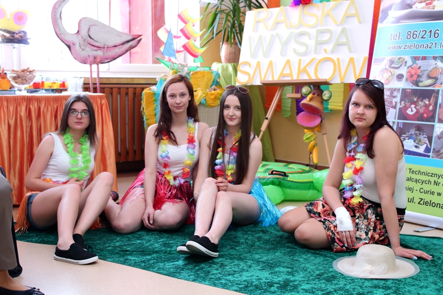 Następnie uczniowie uczący się zawodu technik żywienia zaprosili gimnazjalistów na Rajską Wyspę Smaków. Prawdziwy klimat tropików tworzyły m.in. owocowe piramidy, desery i koktajle. Można było obserwować proces przygotowywania pizzy oraz pieczenia babeczek. Dla gimnazjalistów przygotowano konkurs diagnozujący poziom wiedzy na temat produktów spożywczych. Zarówno zwycięzcy, jak i wszyscy uczestnicy otrzymali nagrody.