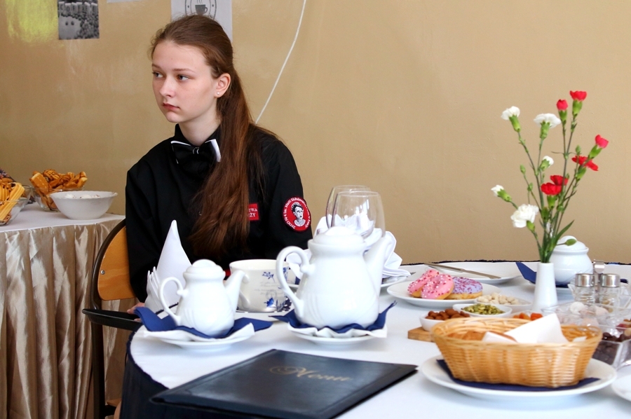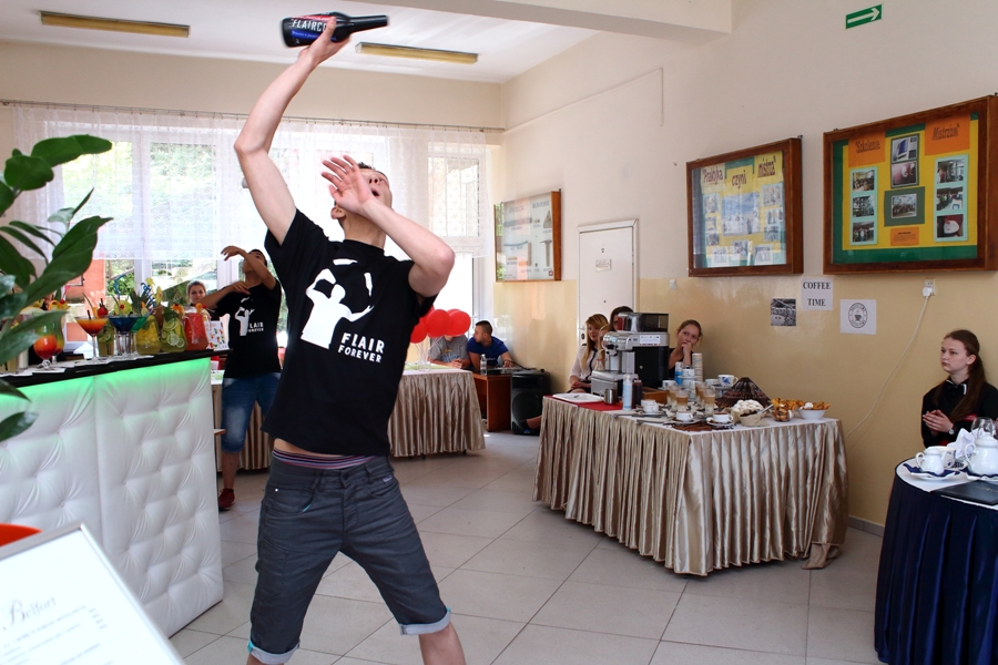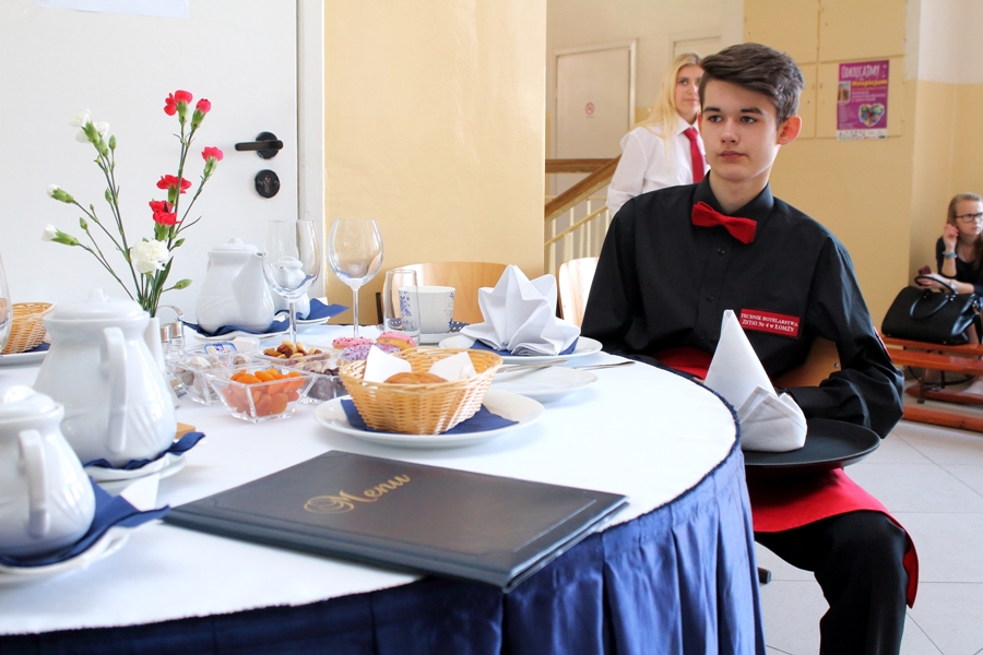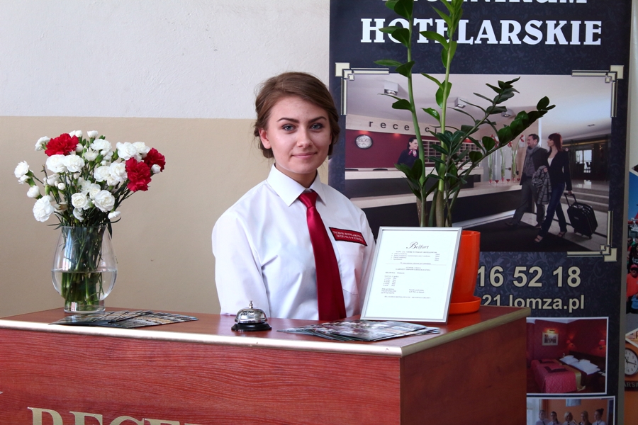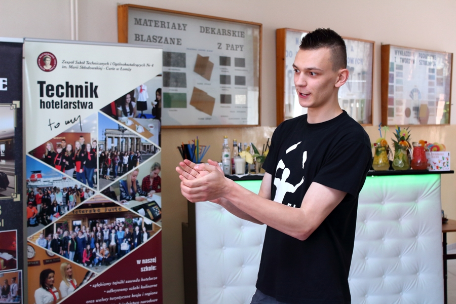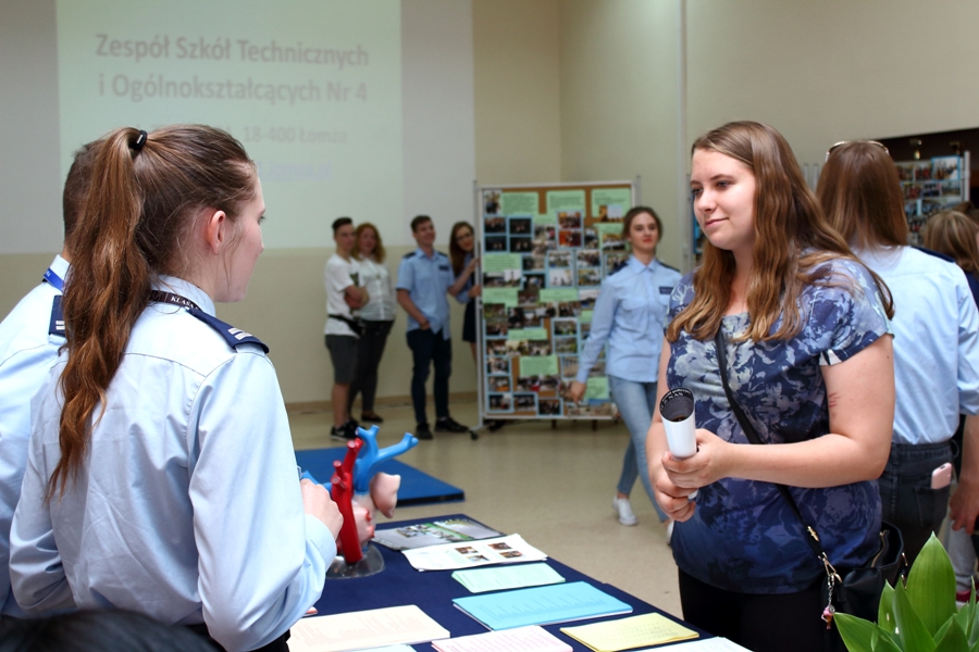 W szkolnej auli gimnazjaliści zwiedzali stoiska: IV Liceum Ogólnokształcącego, Technikum oraz militariów przygotowane przez OSW Związek Strzelecki „Strzelec”'. Gościom podobała się ekspozycja zdjęć dokumentujących ważne wydarzenia z życia szkoły. Zainteresowani mogli wziąć udział w warsztatach samoobrony prowadzonych przez współpracującą ze szkołą Jednostką Strzelecką 1012 w Łomży. W dalszej części spotkania nasi uczniowie zapoznali gimnazjalistów z dokonaniami młodzieży uczącej się zawodu technik hotelarstwa. Po projekcji filmu z warsztatów językowych z native speakerem odbyły się pokazy: musztry barmańskiej, sztuki baristycznej (parzenie i dekorowanie kawy latte, espresso, capucino, americana), przygotowywania drinków bezalkoholowych (Mojito, Jamajca, Pina Colada), kelnerskiej obsługi stołu śniadaniowego oraz profesjonalnej obsługi gości w recepcji hotelu.