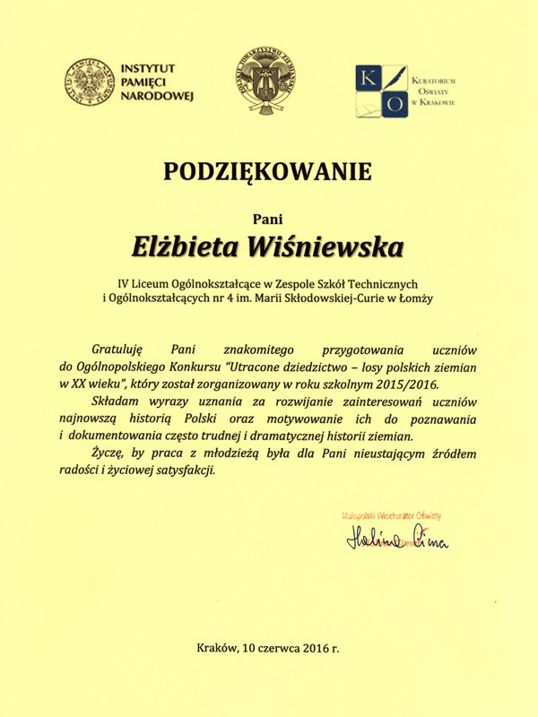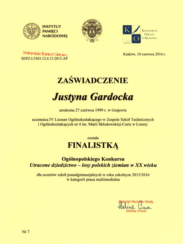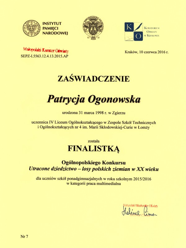 10 czerwca 2016 roku w Krakowie odbył się finał Ogólnopolskiego Konkursu „Utracone dziedzictwo-losy polskich ziemian w XX wieku”, w którym zmierzyło się 47 uczniów ze szkół gimnazjalnych oraz 44 uczniów ze szkół ponadgimnazjalnych z całej Polski. Finalistkami w kategorii pracy multimedialnej zostały uczennice naszej szkoły: Justyna Gardocka i Patrycja Ogonowska, które zaprezentowały pracę „Dzieje dworu w Drozdowie i losy rodziny Lutosławskich w XX wieku”. Ich opiekunem naukowym była pani Elżbieta Wiśniewska. Na uroczystym podsumowaniu konkursu, odbywającym się w pięknej rezydencji państwa Elżbiety i Antoniego Potockich w Krakowie-Olszy, wszyscy uczestnicy etapu ogólnopolskiego mieli okazję zwiedzić wspaniale zachowane i odrestaurowane wnętrza oraz obejrzeć pamiątki rodzinne pieczołowicie przekazywane z pokolenia na pokolenie. Właściciel posiadłości przybliżył uczestnikom uroczystości dzieje rodziny Potockich i dworu w Olszy. Następnie laureaci i finaliści otrzymali zaświadczenia i nagrody, a ich nauczyciele - opiekunowie naukowi podziękowania z rąk organizatorów - przedstawicieli Polskiego Towarzystwa Ziemiańskiego, Oddziałowego Biura Edukacji Publicznej IPN w Krakowie oraz Kuratorium Oświaty w Krakowie.