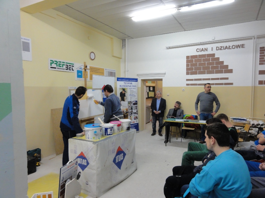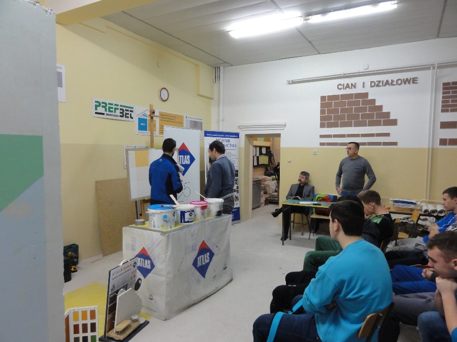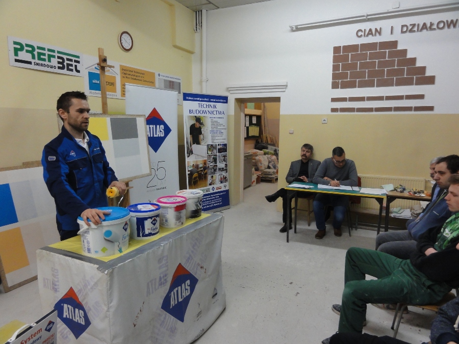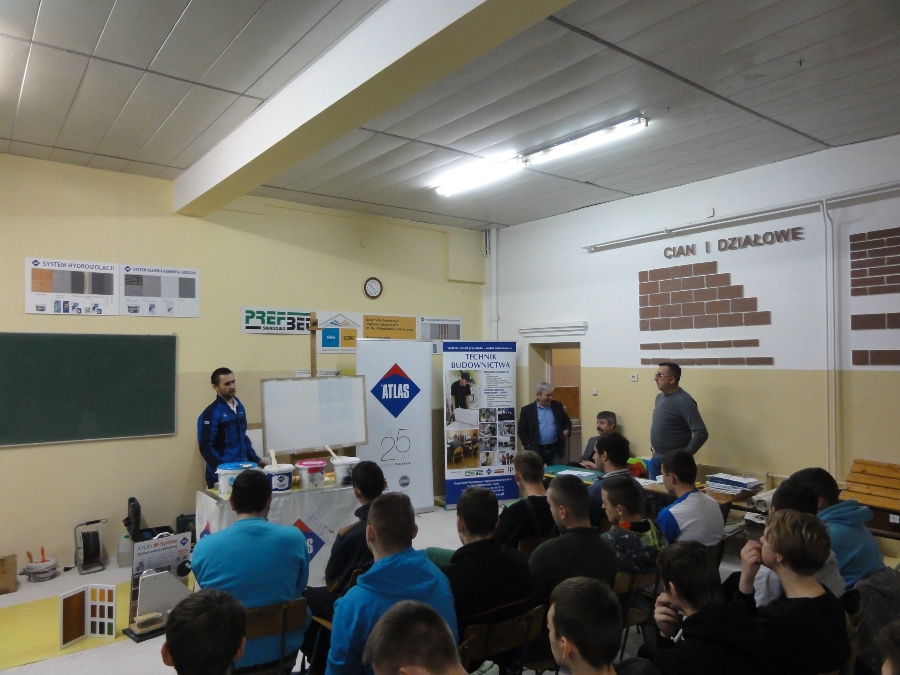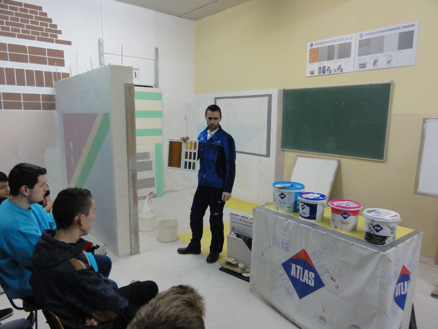 W dniu 16.12.2016r. na terenie naszej szkoły w pracowni budowlanej nr 1 przeprowadzone zostało szkolenie przez producenta materiałów budowlanych firmę ATLAS. Tematem spotkania było zaprezentowanie zastosowania produktów firmy, takich jak: