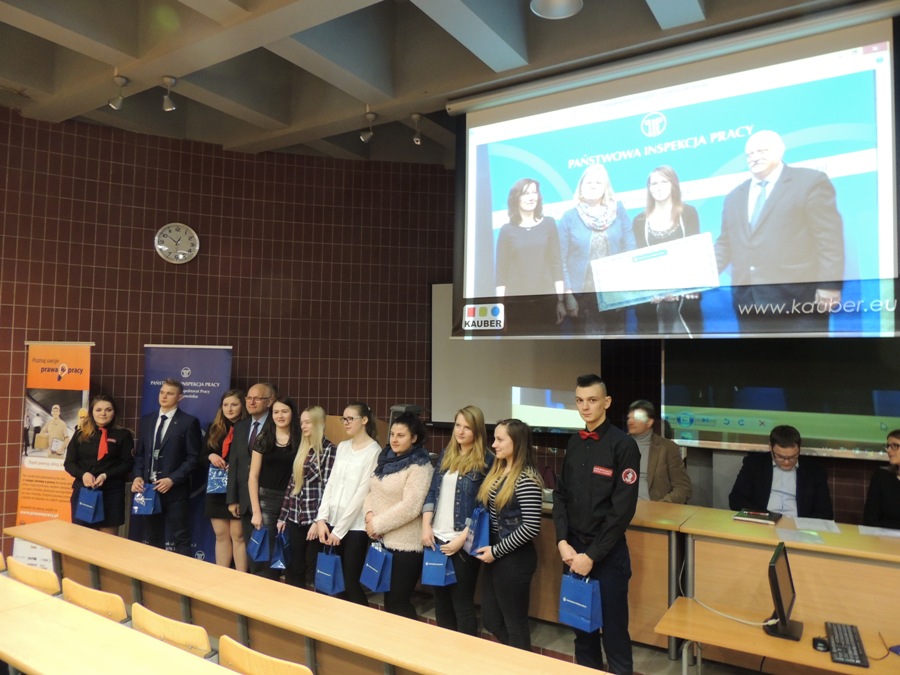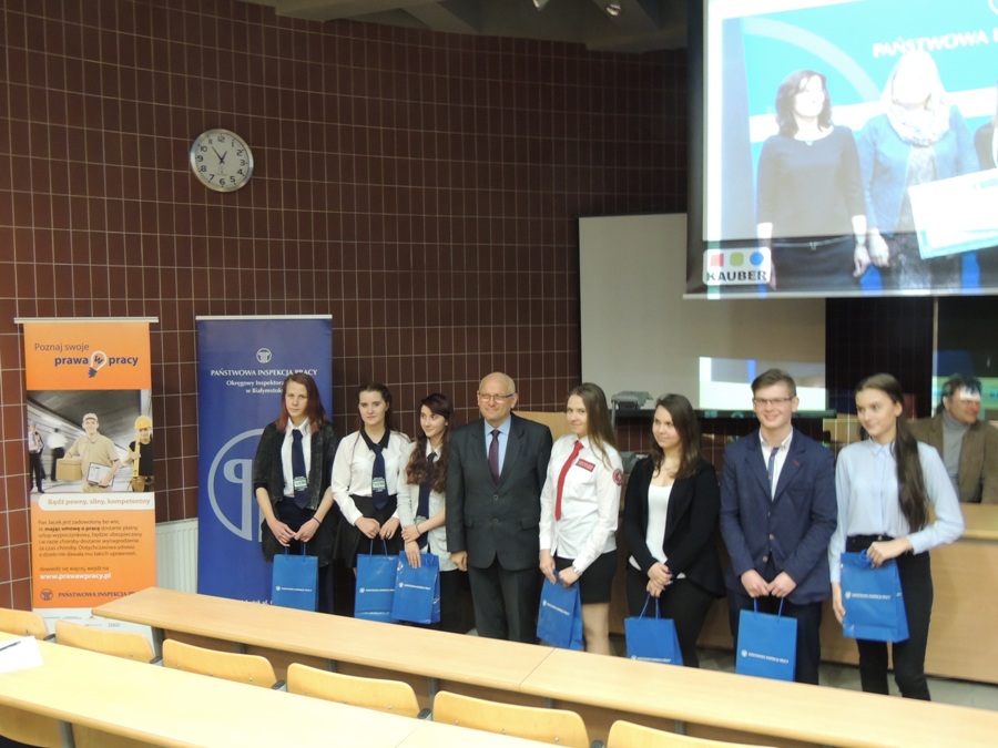 Na zakończenie części finałowej Okręgowy Inspektor Pracy Pan Marek Aleksiejuk wręczył laureatom oraz uczestnikom finału nagrody rzeczowe. Podsumował rywalizację na bardzo wysokim poziomie. Złożył też dyrekcjom oraz nauczycielom gratulacje oraz wyrazy podziękowania za dobre przygotowanie merytoryczne uczniów do konkursu.