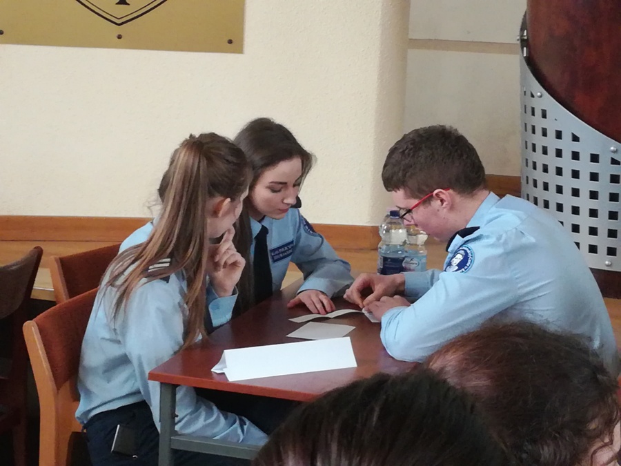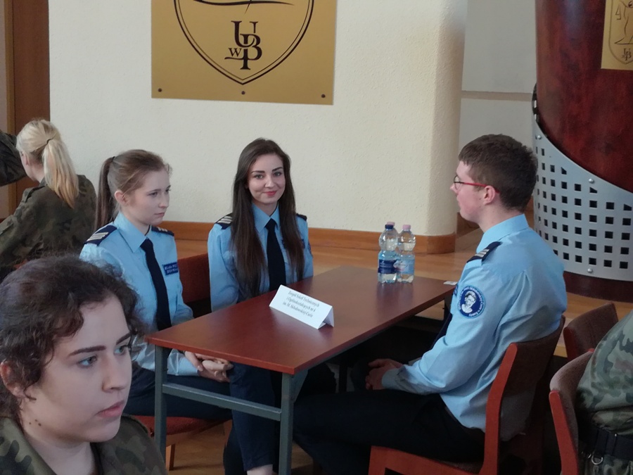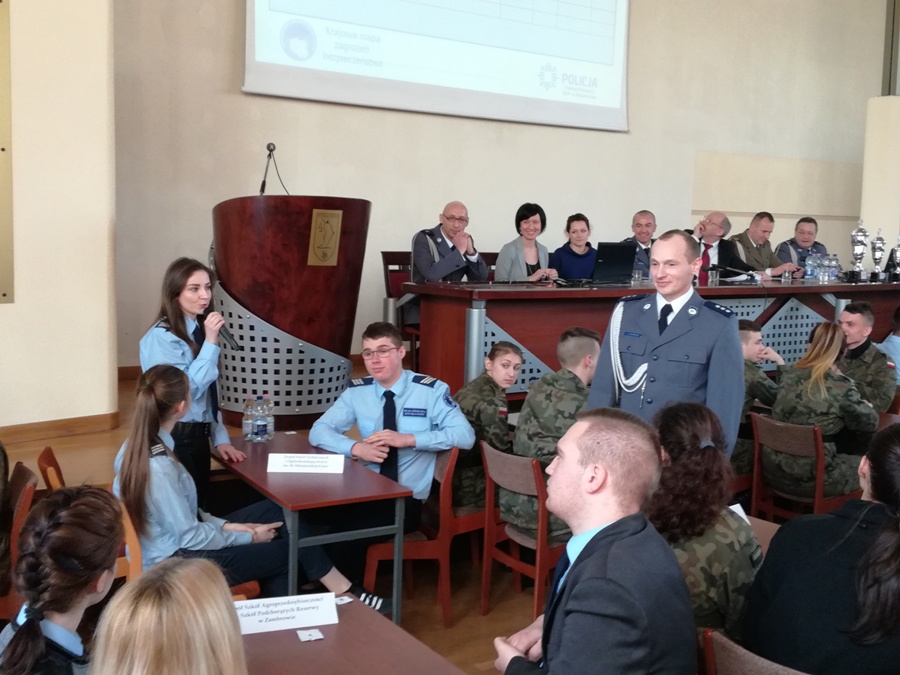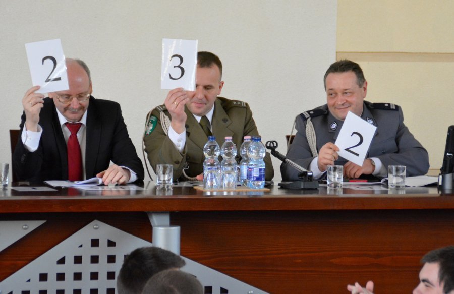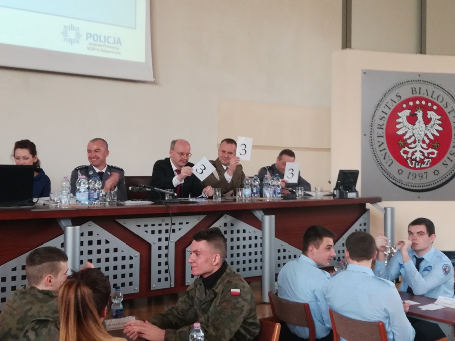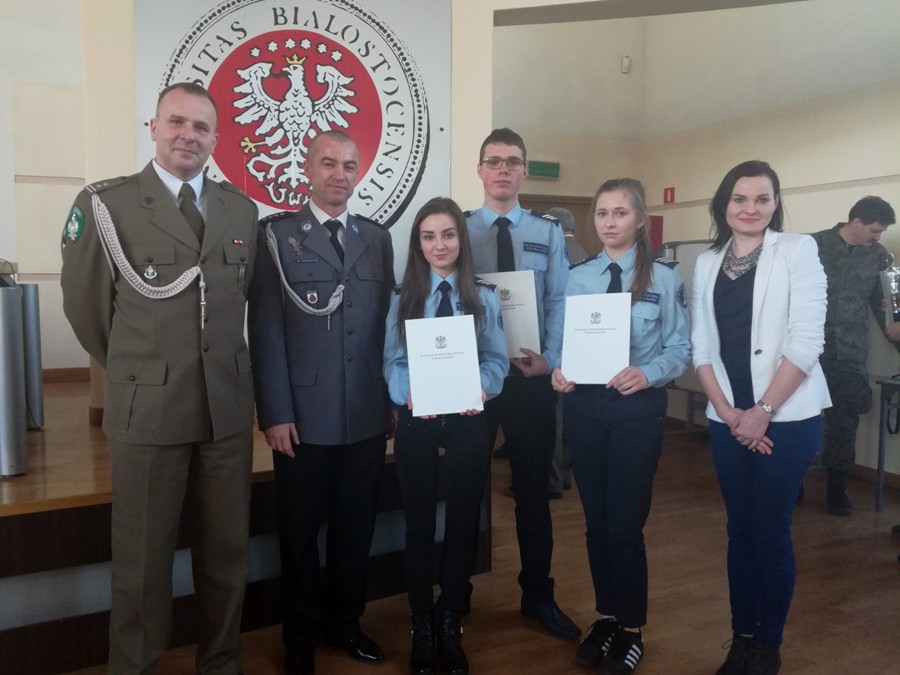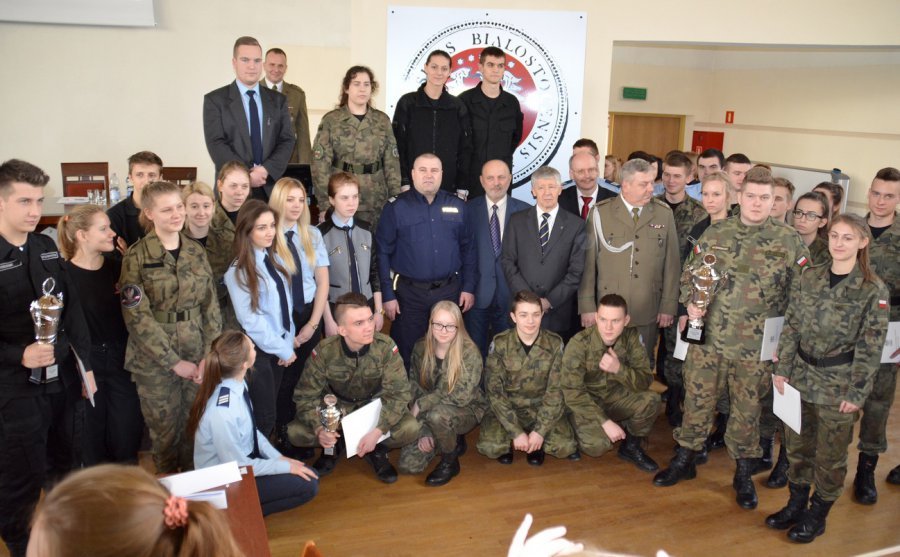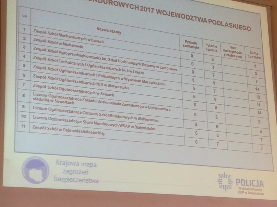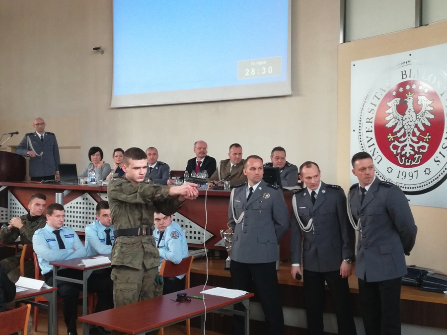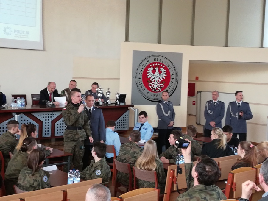 W czasie spotkania 11 drużyn miało również okazję sprawdzić swoje umiejętności i wiedzę w trakcie rywalizacji przygotowanej przez funkcjonariuszy Wydziału Prewencji i Wydziału Kadr Komendy Wojewódzkiej Policji w Białymstoku, która składała się z trzech etapów: I etap stanowiły pytania zamknięte dotyczące służby w formacjach podległych MSWiA, II – pytania otwarte z tej samej tematyki oraz etap III – strzelanie na trenażerze. Trzyosobowa drużyna uczniów naszej szkoły w składzie: Martyna Kosińska, Katarzyna Bałon oraz Adam Szymański z klasy 3AP reprezentowała profil służba w policji. Po dwóch etapach nasza drużyna prowadziła w klasyfikacji ex aequo z inną drużyną, uzyskując maksymalną liczbę punktów możliwą do zdobycia. Jednak po trzecim etapie ostatecznie nasza drużyna zakończyła rywalizację uplasowując się poza podium. Mimo tego, nasi reprezentanci wracali do domu w dobrych humorach, wzbogaceni o nowe doświadczenia.