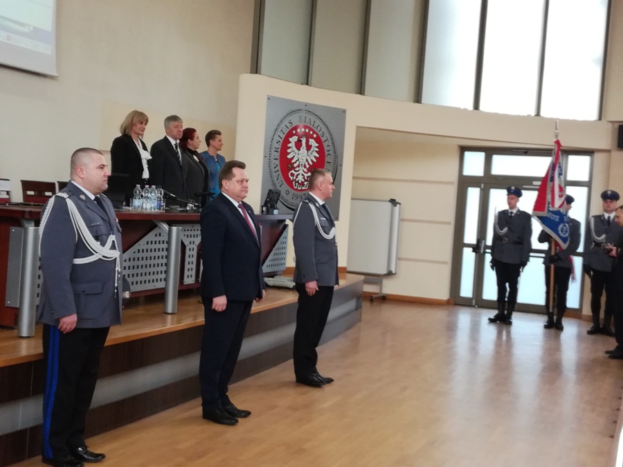 Swoje słowa do zaproszonych gości i przybyłej młodzieży skierowali także Komendant Wojewódzki Policji w Białymstoku Pan nadinspektor Daniel Kołnierowicz, Komendant Podlaskiego Oddziału Straży Granicznej Pan podpułkownik SG Grzegorz Biziuk oraz Kurator Oświaty w Białymstoku Pani Jadwiga Mariola Szczypiń. Ponadto, głos zabrali również Dyrektor Biura Prewencji Komendy Głównej Policji Pan inspektor Dariusz Minkiewicz oraz Pani dr hab. Ewa Monika Guzik-Makaruk reprezentująca Uniwersytet w Białymstoku.