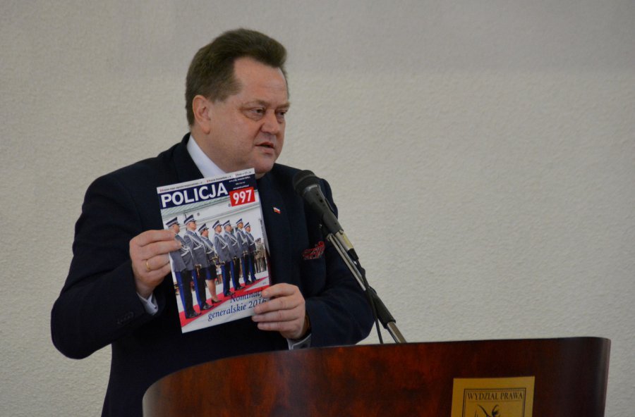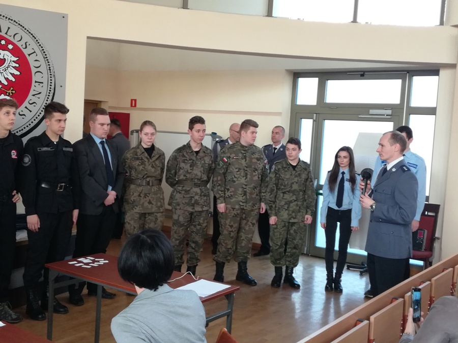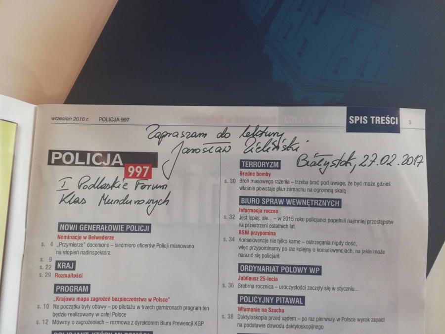 Sekretarz Stanu w Ministerstwie Spraw Wewnętrznych i Administracji Pan Jarosław Zieliński zainaugurował Forum Klas Mundurowych Województwa Podlaskiego 2017, które odbyło się w poniedziałek 27 lutego w auli Wydziału Prawa Uniwersytetu w Białymstoku. Pan Jarosław Zieliński w swoim przemówieniu zwrócił się do zgromadzonej na auli, liczącej ponad 400 uczniów publiczności z klas mundurowych, podkreślając rolę młodego pokolenia w upowszechnianiu szacunku do munduru już od najmłodszych lat, budowaniu etosu służby oraz tworzeniu symboliki jaką niesie mundur i służba drugiemu człowiekowi, a także całemu społeczeństwu. Wręczył również pamiątkowy, podpisany przez siebie egzemplarz miesięcznika "Policja" jednej z osób zgromadzonych na sali – okazała się nią być uczennica Martyna Kosińska z klasy 3AP.