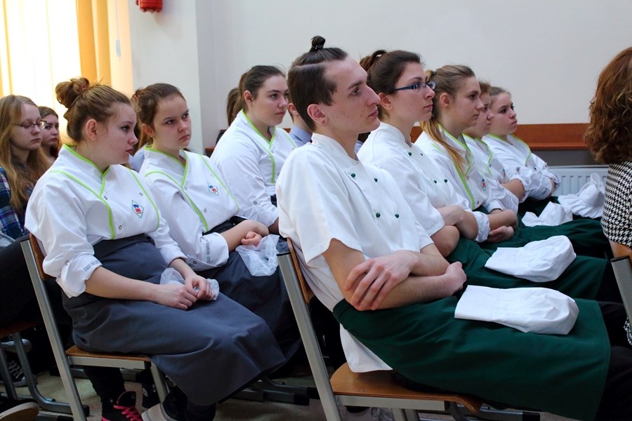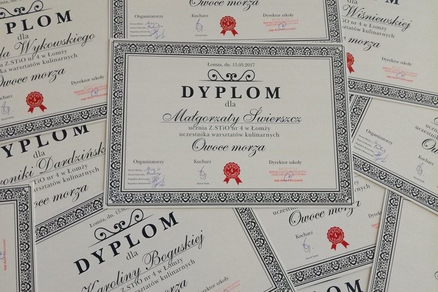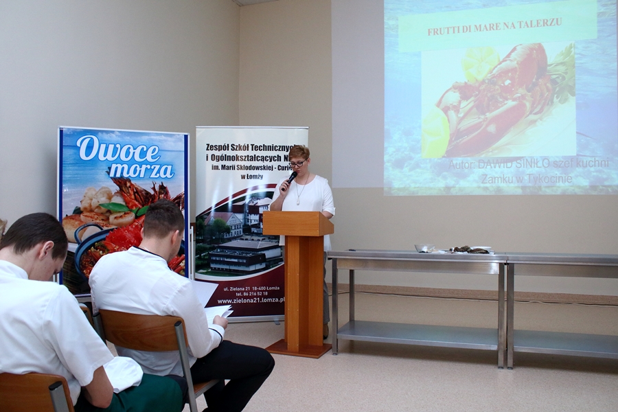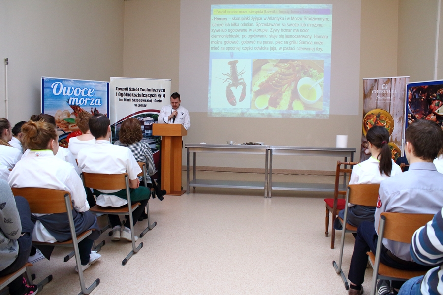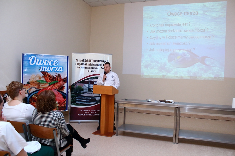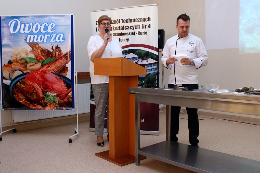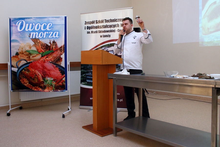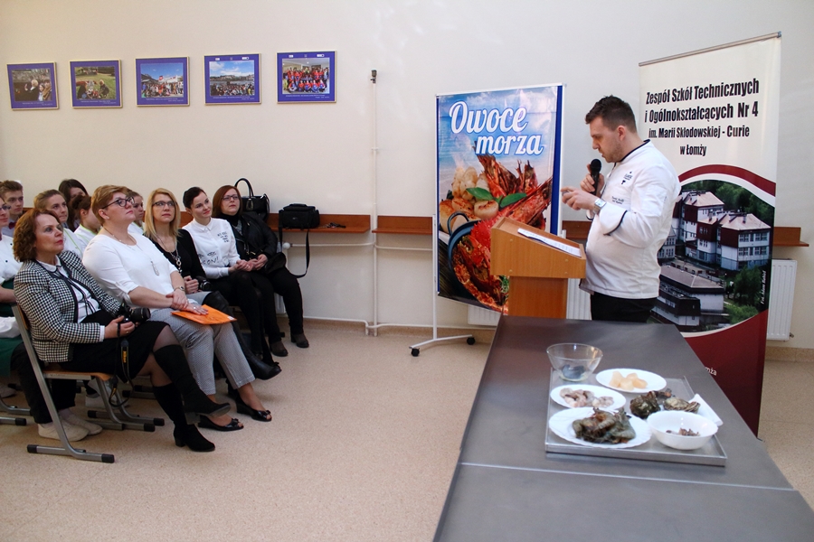 Panel szkoleniowy "Frutti di Mare" to kolejna, po cyklu warsztatów poświęconych wieprzowinie, wołowinie i drobiu, okazja dla uczniów, by w praktyce zdobywać umiejętności kulinarne i uczyć się od najlepszych. Zakup surowców użytych podczas warsztatów został dofinansowany ze środków Urzędu Miejskiego w Łomży w ramach realizowanego w szkole projektu, którego celem jest profilaktyka i edukacja zdrowotna.