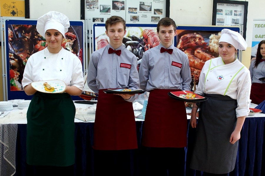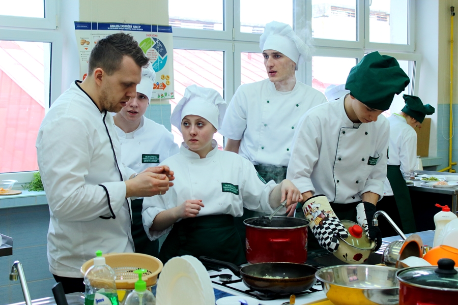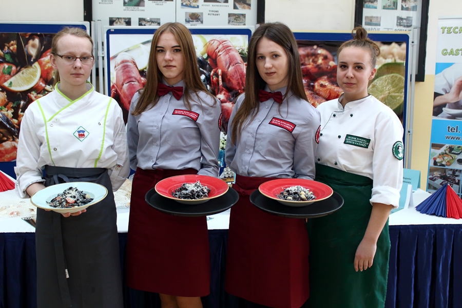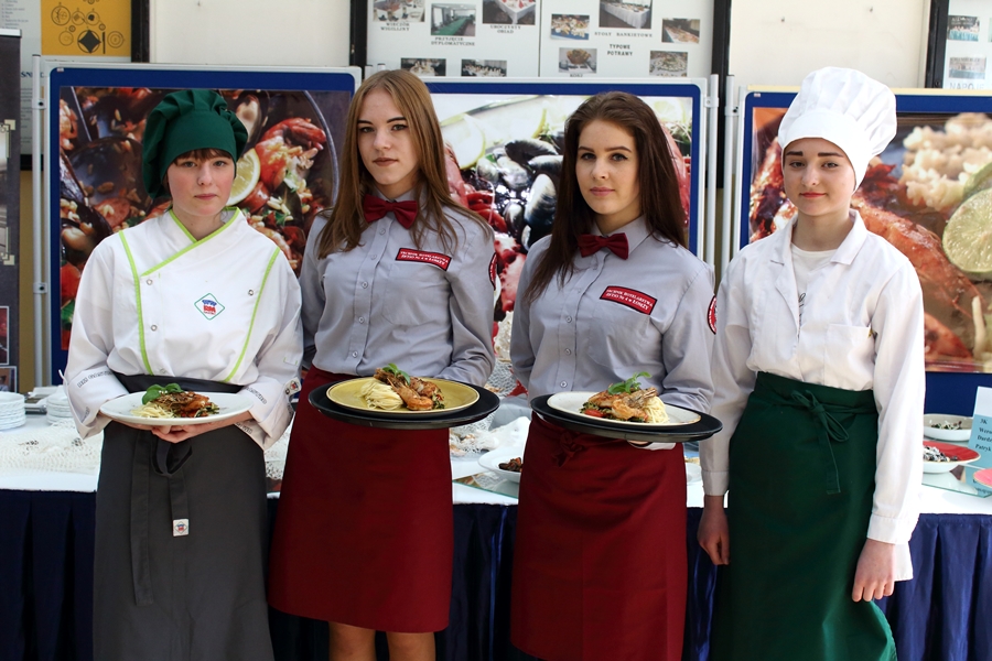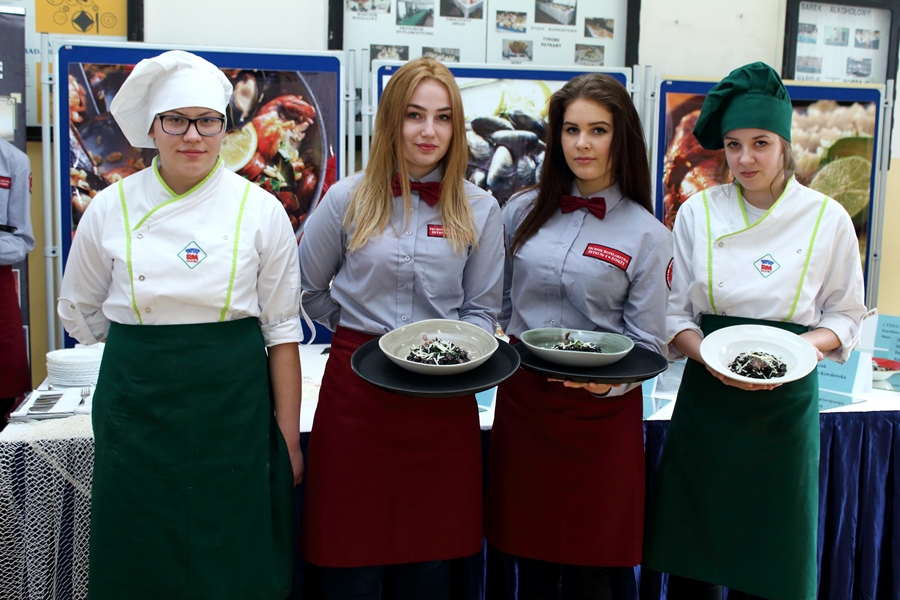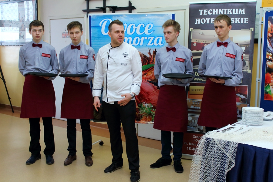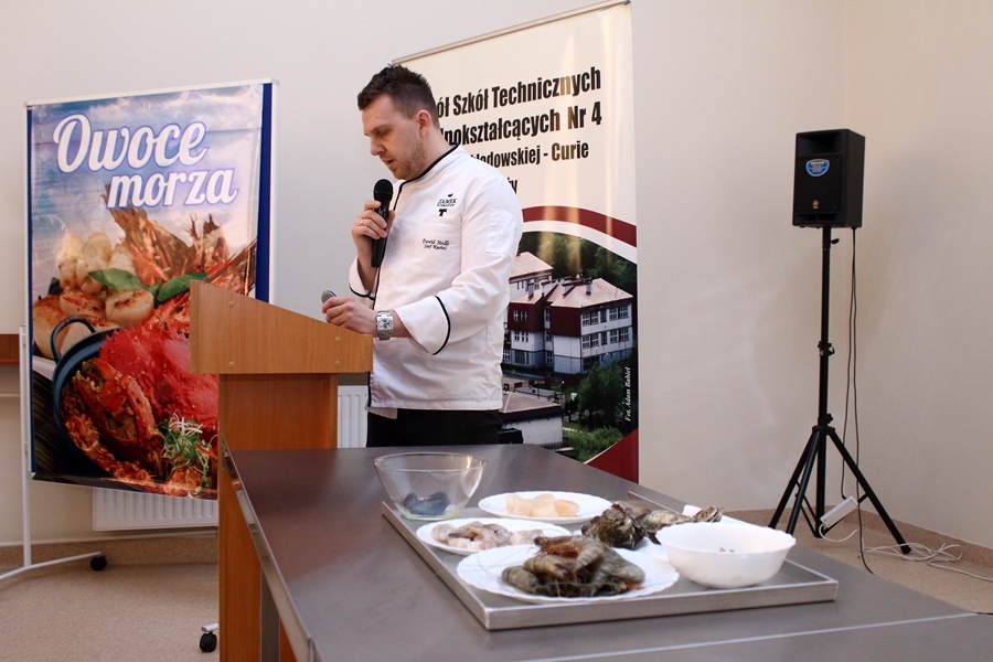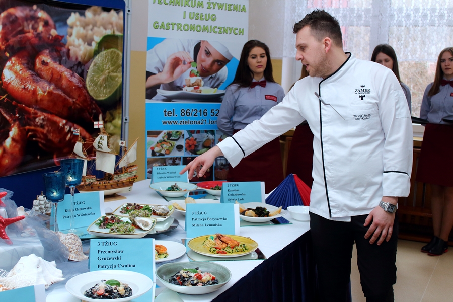 Prezentacją "Frutti di Mare na talerzu" rozpoczął się panel szkoleniowy dla uczniów klas żywieniowych i hotelarskich w naszej szkole poprowadzony przez Dawida Siniło, szefa kuchni restauracji na Zamku w Tykocinie, który zaprezentował gamę owoców morza oraz sposoby oceny ich świeżości i techniki obróbki termicznej. Następnie dwie grupy uczniów z Technikum Żywienia i Usług Gastronomicznych uczestniczyły w warsztatach kulinarnych, w trakcie których pod okiem mistrza uczyli się przygotowywać wykwintne dania z owoców morza, takie jak: rissotto z sepią, ośmiornicą i krewetkami, mule w sosie pomidorowym z białym winem, krewetki z cukinią truflową i capellini, muszle św. Jakuba w sosie musztardowym z puree z dyni i imbiru, czarny makaron z owocami morza, tatar z krewetek czy carpaccio z ośmiornicy.