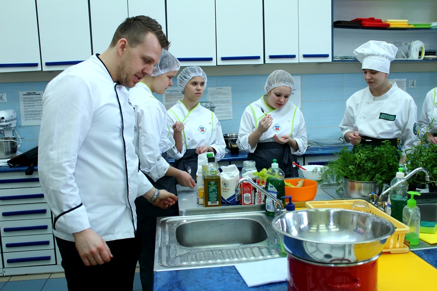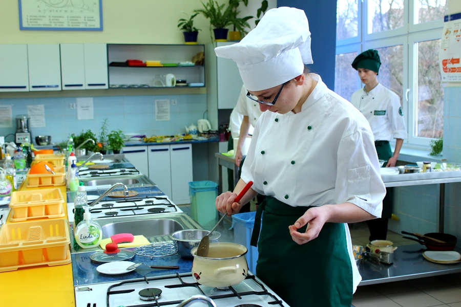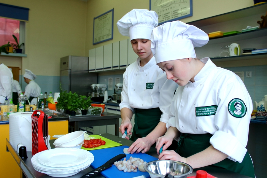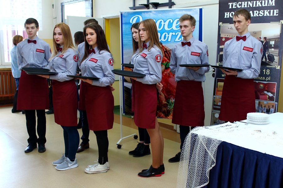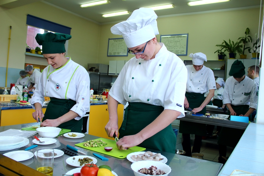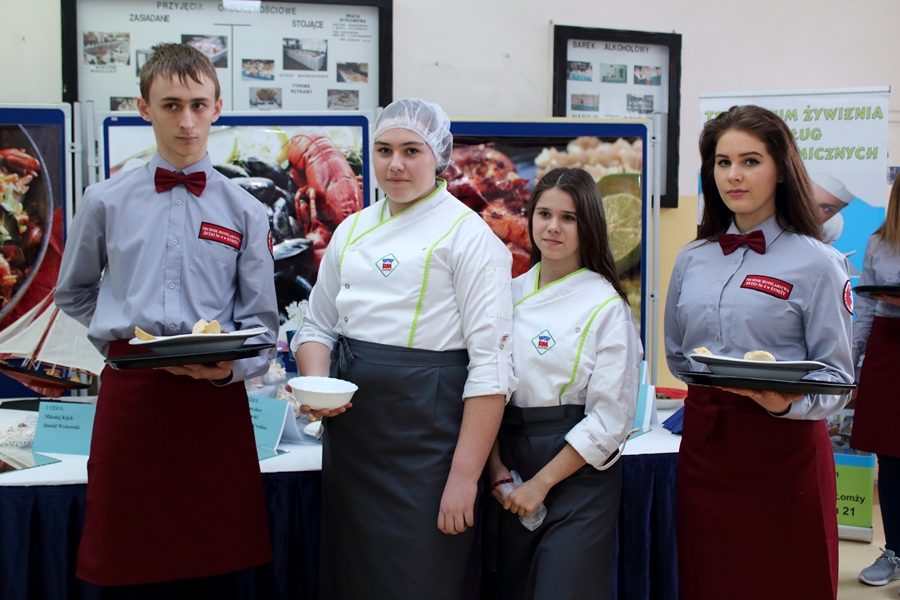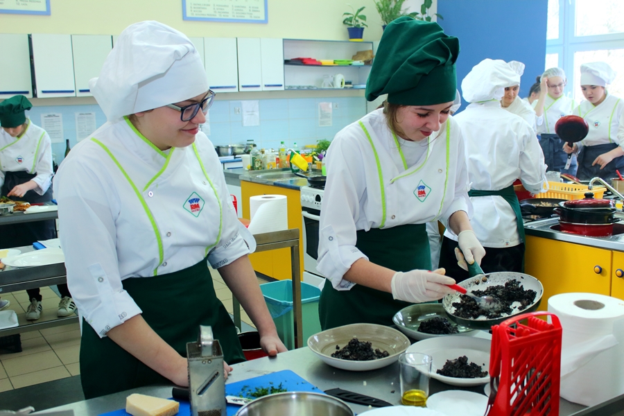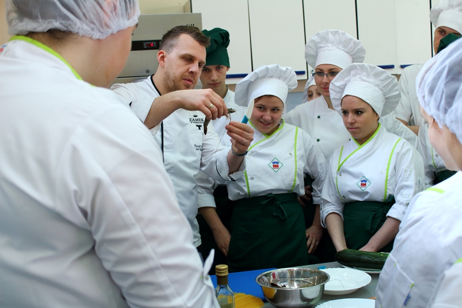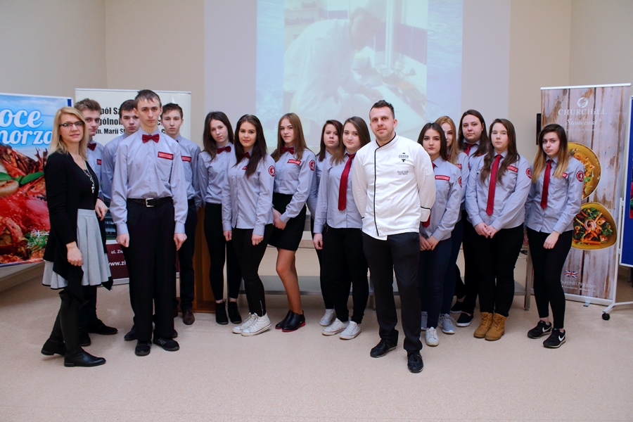 Prezentacją "Frutti di Mare na talerzu" rozpoczął się panel szkoleniowy dla uczniów klas żywieniowych i hotelarskich w naszej szkole poprowadzony przez Dawida Siniło, szefa kuchni restauracji na Zamku w Tykocinie, który zaprezentował gamę owoców morza oraz sposoby oceny ich świeżości i techniki obróbki termicznej. Następnie dwie grupy uczniów z Technikum Żywienia i Usług Gastronomicznych uczestniczyły w warsztatach kulinarnych, w trakcie których pod okiem mistrza uczyli się przygotowywać wykwintne dania z owoców morza, takie jak: rissotto z sepią, ośmiornicą i krewetkami, mule w sosie pomidorowym z białym winem, krewetki z cukinią truflową i capellini, muszle św. Jakuba w sosie musztardowym z puree z dyni i imbiru, czarny makaron z owocami morza, tatar z krewetek czy carpaccio z ośmiornicy.