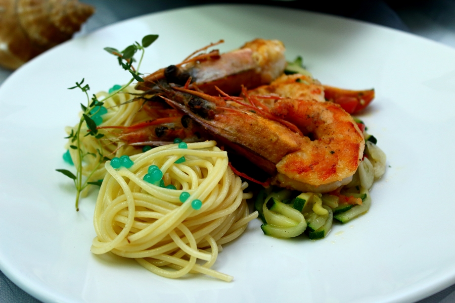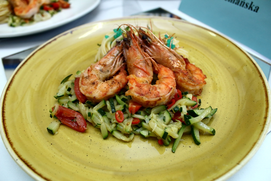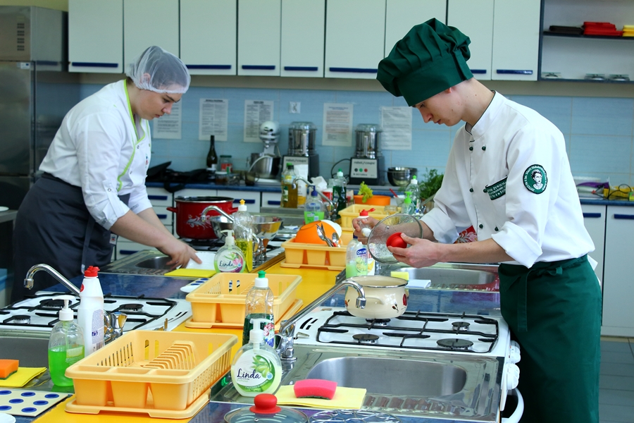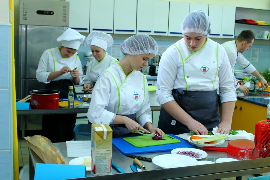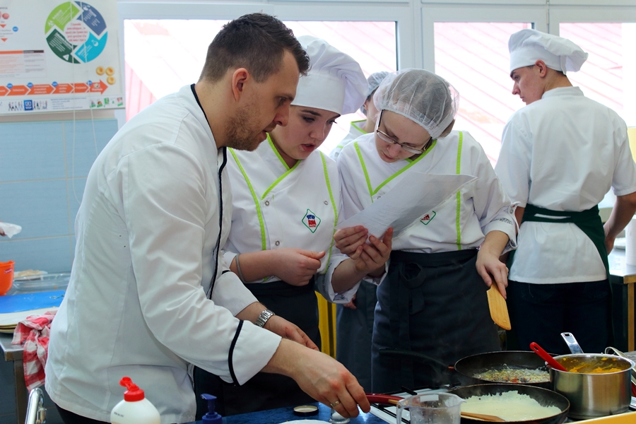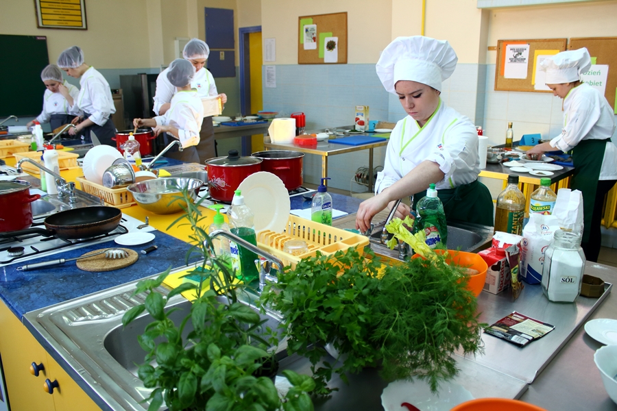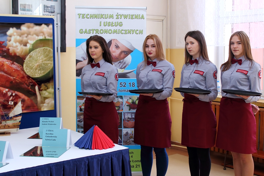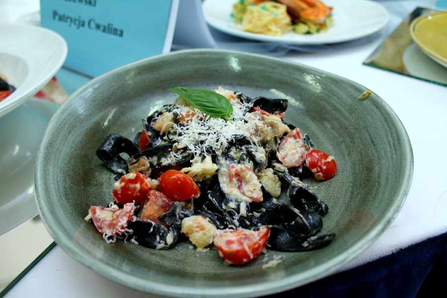 Prezentacją "Frutti di Mare na talerzu" rozpoczął się panel szkoleniowy dla uczniów klas żywieniowych i hotelarskich w naszej szkole poprowadzony przez Dawida Siniło, szefa kuchni restauracji na Zamku w Tykocinie, który zaprezentował gamę owoców morza oraz sposoby oceny ich świeżości i techniki obróbki termicznej. Następnie dwie grupy uczniów z Technikum Żywienia i Usług Gastronomicznych uczestniczyły w warsztatach kulinarnych, w trakcie których pod okiem mistrza uczyli się przygotowywać wykwintne dania z owoców morza, takie jak: rissotto z sepią, ośmiornicą i krewetkami, mule w sosie pomidorowym z białym winem, krewetki z cukinią truflową i capellini, muszle św. Jakuba w sosie musztardowym z puree z dyni i imbiru, czarny makaron z owocami morza, tatar z krewetek czy carpaccio z ośmiornicy.