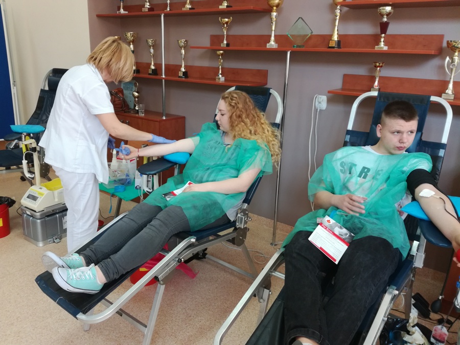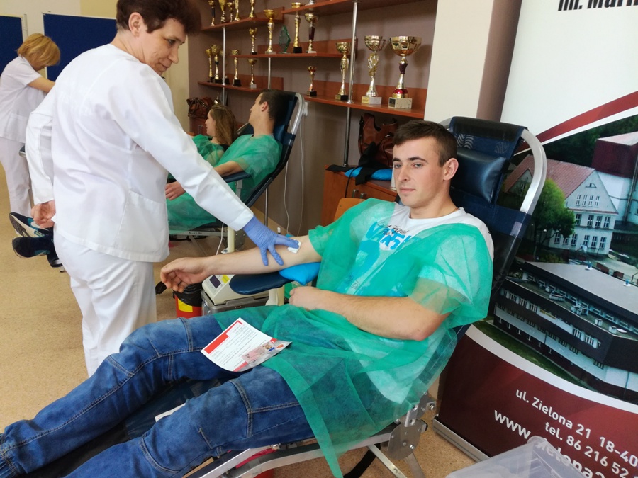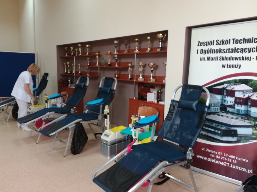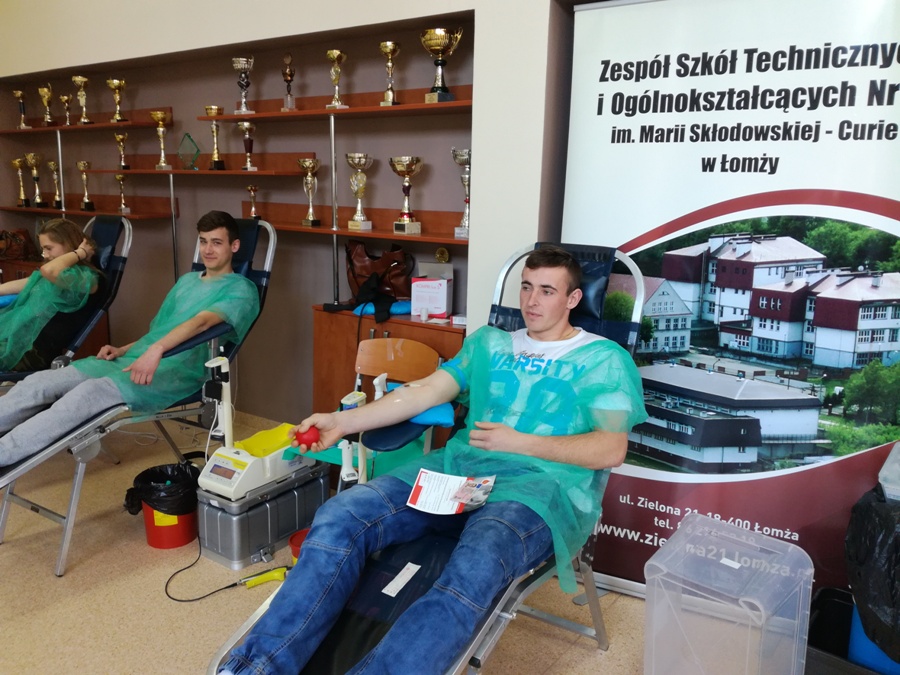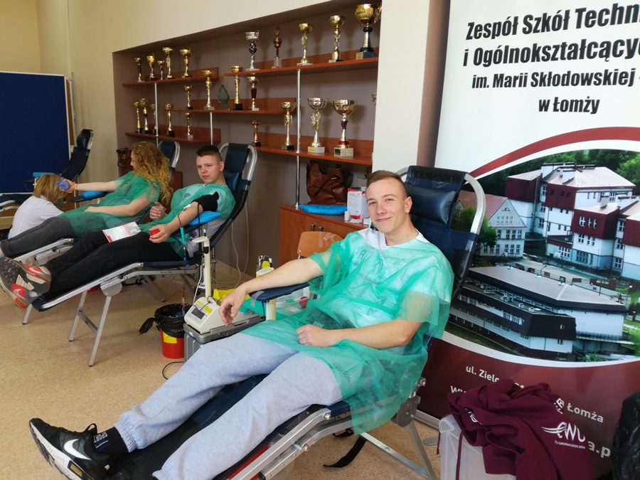 Krwiodawstwo - ruch ludzi takich jak Ty4 kwietnia w naszej szkole została przeprowadzona akcja honorowego oddawania krwi. Została ona poprzedzona promocją krwiodawstwa i spotkała się z wielkim zainteresowaniem uczniów. Mogli do niej przystąpić wyłącznie uczniowie pełnoletni. Zgłosiło się 46 chętnych, z czego w wyniku rekrutacji zakwalifikowano 40 osób. Procedura oddawania krwi jest bardzo restrykcyjna lecz ochotnicy cierpliwie i z wielkim zaangażowaniem poddawali się jej wymogom wiedząc, że ratują komuś zdrowie a nawet życie. W sumie uczestnicy akcji oddali 18 litrów krwi i prawie wszyscy zadeklarowali swój udział w kolejnej edycji, która zaplanowana jest na czerwiec. Świadomość i dojrzała postawa naszych młodych krwiodawców jest doskonałym dowodem na wrażliwość społeczną oraz bezinteresowność młodych ludzi i zasługuje na najwyższy szacunek. Akcję przeprowadził zespół medyczny Terenowego Oddziału Regionalnego Centrum Krwiodawstwa i Krwiolecznictwa w Łomży we współpracy z B. Romanowską i J. Chojnowską