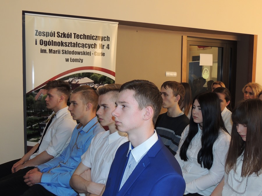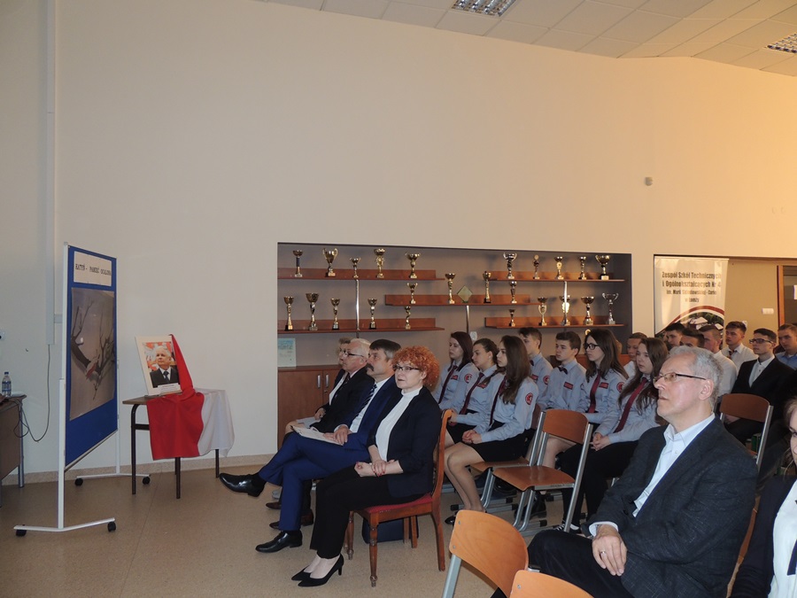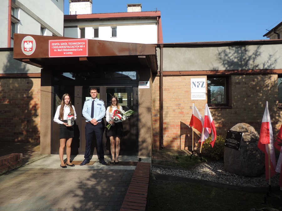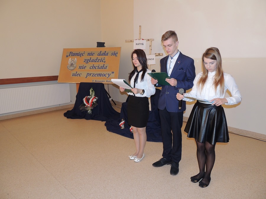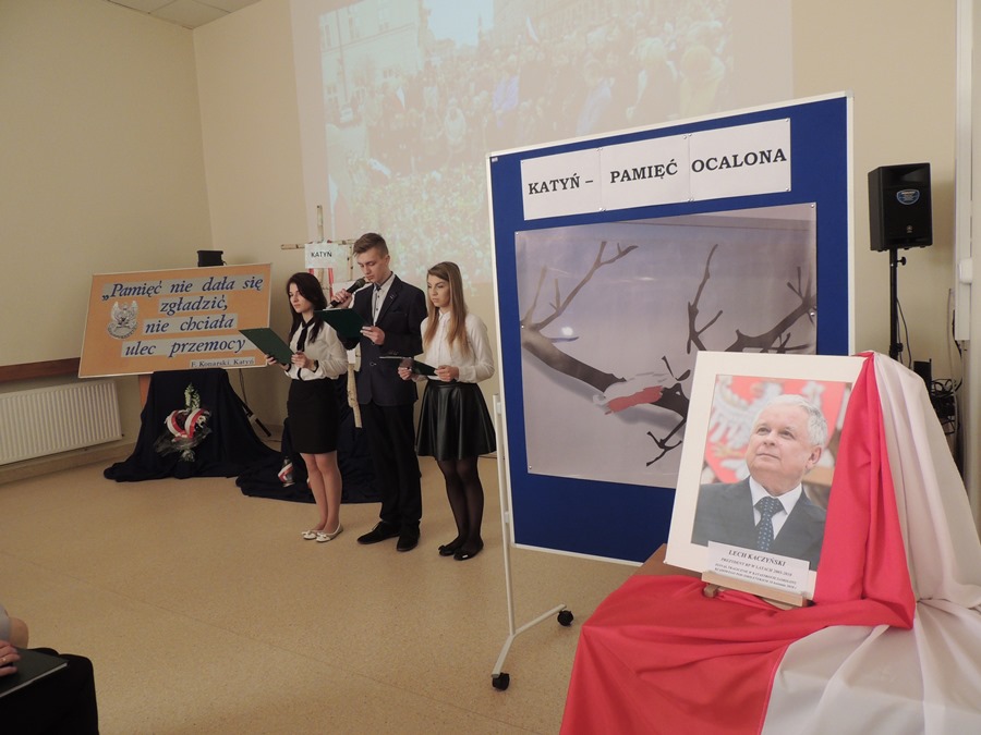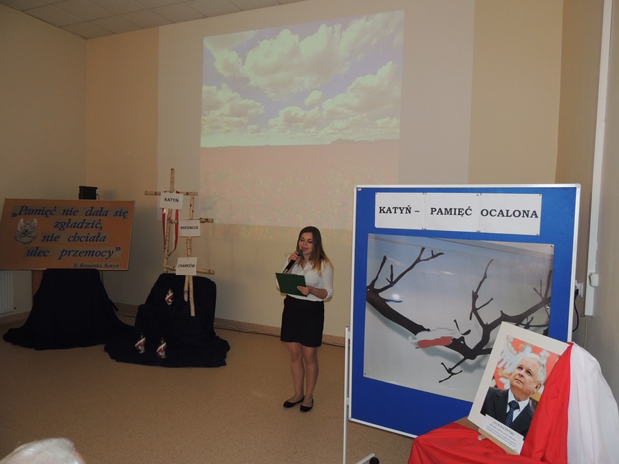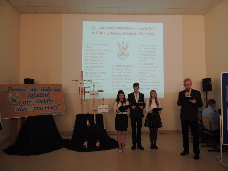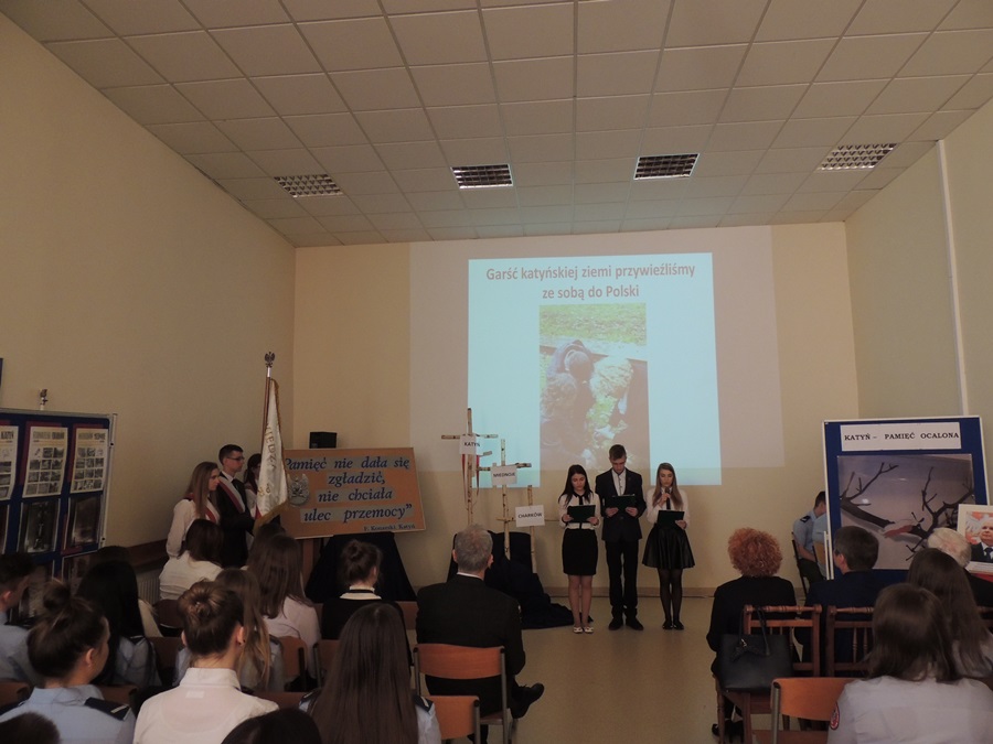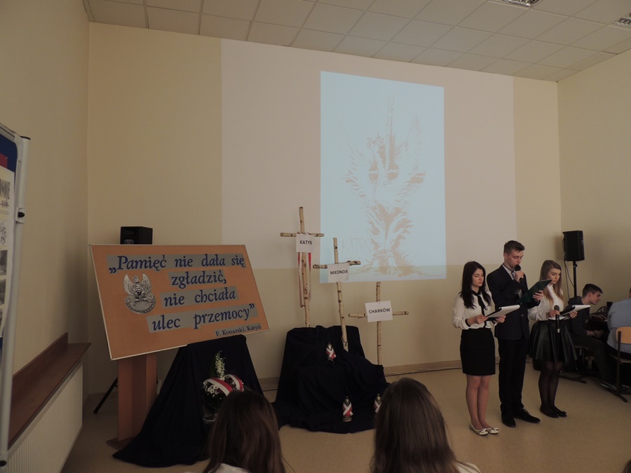 W szkolnej auli uczniowie zaprezentowali widowisko historyczno-poetyckie związane z kolejną rocznicą zbrodni katyńskiej. Pozwoliło to przybliżyć młodzieży tło historyczne i cały ogrom tej zbrodni. Wypowiedzi uczniów przeplatane były video - klipami wybranych utworów Kaczmarskiego, Makowieckiego oraz utworami poetyckimi Herberta, Konarskiego, Wierzyńskiego w ekspresyjnym wykonaniu: Elizy Niedźwiedzkiej i Agnieszki Siwik. Słuchaczy poruszyła piosenka „Jest takie miejsce” w nostalgicznej interpretacji Ewy Skowronek . Ważnym elementem uroczystości było złożenie wiązanki biało-czerwonych kwiatów i zapalenie zniczy w szkolnym miejscu pamięci upamiętniającym łomżyńskie ofiary Katynia.