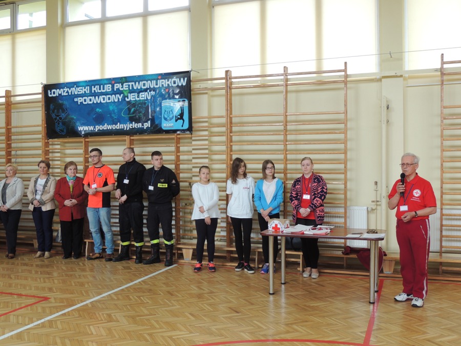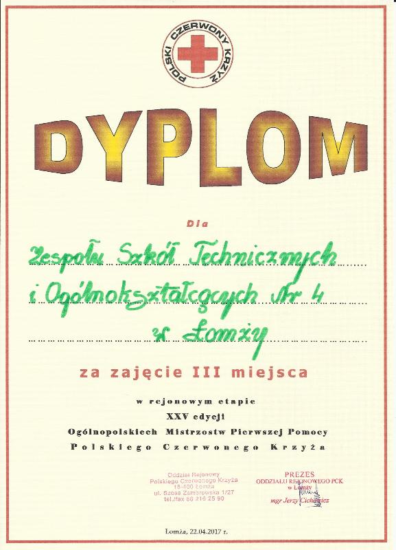 III miejsce w Rejonowych Mistrzostwach Pierwszej Pomocy PCKDnia 22 kwietnia 2017 r. w Łomży odbyły się Rejonowe Mistrzostwa Pierwszej Pomocy Polskiego Czerwonego Krzyża. Ich celem jest podniesienie poziomu wiedzy młodzieży z zakresu udzielania pierwszej pomocy oraz przeciwdziałanie występowaniu wypadków poprzez upowszechnianie zasad bezpieczeństwa. III miejsce dla ZSTiO Nr 4 w Łomży zdobyła drużyna w składzie: Dominik Wesołowski klasa 1PP - kapitan drużyny, Natalia Rogowska – 2TŻiUG, Norbert Sobociński - 2TŻiUG, Eliza Niedźwiecka – 1TŻiUG, Maciej Korytkowski – 1AP. Uczniowie przygotowali się do startu w mistrzostwach pod kierunkiem p. Bogusławy Romanowskiej nauczyciela Edukacji dla Bezpieczeństwa. Przebieg zawodów: Mistrzostwa składają się z części teoretycznej w postaci testu oraz części praktycznej. Część teoretyczna to zestaw pytań dotyczących wiedzy z zakresu pierwszej pomocy oraz międzynarodowego prawa humanitarnego i wiedzy o Ruchu. Część praktyczna składa się z szeregu scenek - specjalnie zaaranżowanych na potrzeby mistrzostw. Pozorowane wypadki przygotowywane są przy użyciu profesjonalnych środków (sztuczna krew, pudry, farby charakteryzacyjne itd.) oraz rekwizytów. W ich trakcie zawodnicy mają za zadanie wykonać czynności ratownicze.