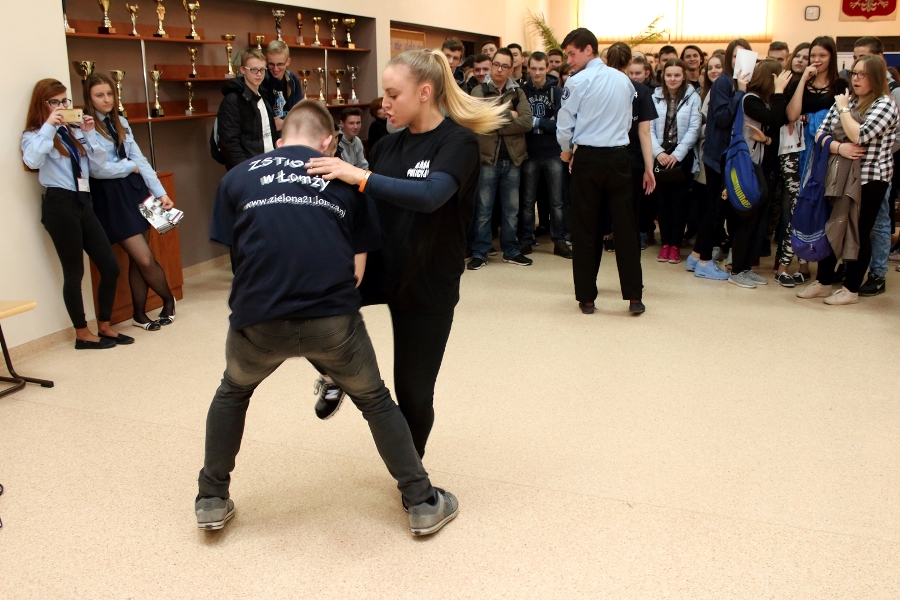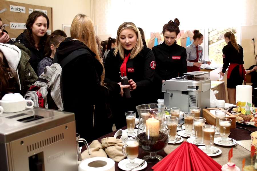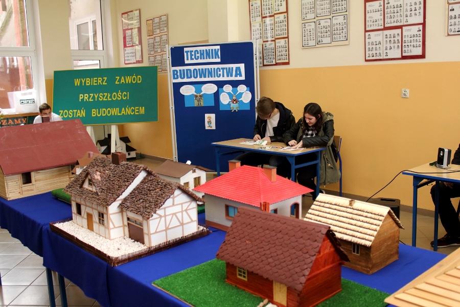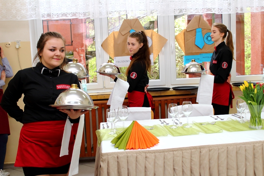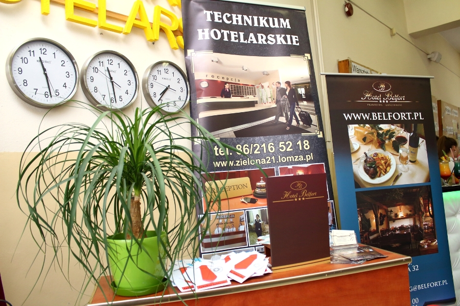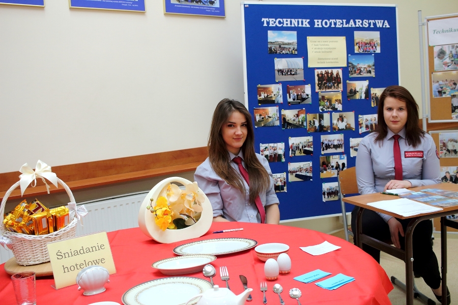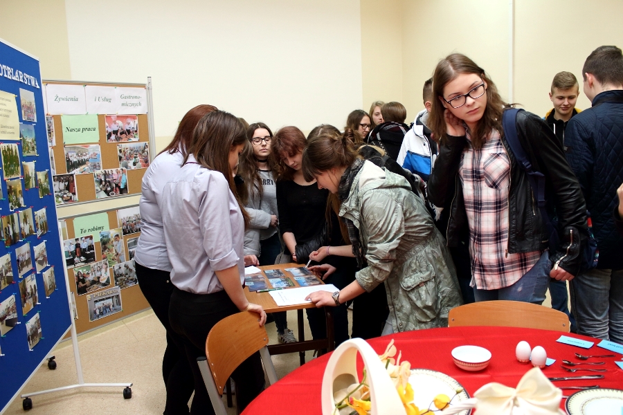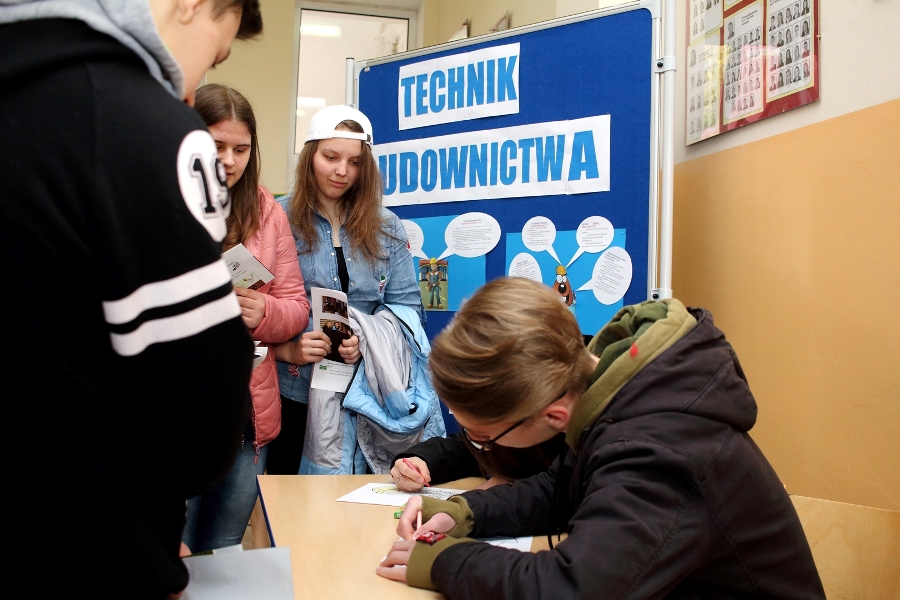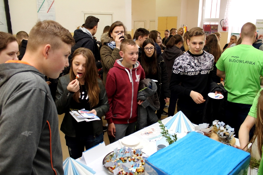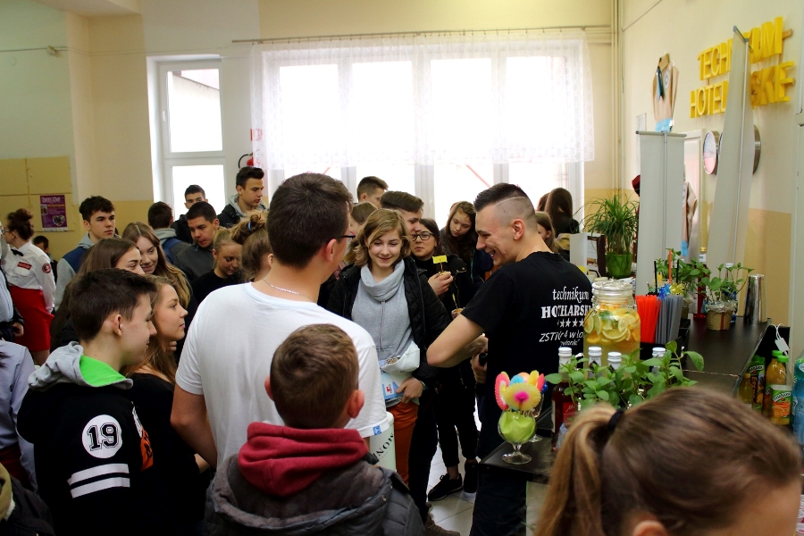W dniu 26 kwietnia 2017 r. w ZSTiO Nr 4 w Łomży zorganizowano Dzień Otwarty. Celem przedsięwzięcia była prezentacja bogatego dorobku szkoły oraz przybliżenie gimnazjalistom aktualnej oferty edukacyjnej, zasad funkcjonowania naszej placówki, jej infrastruktury oraz planów na kolejny rok szkolny. Staraliśmy się ukazać szereg działań, które podejmujemy w codziennej pracy dydaktyczno – opiekuńczo – wychowawczej. Dzień Otwarty był okazją do spotkania z nauczycielami uczącymi poszczególnych przedmiotów, do pokazania panującego w szkole klimatu życzliwości, otwartości i akceptacji. Gości powitano w szkolnej auli, podano informacje o kierunkach kształcenia oraz zapoznano z programem Dnia Otwartego. Jego pierwszym punktem był pokaz sztuk walki oraz inscenizacja scenki obrazującej specyfikę pracy w policji w wykonaniu uczniów klas o profilu policyjnym. Dla gimnazjalistów przygotowano też konkurs leksykalny języka angielskiego i quiz: „Najważniejsze informacje o Wielkiej Brytanii i jej najciekawsze miejsca”. W szkolnej auli gimnazjaliści zwiedzali stoiska: IV Liceum Ogólnokształcącego, Technikum Hotelarskiego oraz ekspozycję militariów przygotowaną przez Strzelców Związku Strzeleckiego "STRZELEC" Jednostka Strzelecka 1012 im. 33 Pułku Piechoty Ziemi Łomżyńskiej w składzie: Strz. Rafał Zakrzewski, Sekc. ZS Paulina Karolina Kozioł, Sekc. ZS Natalia Złotkowska, Sekc. ZS Patryk Bognacki, sek. zs. Patryk Tyl oraz nasz absolwent Sekc. ZS Mariusz Murawski. Następnie gościom zaproponowano poznanie oferty kształcenia w zawodzie technik budownictwa. Zaprezentowano makiety domów jednorodzinnych wykonane przez uczniów. Atrakcję tej części spotkania stanowił konkurs plastyczny na najlepiej wykonany rysunek stroju budowlańca z uwzględnieniem jego najważniejszych elementów oraz konkurs wiedzy ogólnobudowlanej z nagrodami od sponsorów: MPC Łomża, Domel , Alior Bank i Prefbet Śniadowo, który przygotował swoje stoisko z okazji Dnia Otwartego, dając gimnazjalistom sposobność poznania oferty firm współpracujących ze szkołą. Z kolei w pracowni praktycznej nauki zawodu odbył się pokaz murowania z materiałów Prefbetu Śniadowo w wykonaniu ucznia klasy pierwszej Grzegorza Kołdysza. Pokaz podobał się przede wszystkim gimnazjalistom zainteresowanym nauką w technikum budowlanym i zasadniczej szkole zawodowej.W dalszej części spotkania młodzież z branży hotelarskiej zaskoczyła przybyłych profesjonalnie przygotowaną prezentacją musztry kelnerskiej, obsługi klientów i gości w recepcji hotelu, sztuki baristycznej oraz pokazem barmańskim. Uczniowie przyrządzali i serwowali bezalkoholowe drinki oraz uczyli gimnazjalistów artystycznego składania ręczników hotelowych.Z kolei młodzież z Technikum Żywienia i Usług Gastronomicznych przygotowała dla gimnazjalistów prezentację „Kuchnie Świata”. Można było obserwować proces powstawania potraw kuchni polskiej , francuskiej (m.in. tarty na słono i na słodko), greckiej (m.in. baklawa, koreczki serowo - warzywne) i japońskiej ( m.in. sushi). Gości zaproszono także na degustację. Ostatni punkt programu stanowiła Memoriada przygotowana przez młodzież z liceum ogólnokształcącego o profilu psychopedagogicznym. Gimnazjaliści uczestniczyli w zajęciach, podczas których wykonywali ćwiczenia doskonalące pamięć, spostrzegawczość i koncentrację uwagi. Wszyscy uczestnicy zajęć otrzymali pamiątkowe dyplomy. Gimnazjaliści zapoznali się z osiągnięciami uczniów liceum, technikum i z s z. Frekwencja dopisała, goście przybyli bardzo licznie. Wśród odwiedzających byli m.in. uczniowie z Gimnazjum nr 1, 8, 9, a także Nowogrodu, Piątnicy i Zbójnej wraz z opiekunami. Mamy nadzieję, że główne założenie naszego przedsięwzięcia spełniło oczekiwania przybyłych i z wieloma z nich spotkamy się w nowym roku szkolnym. Wszystkim biorącym udział w Dniu Otwartym ZSTiO Nr 4 w Łomży bardzo dziękujemy.