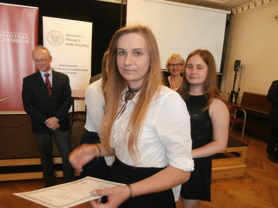 2 czerwca 2017 roku w Poznaniu odbył się finał Ogólnopolskiego Konkursu „Bóg, Honor i Ojczyzna -wartości polskiego ziemiaństwa ”, w którym zmierzyło się 82 uczniów ze szkół gimnazjalnych oraz ponadgimnazjalnych z całej Polski. Finalistkami w kategorii pracy multimedialnej zostały uczennice naszej szkoły : Justyna Gardocka, Agnieszka Siwik i Kinga Ostrowska, które zaprezentowały pracę „Bóg, Honor i Ojczyzna - świat wartości i losy rodziny Jabłońskich z Pniewa w XX wieku”. Ich opiekunem naukowym była pani Elżbieta Wiśniewska.