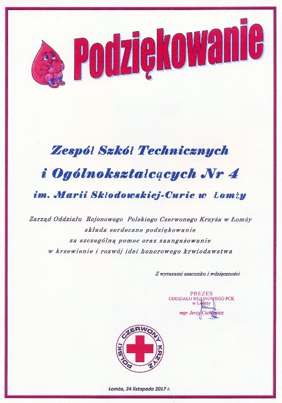 Z rąk Prezesa Oddziału Rejonowego Polskiego Czerwonego Krzyża w Łomży Pana Jerzego Cichowicza otrzymaliśmy „serdeczne podziękowanie za szczególną pomoc oraz zaangażowanie w krzewienie i rozwój idei honorowego krwiodawstwa”.