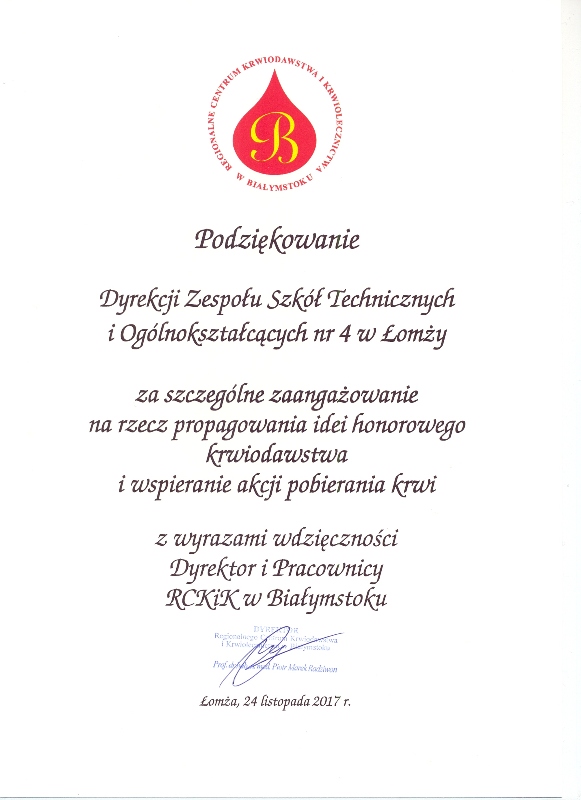 Podczas uroczystości Dyrektor Szkoły Pan Artur Ciborowski, odebrał pamiątkową statuetkę z podziękowaniem „za szczególne zaangażowanie na rzecz propagowania idei honorowego krwiodawstwa i wspierania akcji pobierania krwi”. Dyrektor Regionalnego Centrum Krwiodawstwa i Krwiolecznictwa w Białymstoku Pani Anna Lisowska podziękowała całej społeczności szkolnej ZSTiO Nr 4 za organizację akcji poboru krwi i propagowanie idei honorowego krwiodawstwa.