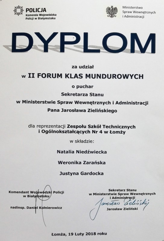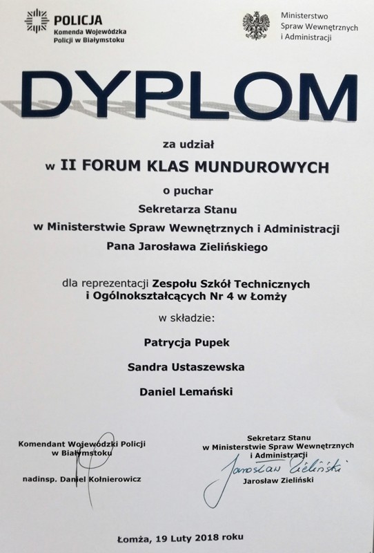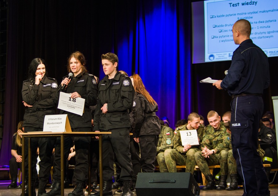 W poniedziałek 19 lutego uczniowie z klas 1ap/pp, 2ap/pp, 3ap/pp oraz 2ah wzięli udział w II Forum Klas Mundurowych Województwa Podlaskiego 2018, które odbyło się w siedzibie Katolickiego Centrum Informacji Europejskiej w Łomży. Forum zorganizowane zostało przez Komendę Wojewódzką Policji w Białymstoku we współpracy z Kuratorium Oświaty w Białymstoku, w ramach wojewódzkiego programu profilaktycznego „Mam wybór... wybieram rozsądek".