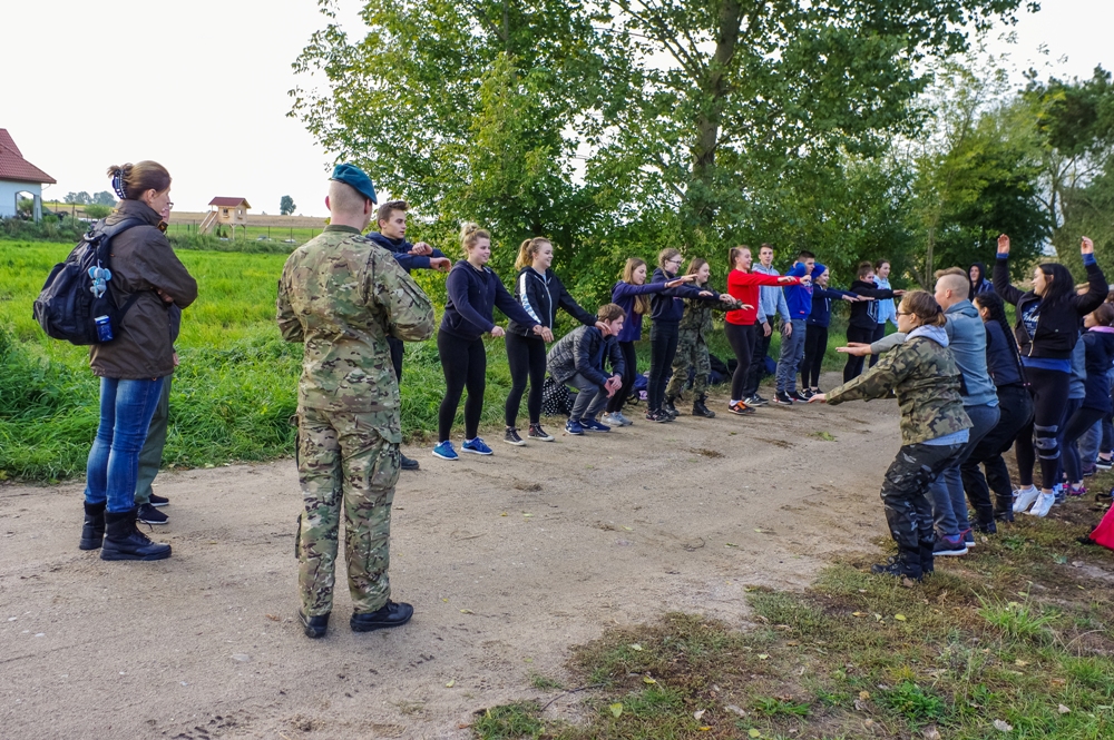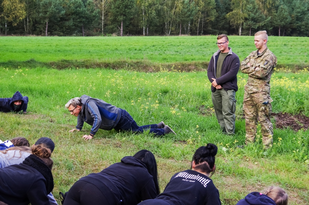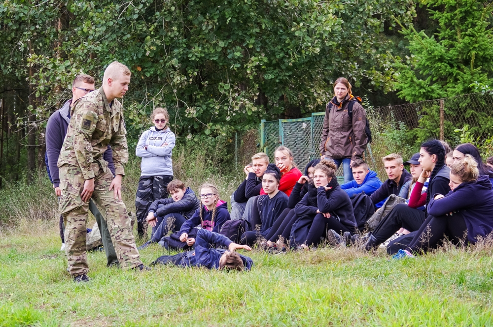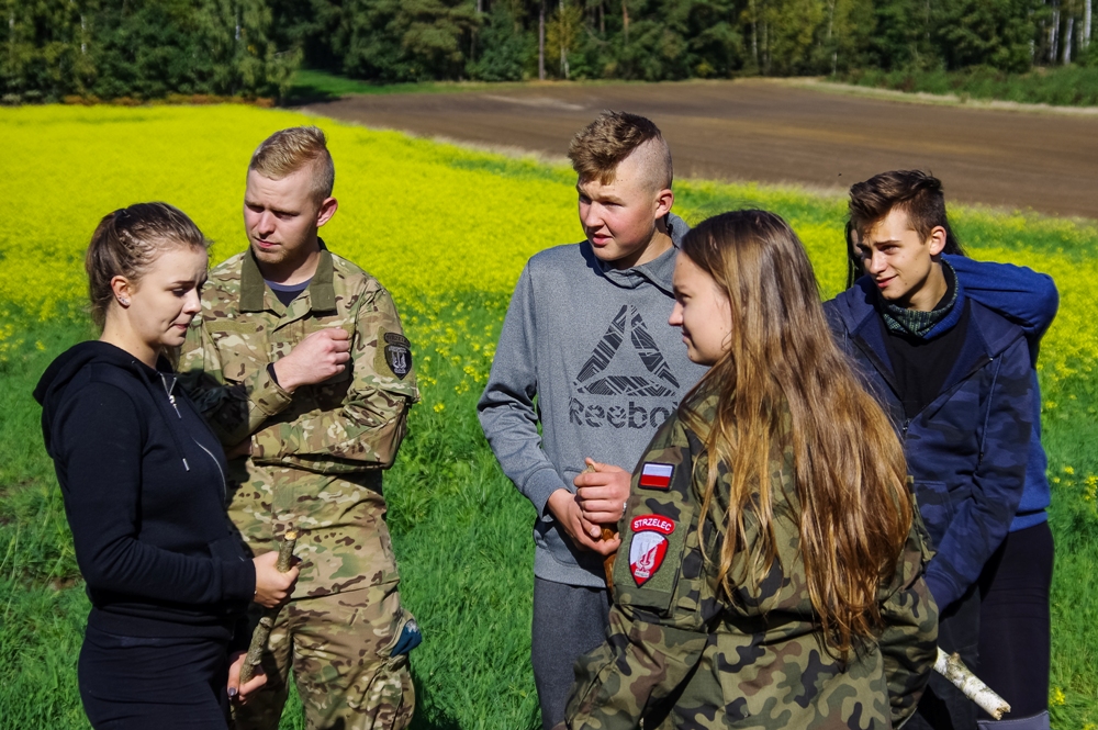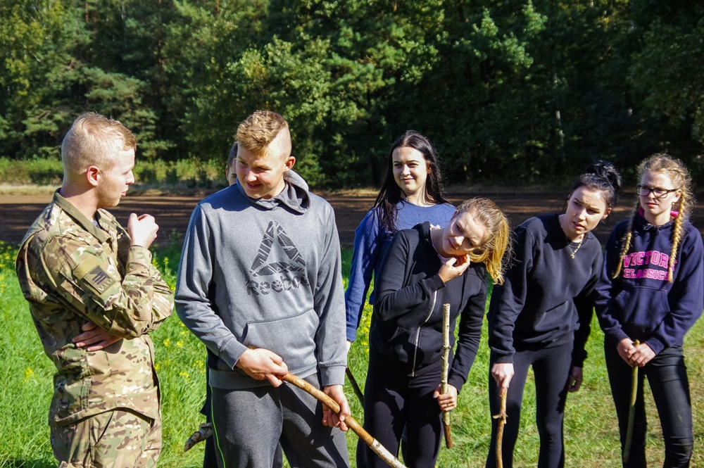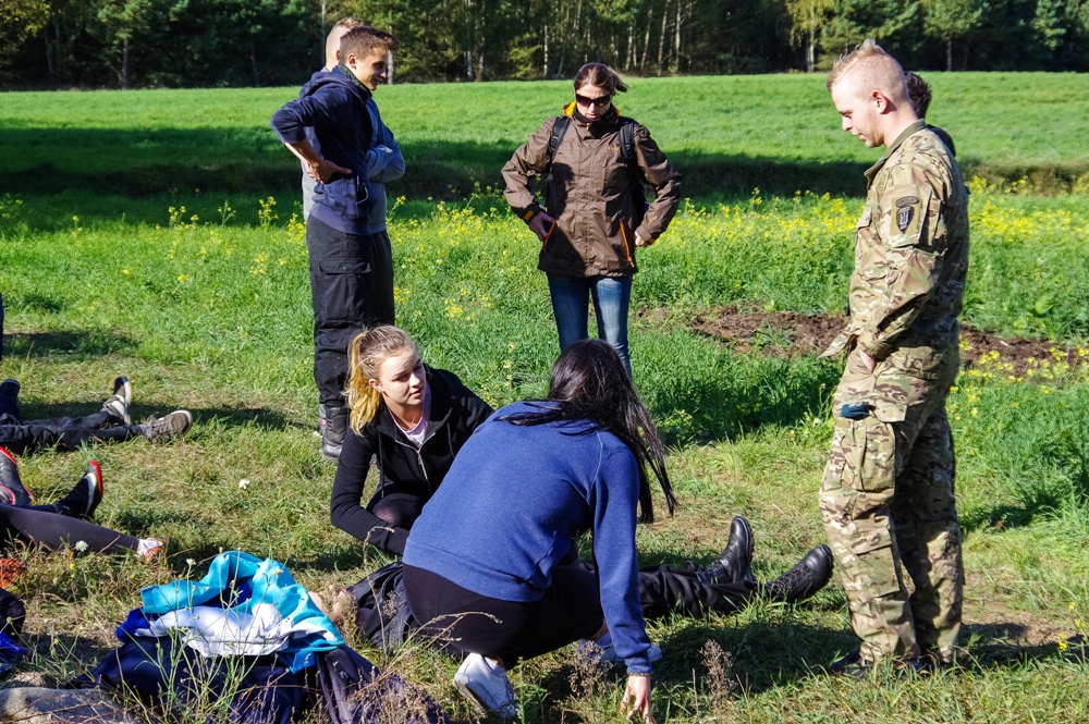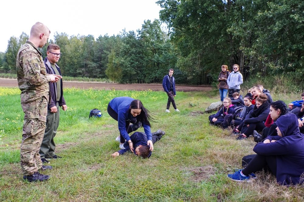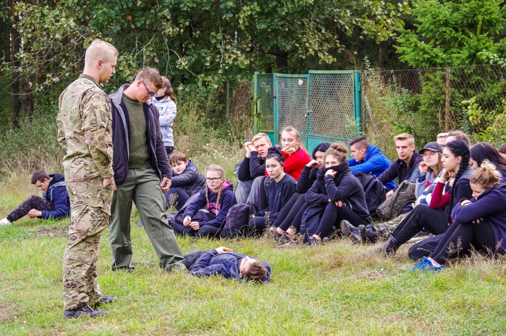 Uczniowie klas policyjnych po raz kolejny uczestniczyli w zajęciach terenowych ze Strzelcami ze Związku Strzeleckiego "Strzelec" Jednostka Strzelecka 1012 im. 33 Pułku Piechoty Ziemi Łomżyńskiej. Trening odbył się na terenie Ośrodka Szkolenia Taktycznego w Szczepankowie. Tradycyjnie, uczniowie rozpoczęli zajęcia od wojskowej rozgrzewki, podczas której na rozkaz „dowódcy” oprócz skakania i biegania wykonywali dość wyczerpujące pompki, scyzoryki i przysiady. Kolejnym etapem zajęć był instruktaż pierwszej pomocy przedmedycznej, po którym młodzież wcielając się w role poszkodowanych, dyspozytorów oraz osób udzielających pomocy ćwiczyła poprawne wykonywanie czynności ratowniczych. Następny punkt szkolenia to zabawa w podchody. Uczniowie podzielili się na dwie grupy. Zadaniem pierwszej było oddalenie się od ośrodka i znalezienie odpowiedniego miejsca do przygotowania obozowiska. Celem drugiej ciche podejście i zdobycie obozowiska „wroga”. Zabawa zakończyła się zasłużoną kiełbaską z ogniska.