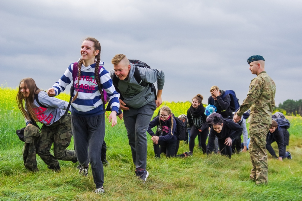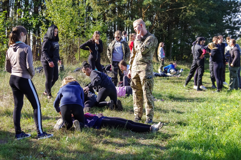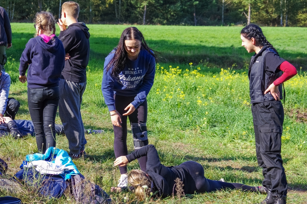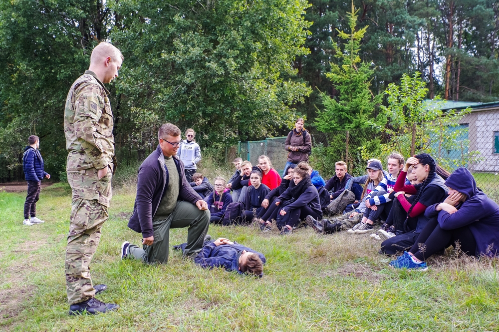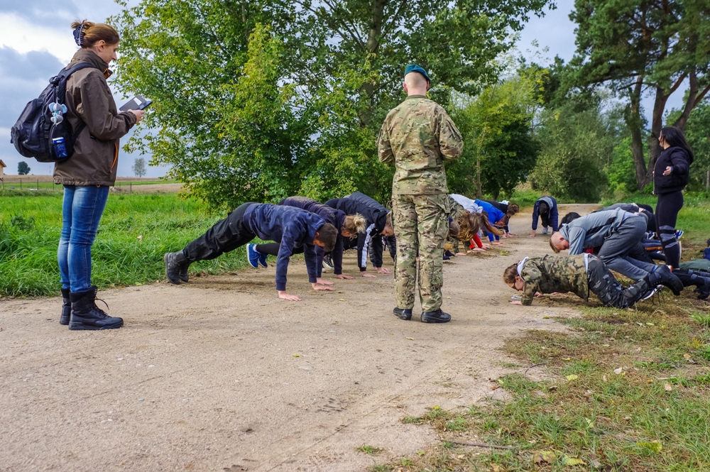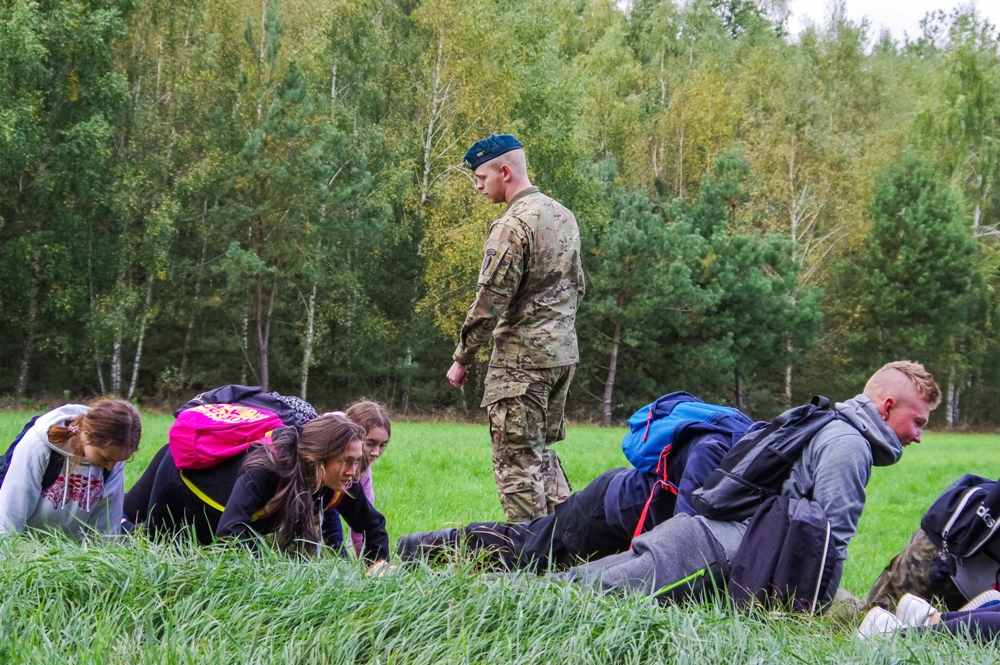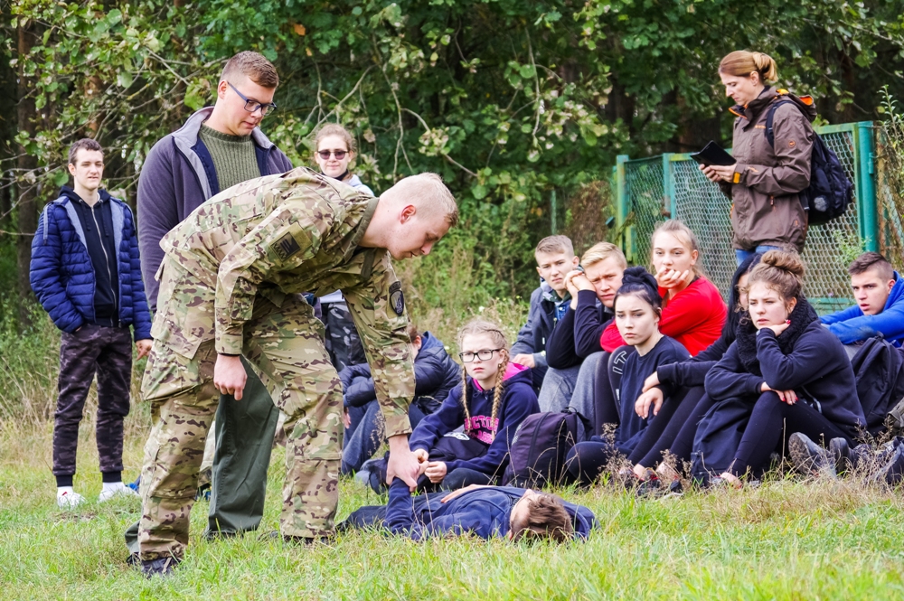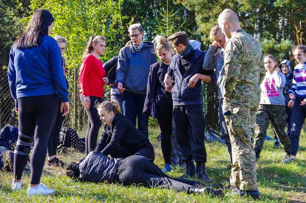 Uczniowie klas policyjnych po raz kolejny uczestniczyli w zajęciach terenowych ze Strzelcami ze Związku Strzeleckiego "Strzelec" Jednostka Strzelecka 1012 im. 33 Pułku Piechoty Ziemi Łomżyńskiej. Trening odbył się na terenie Ośrodka Szkolenia Taktycznego w Szczepankowie. Tradycyjnie, uczniowie rozpoczęli zajęcia od wojskowej rozgrzewki, podczas której na rozkaz „dowódcy” oprócz skakania i biegania wykonywali dość wyczerpujące pompki, scyzoryki i przysiady. Kolejnym etapem zajęć był instruktaż pierwszej pomocy przedmedycznej, po którym młodzież wcielając się w role poszkodowanych, dyspozytorów oraz osób udzielających pomocy ćwiczyła poprawne wykonywanie czynności ratowniczych. Następny punkt szkolenia to zabawa w podchody. Uczniowie podzielili się na dwie grupy. Zadaniem pierwszej było oddalenie się od ośrodka i znalezienie odpowiedniego miejsca do przygotowania obozowiska. Celem drugiej ciche podejście i zdobycie obozowiska „wroga”. Zabawa zakończyła się zasłużoną kiełbaską z ogniska.