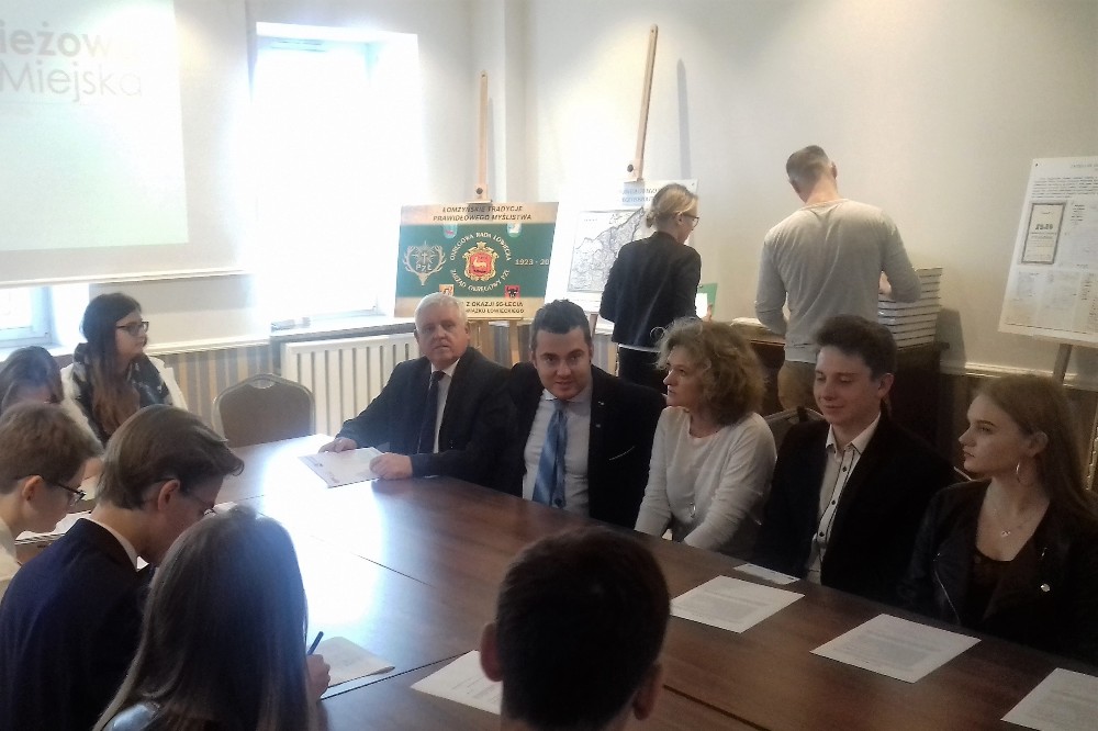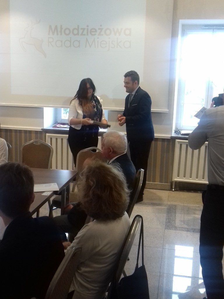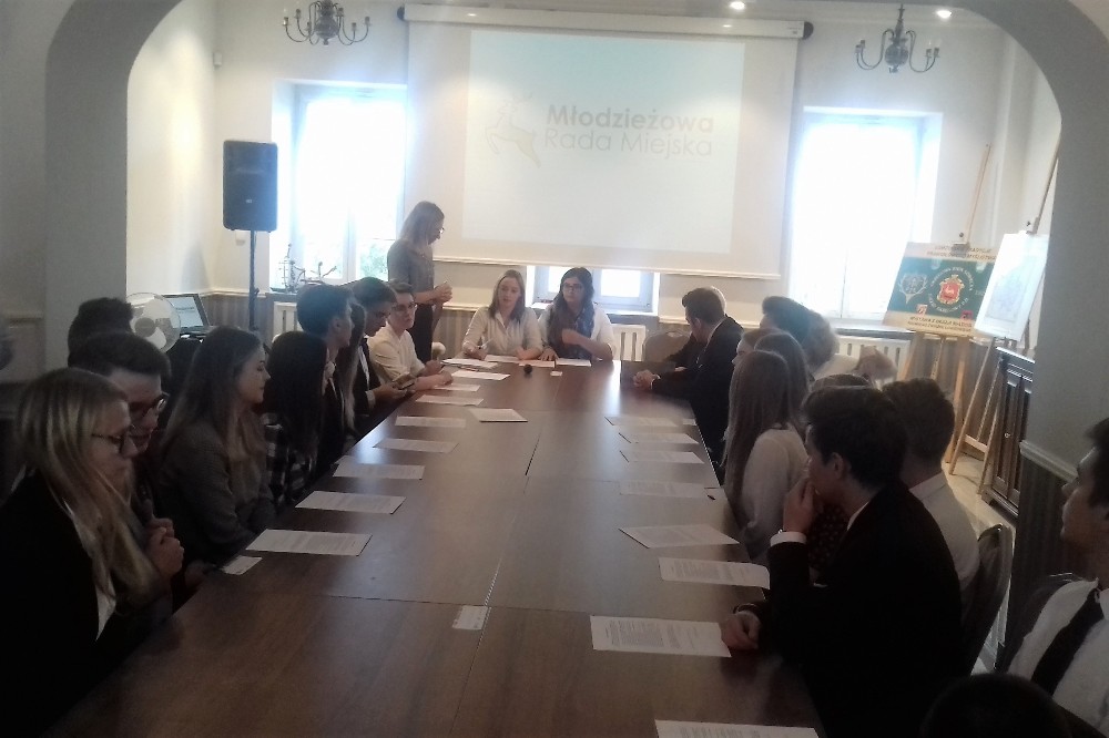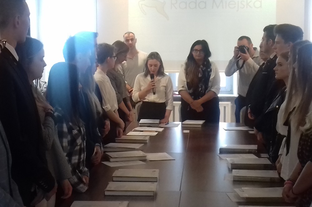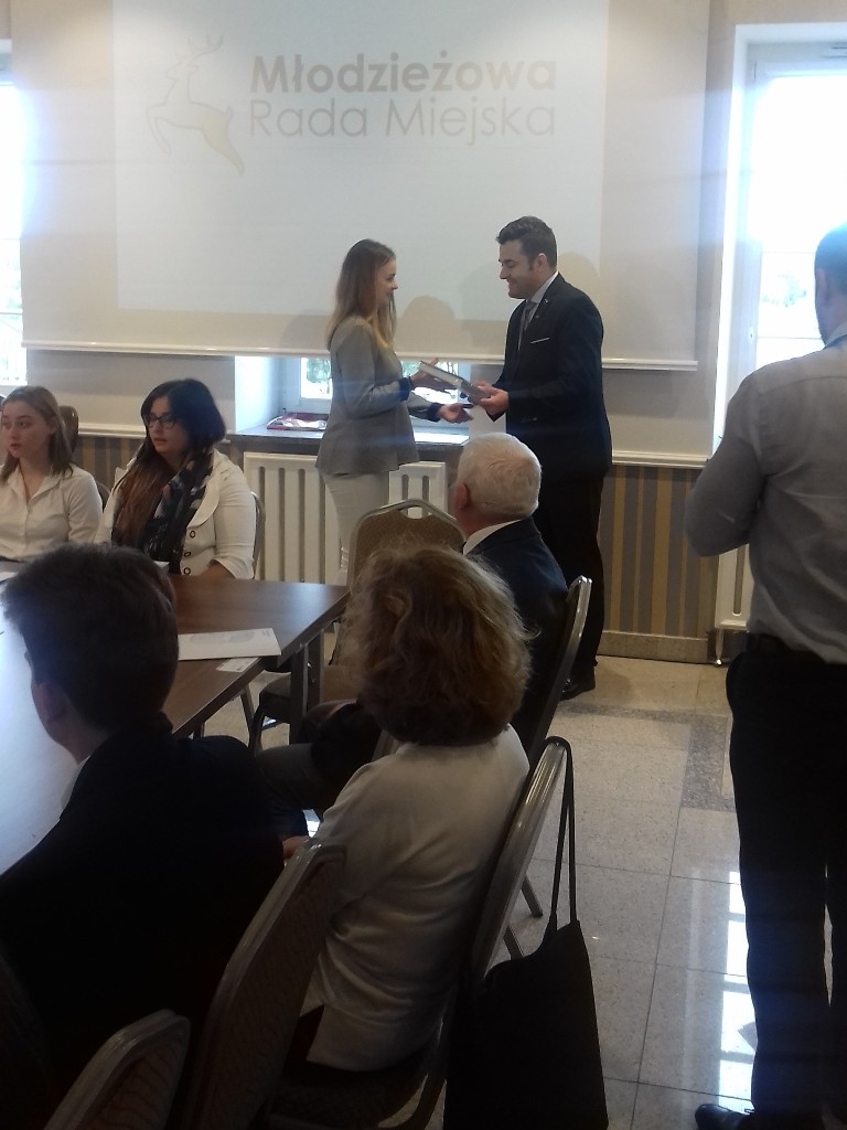 W dn. 28 września br. w sali głównej Domku Pastora odbyła się pierwsza sesja Młodzieżowej Rady Miejskiej, w której uczestniczyło 21 radnych- elektów. Obrady prowadziła nasza uczennica - Eliza Niedźwiecka z ZSTiO nr 4 ( klasa 3 TŻ). W części wprowadzającej sesji wziął udział aktualny Prezydent Łomży - pan Mariusz Chrzanowski, który po krótkim przemówieniu wręczył akty nominacji do Młodzieżowej Rady Miasta Łomży radnym - elektom wraz z pamiątkową książką o naszym mieście. Później, wybrani w czerwcu radni, złożyli uroczyste ślubowanie w obecności Prezydenta Miasta Łomży. Warto nadmienić, iż drugą osobą reprezentującą naszą szkołę w w/w radzie szkolę jest Julia Ruszczyk z klasy 2 Ap.