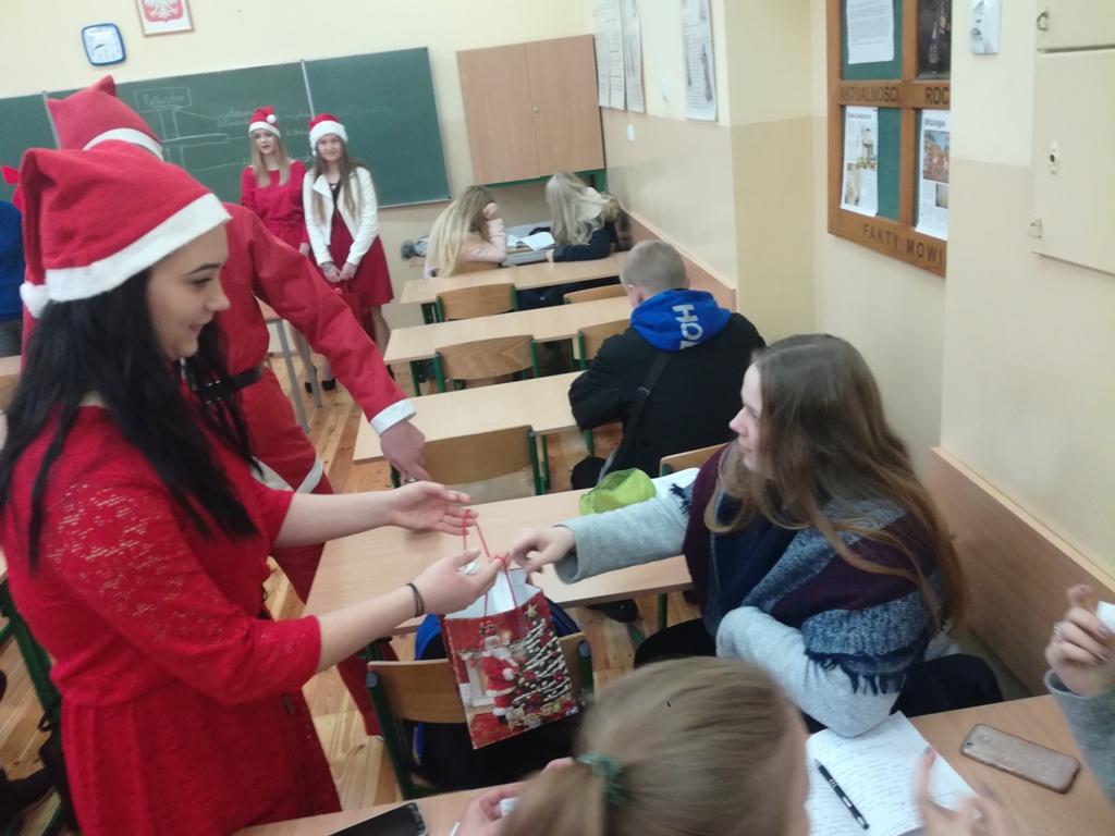 Święty Mikołaj wraz ze Śnieżynkami przemierzał dziś szkolne korytarze i odwiedzał klasy podczas lekcji, aby złożyć wszystkim świąteczne życzenia i poczęstować słodkościami. Wizycie Św. Mikołaja towarzyszyły dźwięki świątecznych piosenek, a w szkole pojawiły się też bożonarodzeniowe dekoracje. Dzięki temu, mogliśmy poczuć już magię zbliżających się świąt.