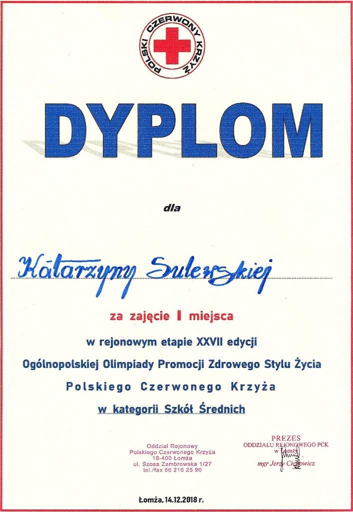 26 listopada 2018odbył się w naszej szkole szkolny etap 27 edycji Ogólnopolskiej Olimpiady Promocji Zdrowego Stylu Życia PCK. W zmaganiach konkursowych wzięło udział 23 uczestników, którzy rozwiązywali test dotyczący prawidłowego odżywiania, pierwszej pomocy, ekologii i profilaktyki zdrowotnej. Największą ilość punktów zdobyła Katarzyna Sulewska z kl. 2 TŻ i to ona zakwalifikowała się do etapu rejonowego.