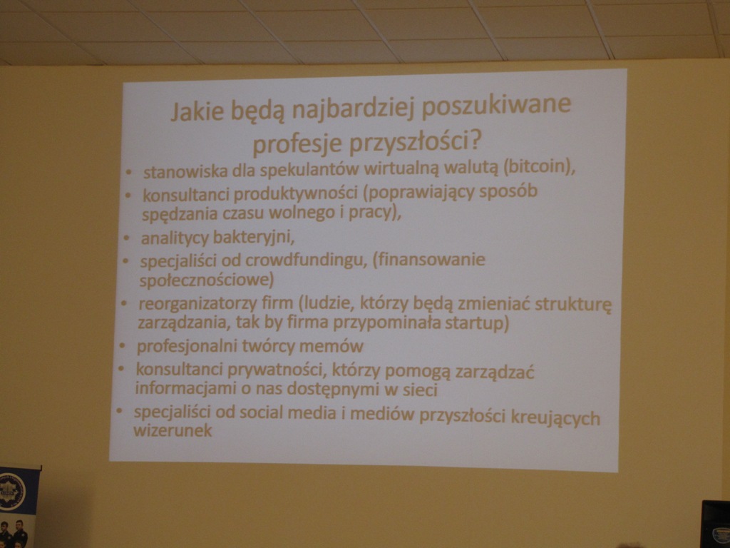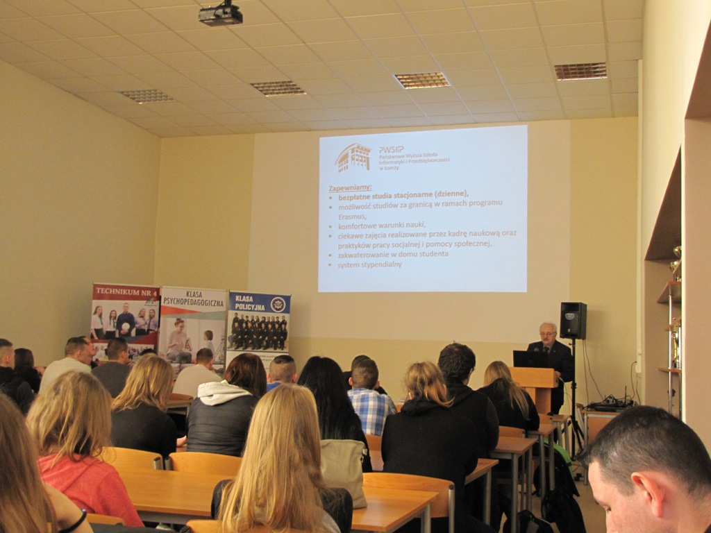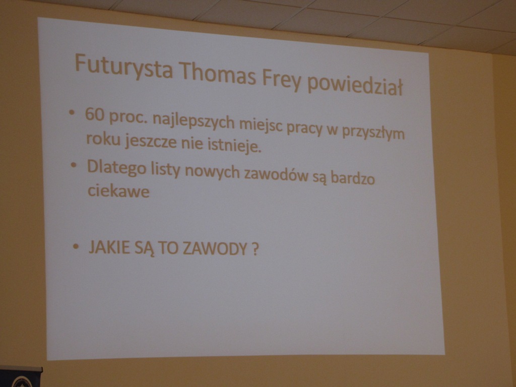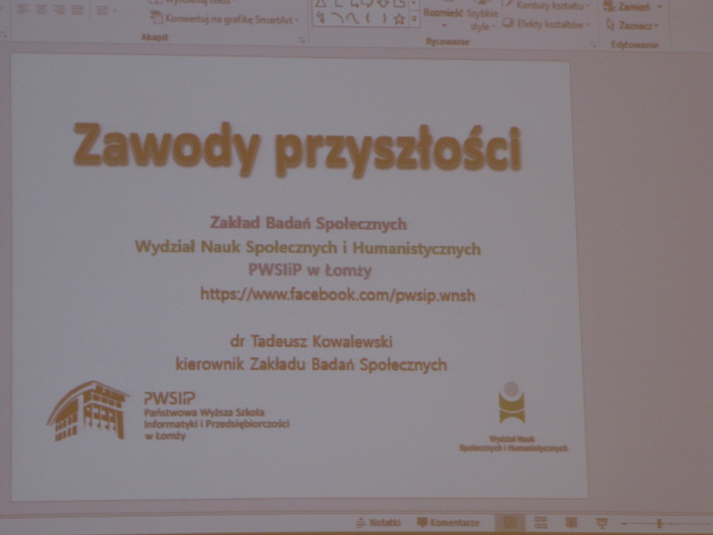 Dnia 26 lutego 19r. młodzież maturalna z naszej szkoły miała okazję uczestniczyć w wykładzie dr Tadeusza Kowalewskiego pt. "Zawody przyszłości". Uczniowie mogli dowiedzieć się o nowych zawodach, które będą poszukiwane i cenione za kilkanaście lat. Jednocześnie została przedstawiona oferta edukacyjna Wyższej Szkoły Informatyki i Przedsiębiorczości w Łomży. Była to ważna wskazówka dla wszystkich, którzy zastanawiają się nad wyborem drogi zawodowej.