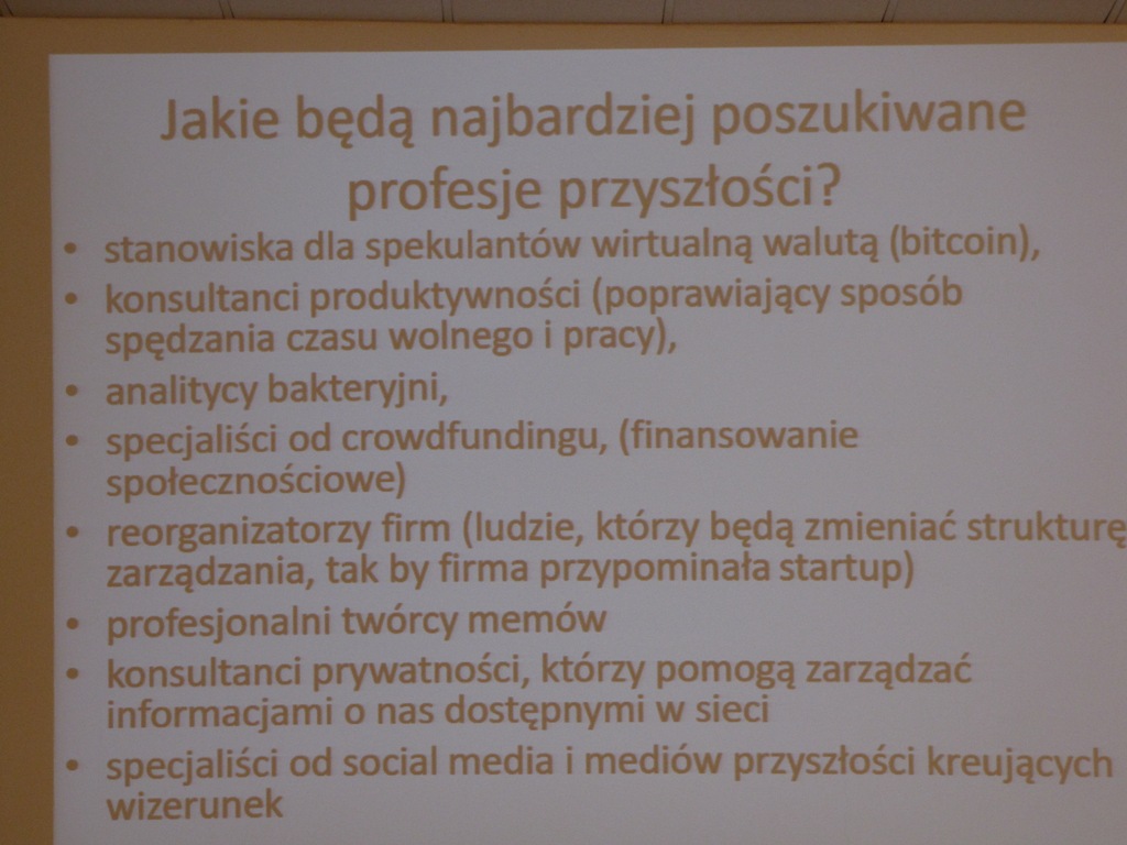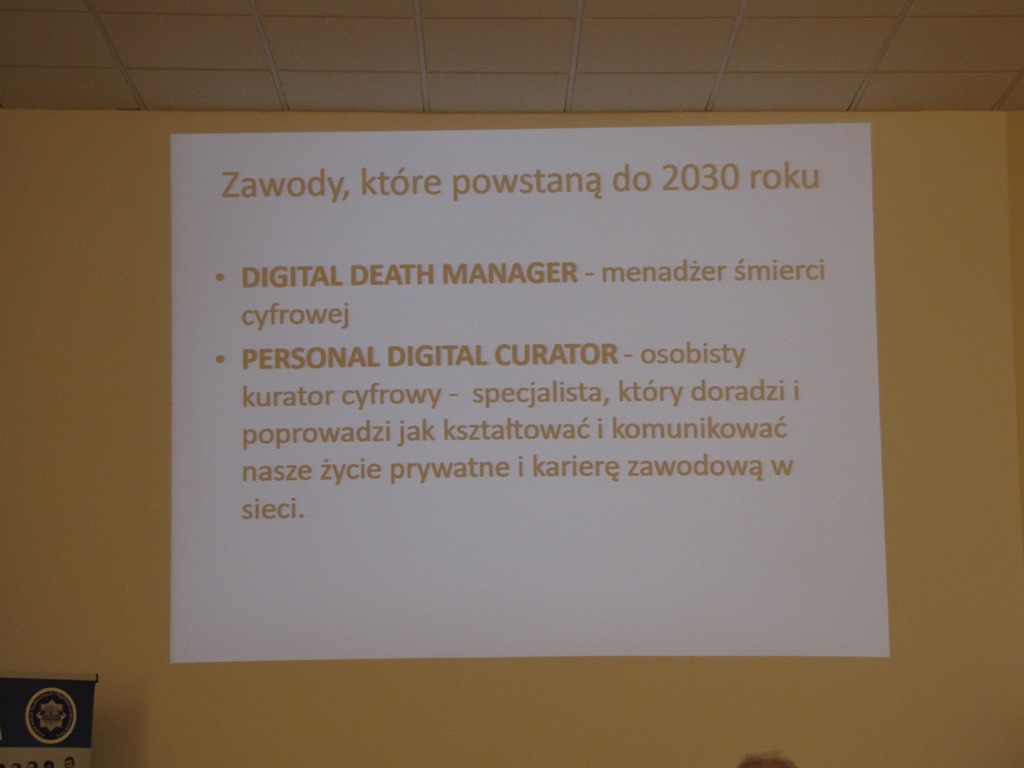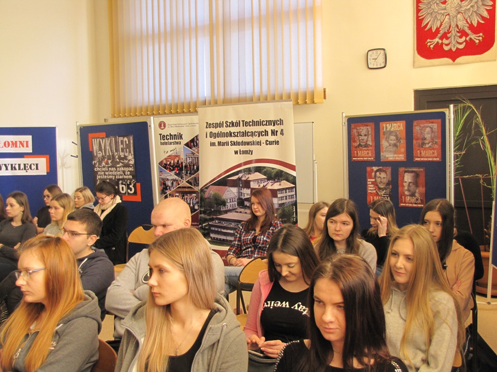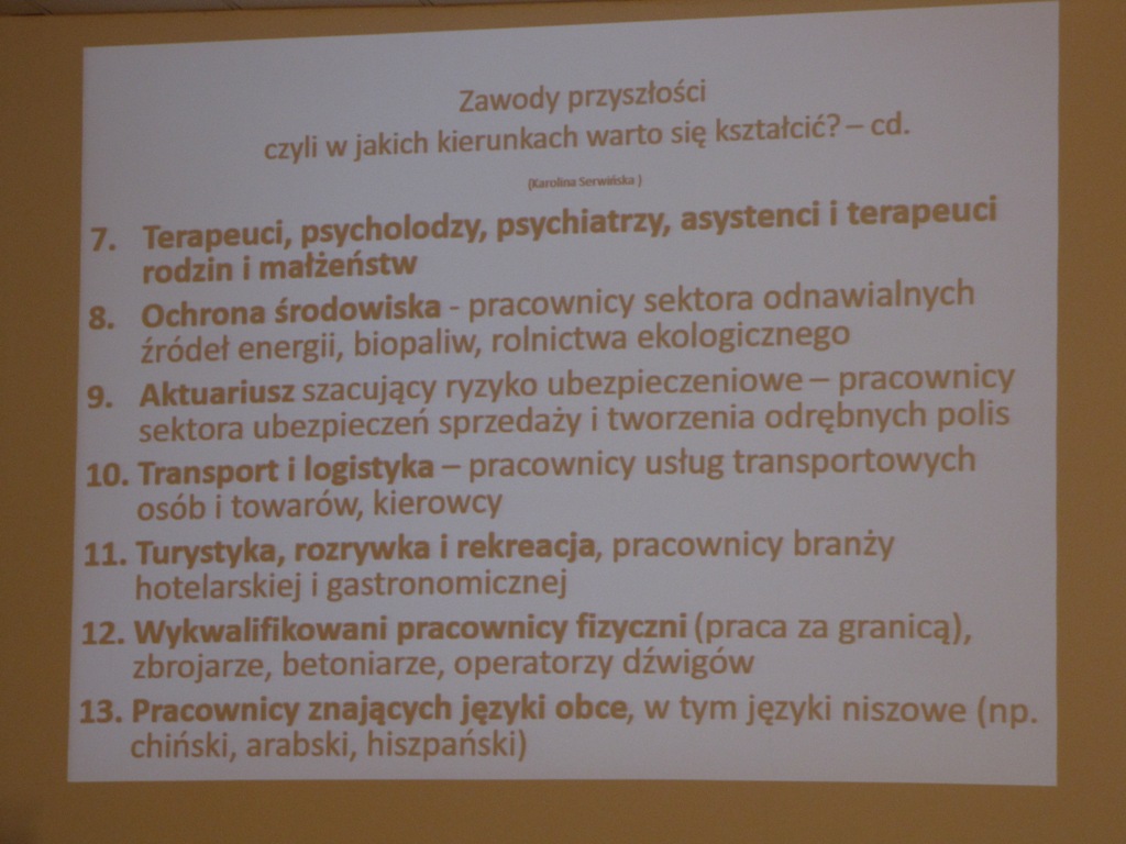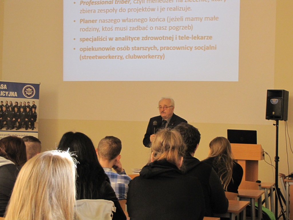 Dnia 26 lutego 19r. młodzież maturalna z naszej szkoły miała okazję uczestniczyć w wykładzie dr Tadeusza Kowalewskiego pt. "Zawody przyszłości". Uczniowie mogli dowiedzieć się o nowych zawodach, które będą poszukiwane i cenione za kilkanaście lat. Jednocześnie została przedstawiona oferta edukacyjna Wyższej Szkoły Informatyki i Przedsiębiorczości w Łomży. Była to ważna wskazówka dla wszystkich, którzy zastanawiają się nad wyborem drogi zawodowej.