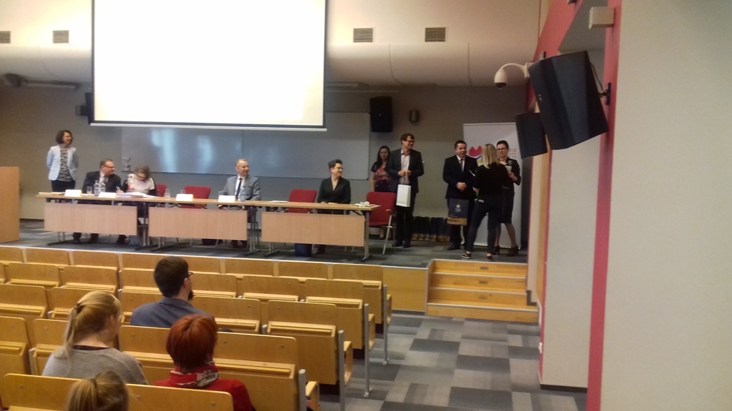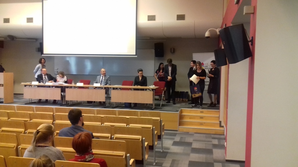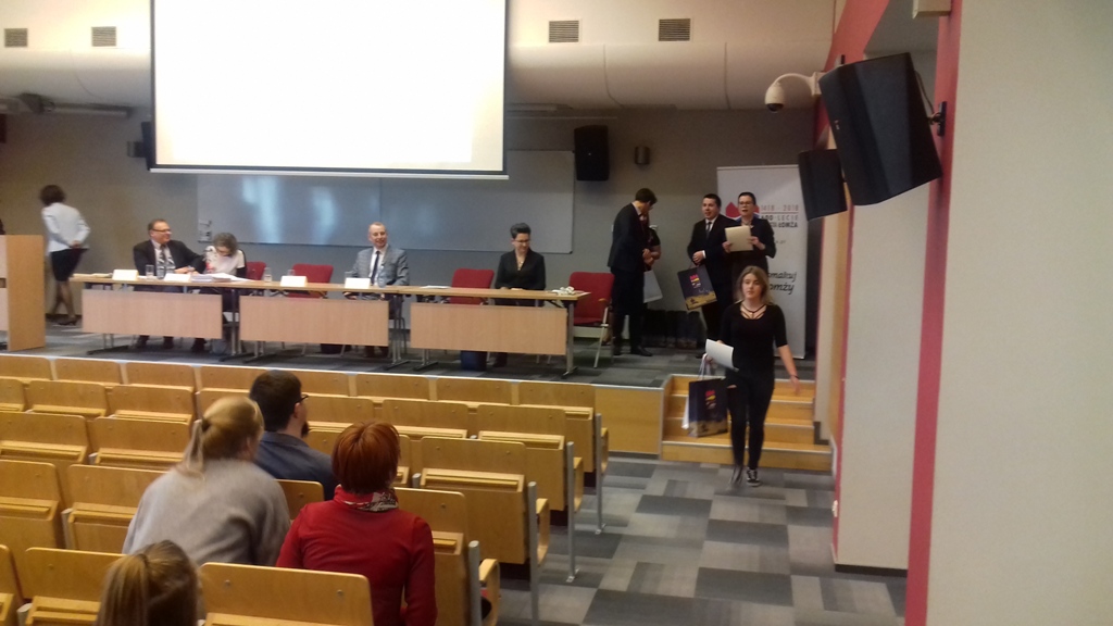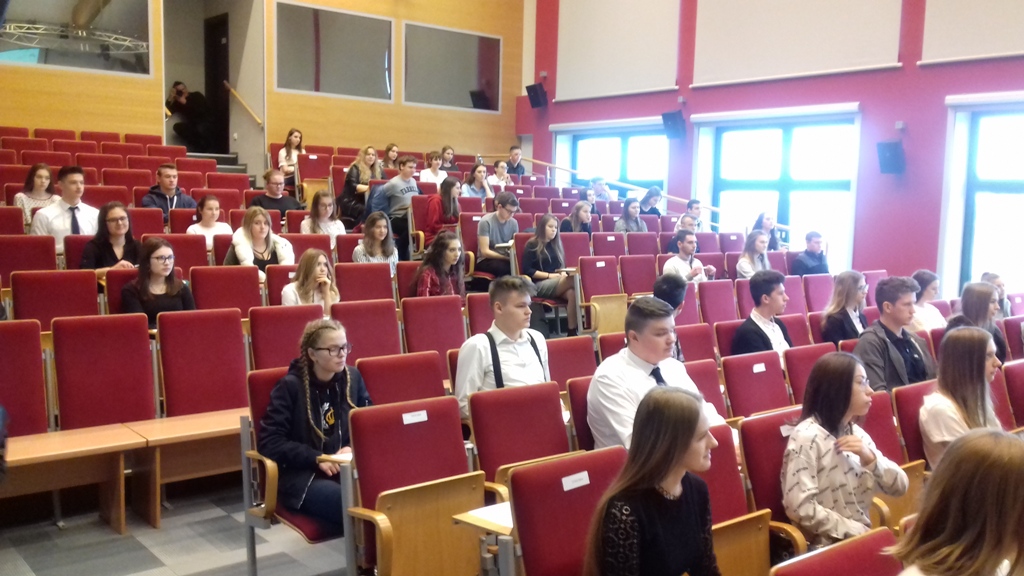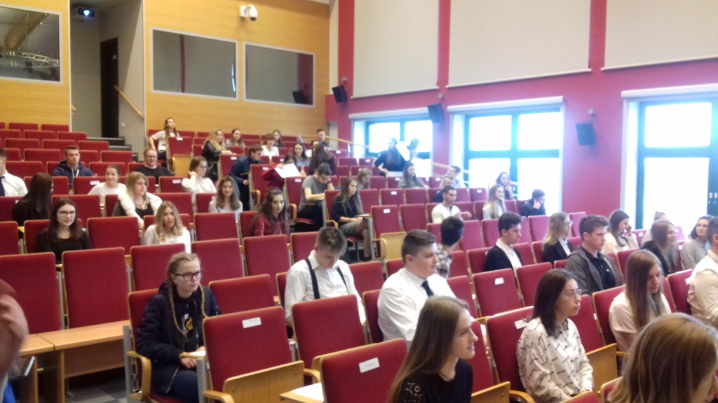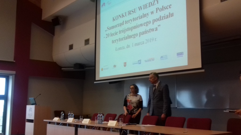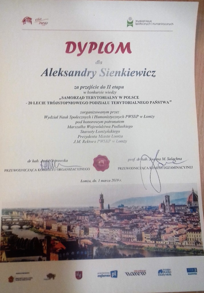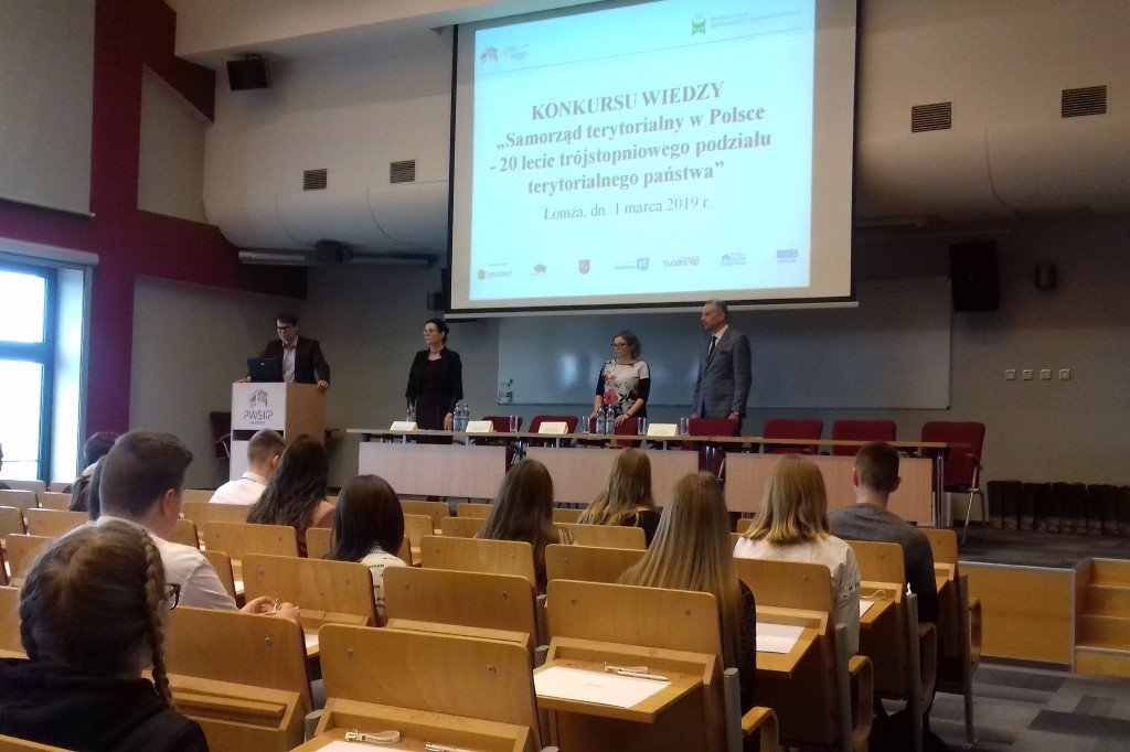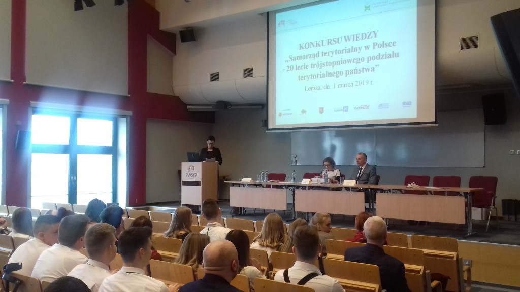 01.03.2019 r. w siedzibie Państwowej Szkoły Wyższej Informatyki i Przedsiębiorczości w Łomży odbył się konkurs „Samorząd terytorialny w Polsce – 20 lat trójstopniowego podziału terytorialnego”. Zgromadził on kilkudziesięciu uczniów ze szkół średnich w Łomży oraz z okolicznych miejscowości. Nasza szkoła była reprezentowana przez sześcioosobowy zespól uczennic z klasy 1 Ap, 1 Pp oraz z 1 AH pod opieką nauczyciela pana Wiesława Czupryńskiego. Konkurs zaczął się testem z zakresu prawa samorządowego, po którym wyłoniono 8 osób do ścisłego finału. Jedna z naszych uczennic z klasy 1 AH Aleksandra Sienkiewicz została finalistką konkursu, co jest dużym wyróżnieniem biorąc pod uwagę ilość konkurujących ze sobą uczniów. W trakcie finału dla pozostałych uczestników zorganizowano warsztaty prowadzone przez Prorektora PWSIiP dr Dariusza Perło „Team building”. Po warsztatach i rundzie finałowej odbyło się wręczenie pamiątkowych dyplomów oraz nagród dla uczestników finału konkursu. Gratulujemy naszej uczennicy zakwalifikowania się do finału konkursu.