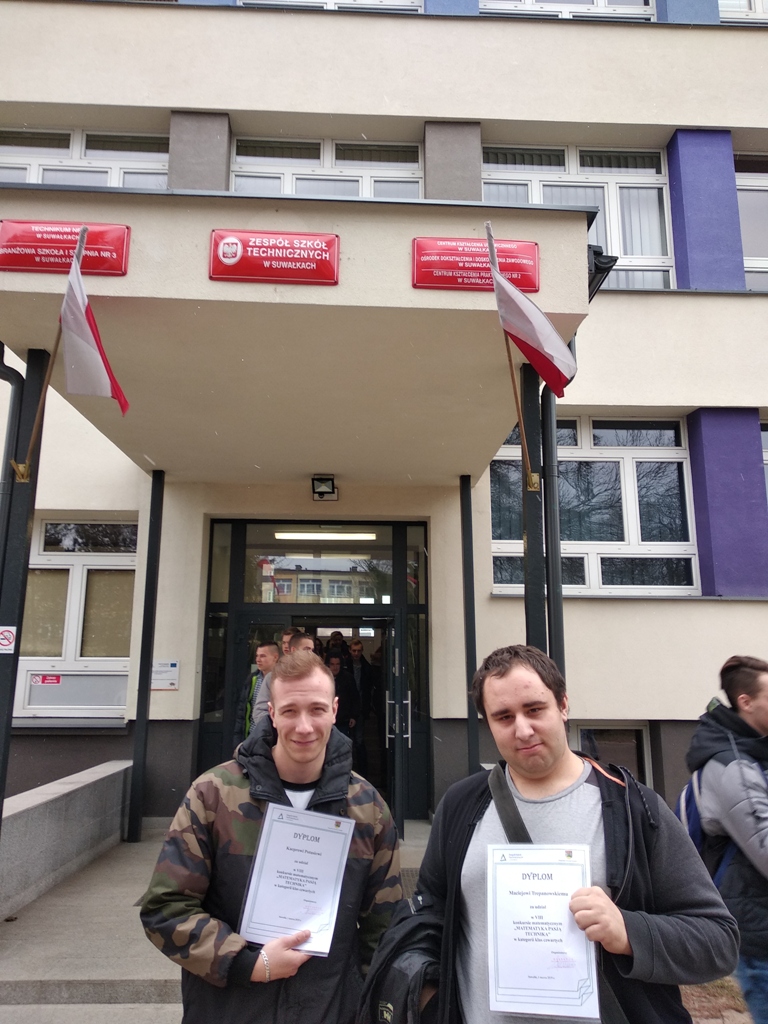 Uczniowie naszej szkoły po raz pierwszy wzięli udział w konkursie organizowanym przez Zespół Szkół Technicznych w Suwałkach. W finale konkursu – o miano najlepszego matematyka – rywalizowało 39 uczniów z klas trzecich i czwartych techników z 16 szkół województwa podlaskiego. Maciej Trepanowski i Kacper Potaś z klasy IV a Technikum Budowlanego pod opieką Agaty Siwik 1 marca 2019 r. udali się do Suwałk i dzielnie zmagali się z zadaniami finałowymi.