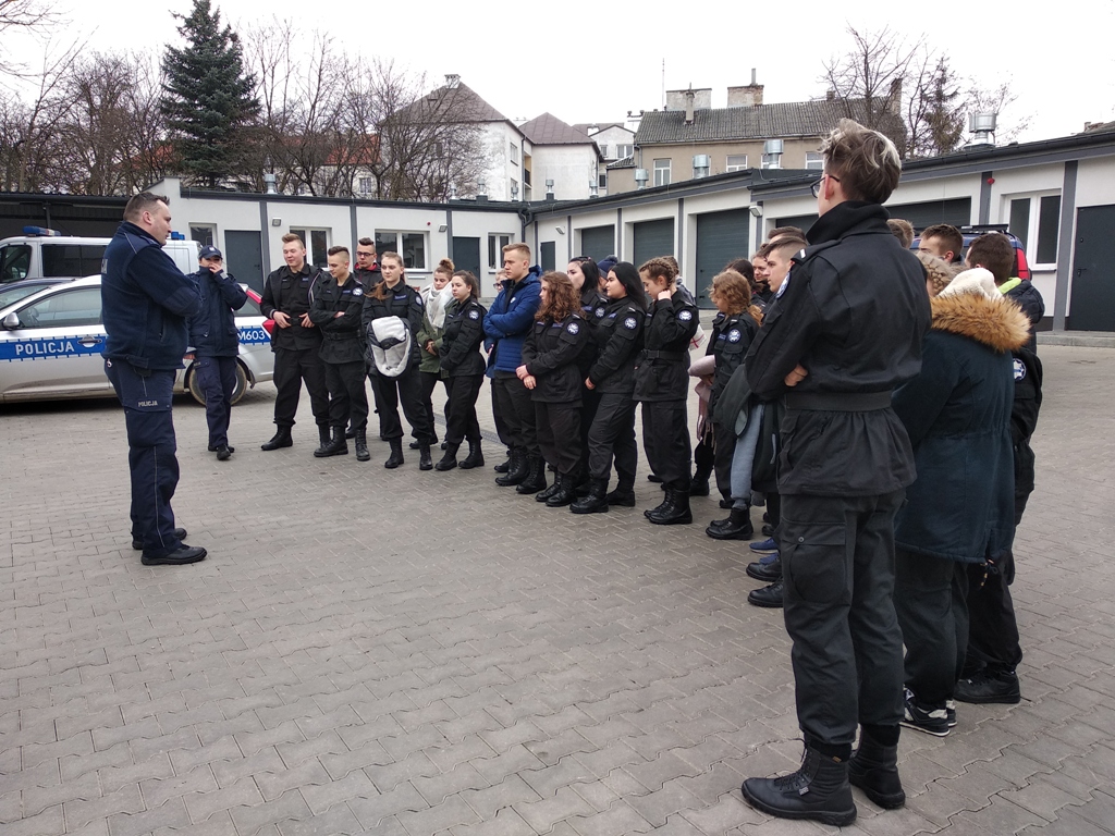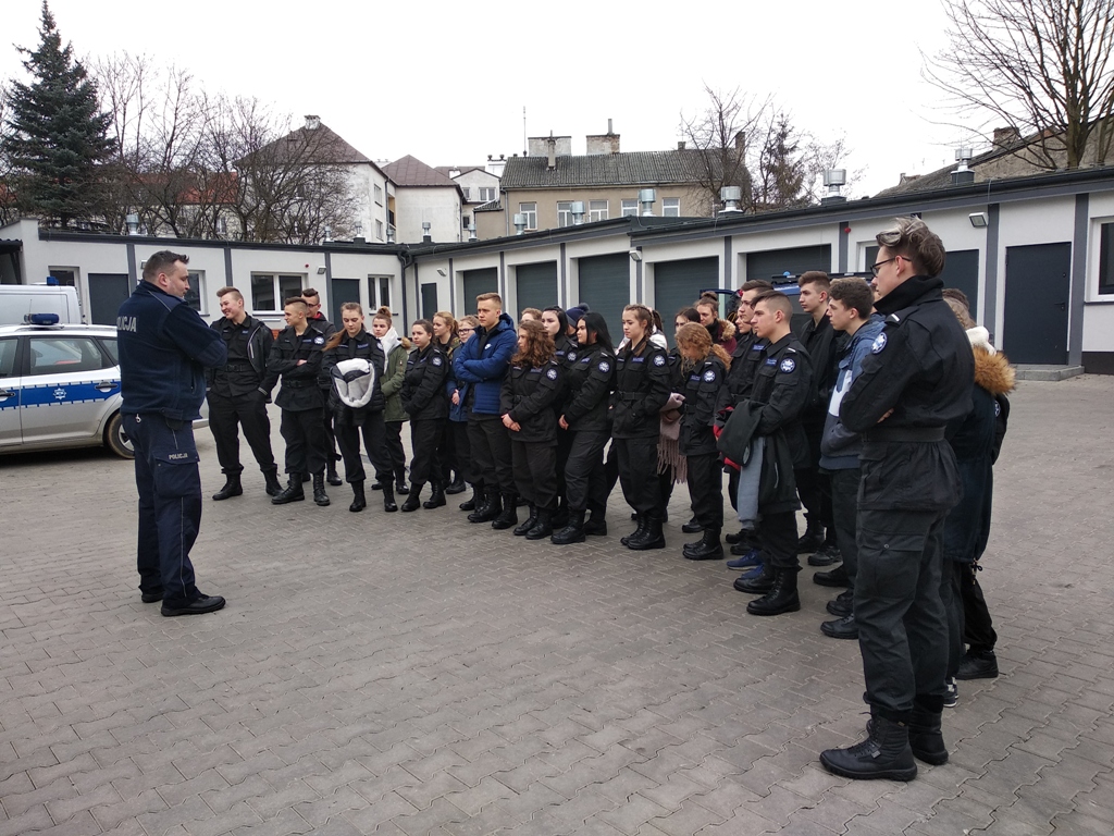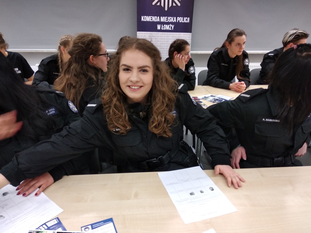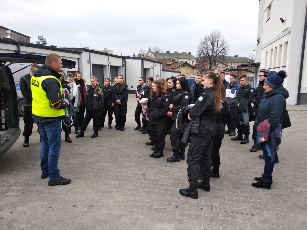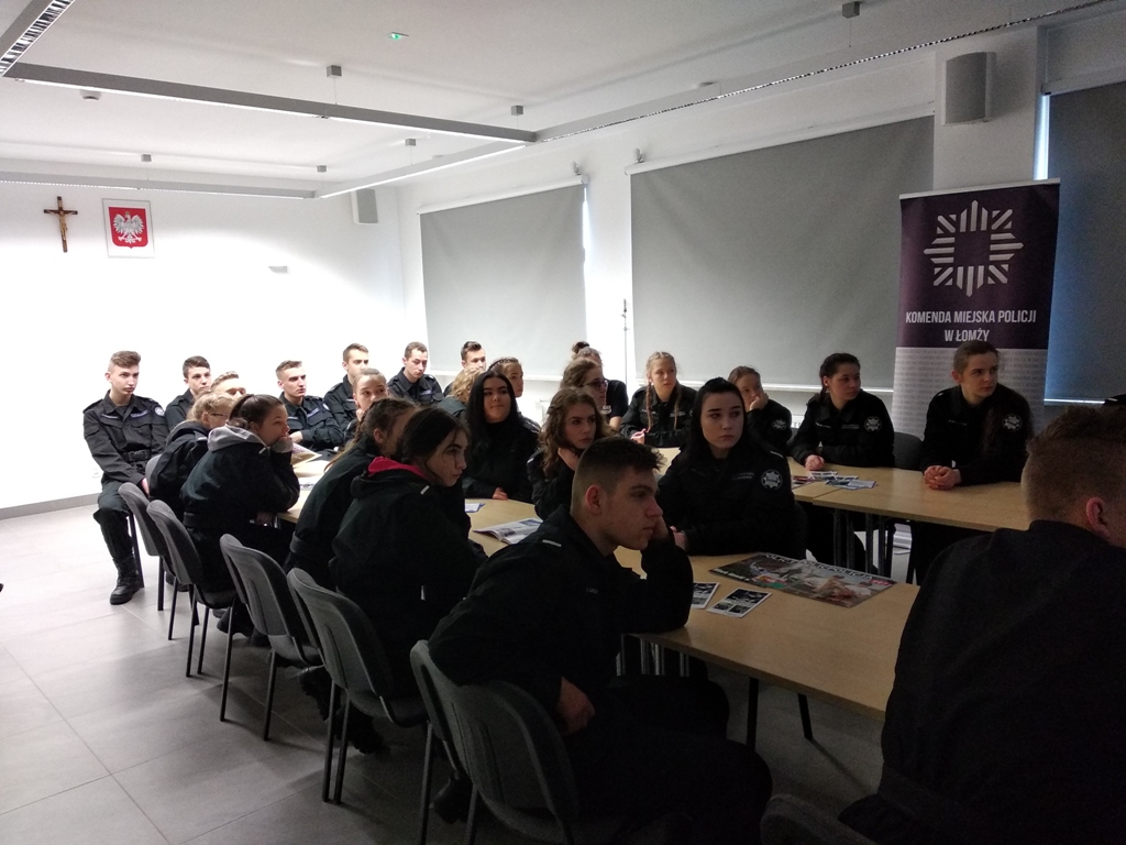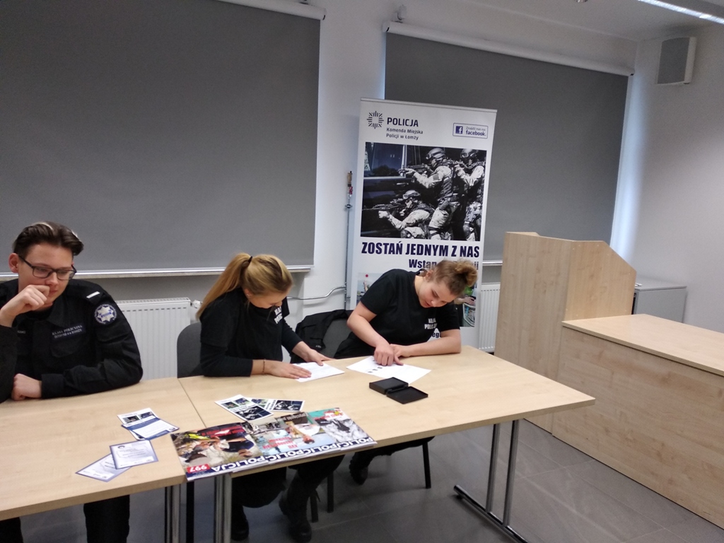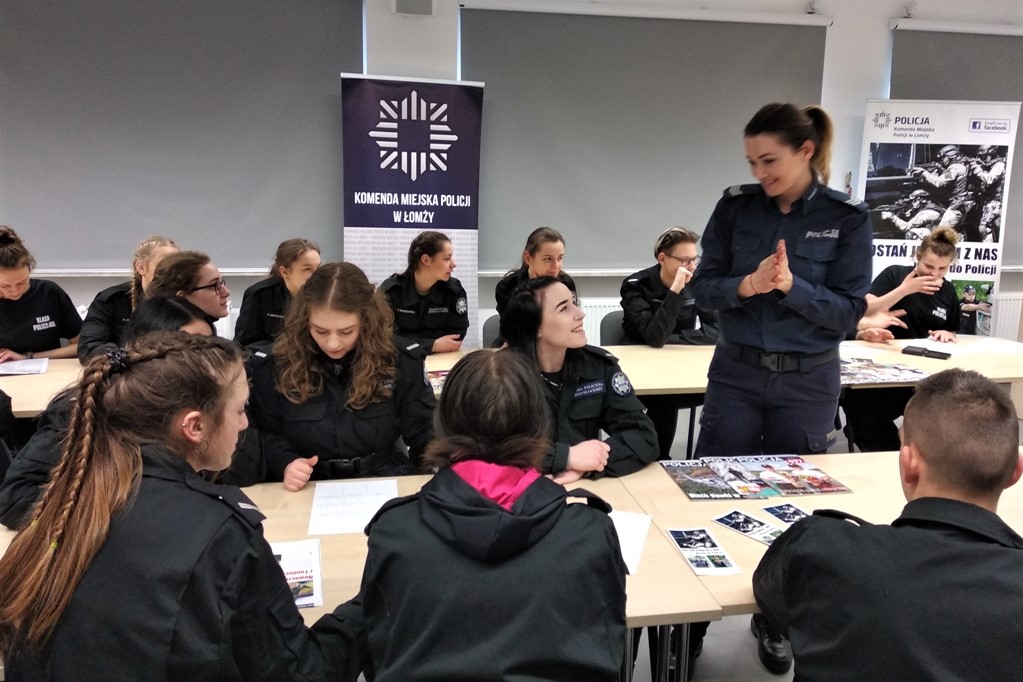 Uczniowie klas policyjnych 1AP i 2AP gościli 14 marca 2019 r. w murach Komendy Miejskiej Policji w Łomży. Funkcjonariusze opowiadali o swoim zawodzie i zachęcali do wstąpienia w szeregi policyjnej formacji. O codziennej pracy policjantów opowiadał między innymi technik kryminalistyki, przewodnik psa służbowego i dzielnicowa. Młodzież mogła obejrzeć wnętrze radiowozu wykorzystywanego do obsługi zdarzeń drogowych i porozmawiać o wykonywanej pracy z policjantami ruchu drogowego. Mundurowi chętnie dzielili się doświadczeniami z przebiegu swojej wieloletniej służby. Etapy rekrutacji oraz warunki jakie musi spełnić kandydat, aby zostać funkcjonariuszem Policji przedstawili natomiast specjaliści z Wydziału Prezydialnego Kadr i Szkolenia, a także policyjni profilaktycy.