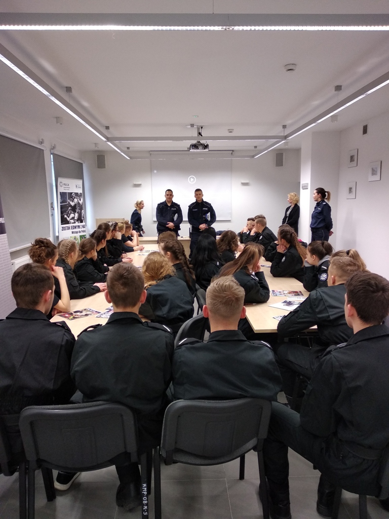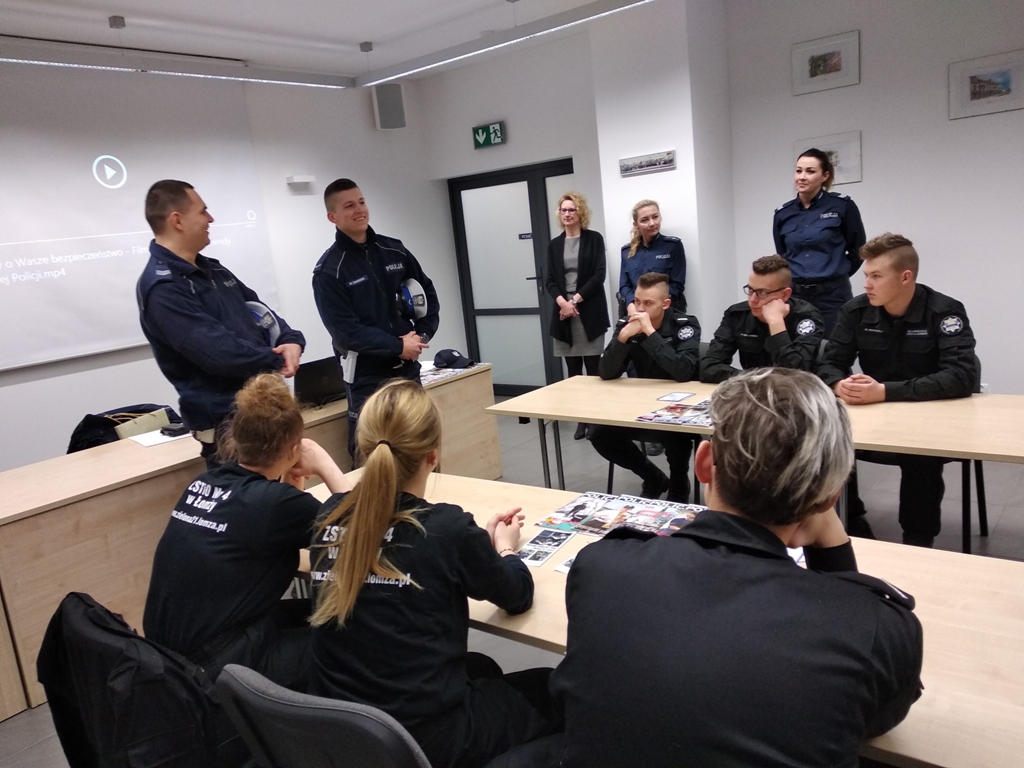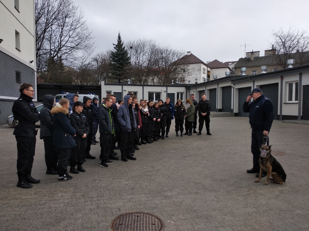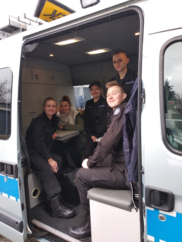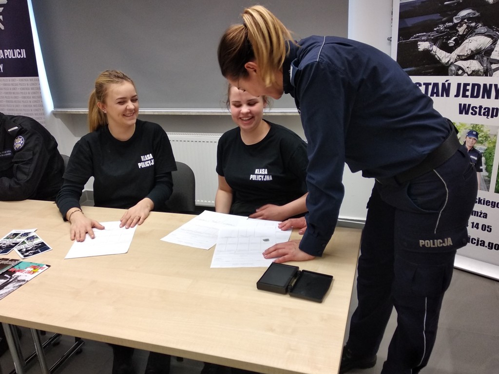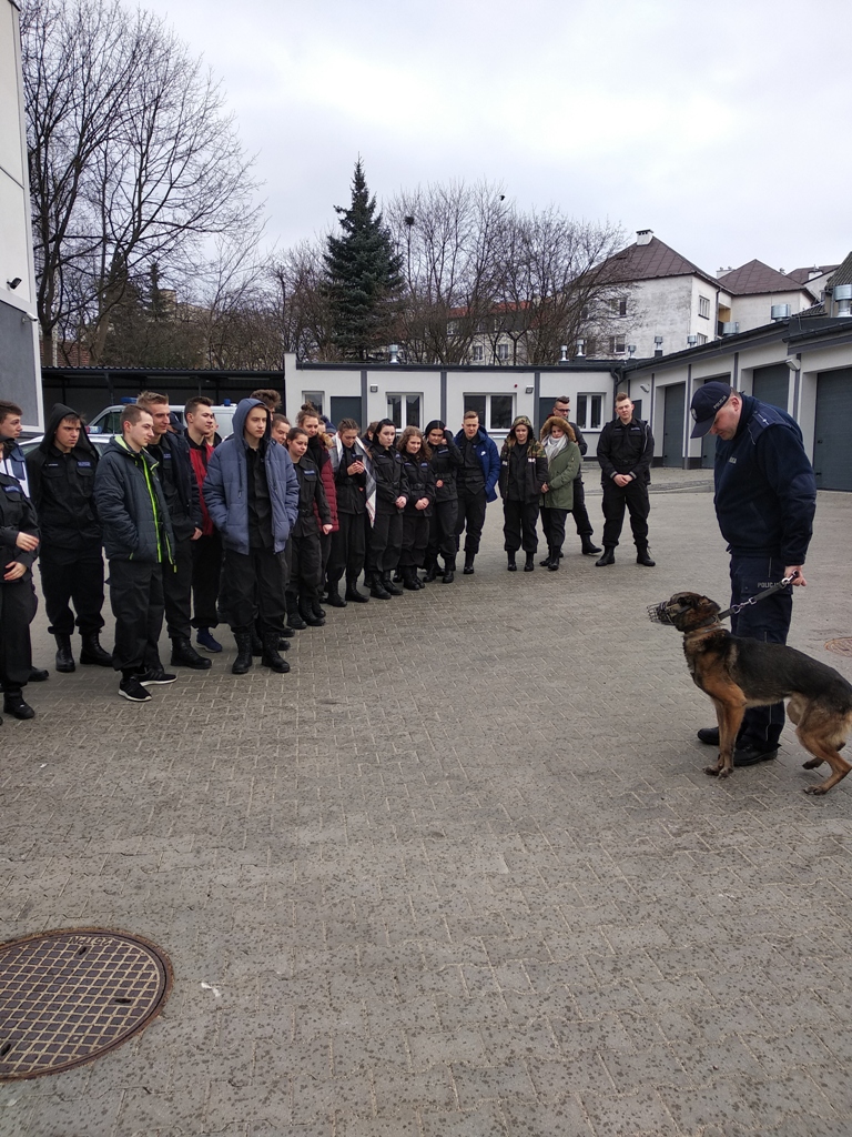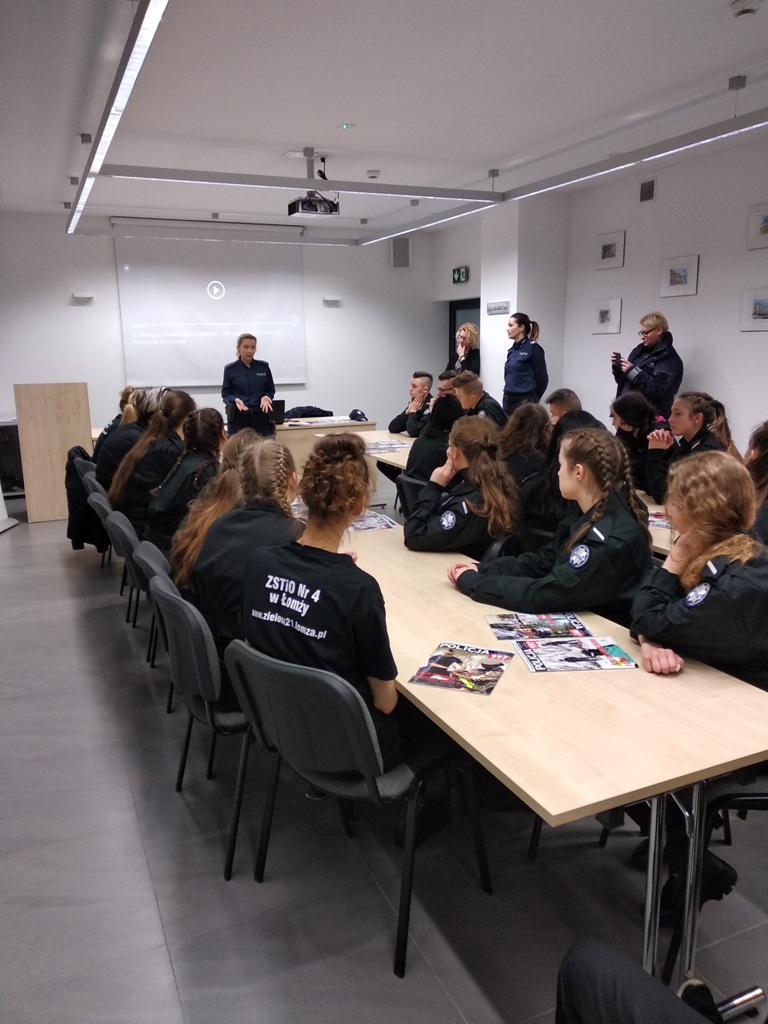 Uczniowie klas policyjnych 1AP i 2AP gościli 14 marca 2019 r. w murach Komendy Miejskiej Policji w Łomży. Funkcjonariusze opowiadali o swoim zawodzie i zachęcali do wstąpienia w szeregi policyjnej formacji. O codziennej pracy policjantów opowiadał między innymi technik kryminalistyki, przewodnik psa służbowego i dzielnicowa. Młodzież mogła obejrzeć wnętrze radiowozu wykorzystywanego do obsługi zdarzeń drogowych i porozmawiać o wykonywanej pracy z policjantami ruchu drogowego. Mundurowi chętnie dzielili się doświadczeniami z przebiegu swojej wieloletniej służby. Etapy rekrutacji oraz warunki jakie musi spełnić kandydat, aby zostać funkcjonariuszem Policji przedstawili natomiast specjaliści z Wydziału Prezydialnego Kadr i Szkolenia, a także policyjni profilaktycy.