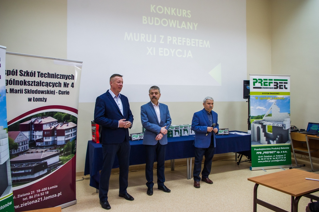 5 maja 2019 roku w naszej szkole odbyła się XI edycja konkursu budowlanego „Muruj z Prefbetem”. W zmaganiach wzięli udział uczniowie z zaprzyjaźnionych szkół. Celem konkursu była integracja szkół budowlanych z regionu oraz promocja technologii murowania na klej z bloczków gazobetonowych produkowanych przez sponsora konkursu firmę PREFBET – ŚNIADOWO. Była to doskonała okazja do spotkania się i wymiany doświadczeń pomiędzy nauczycielami zawodu i uczniami ze szkół o profilu budowlanym.