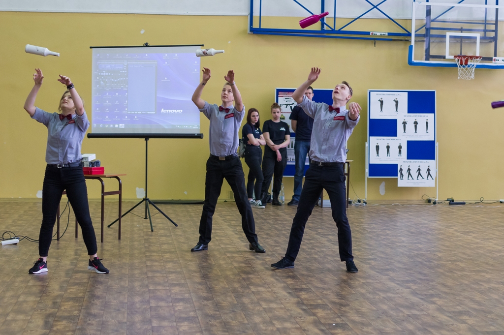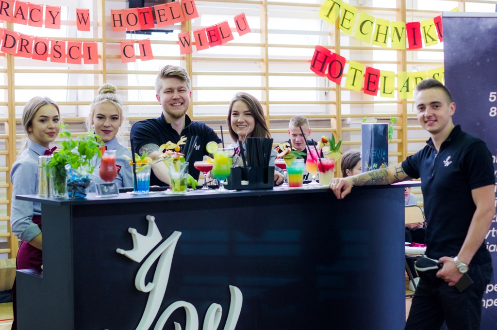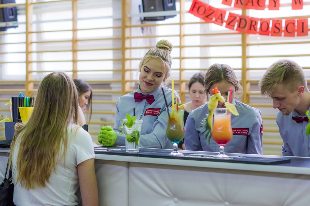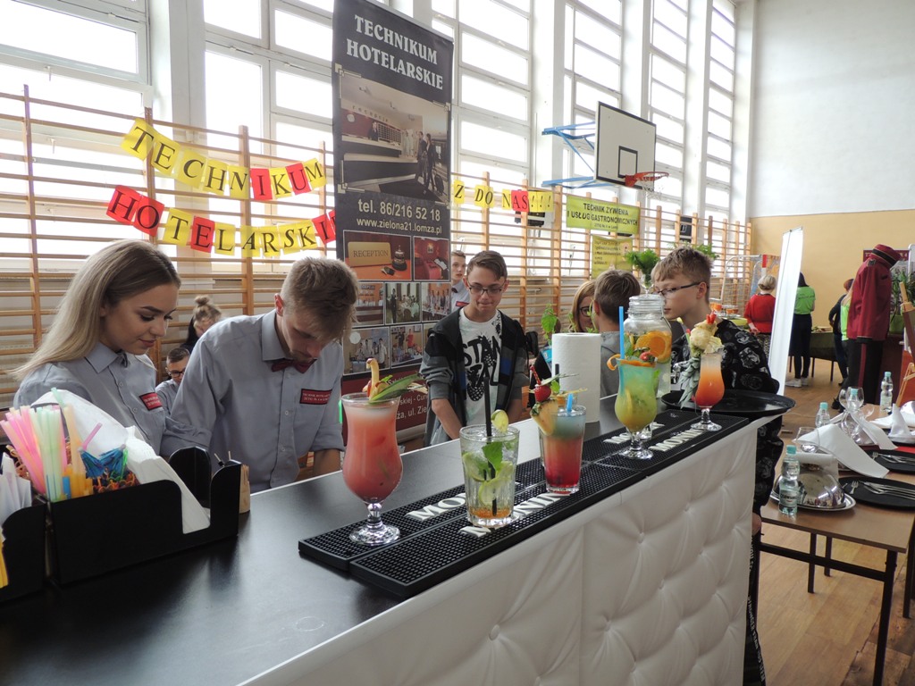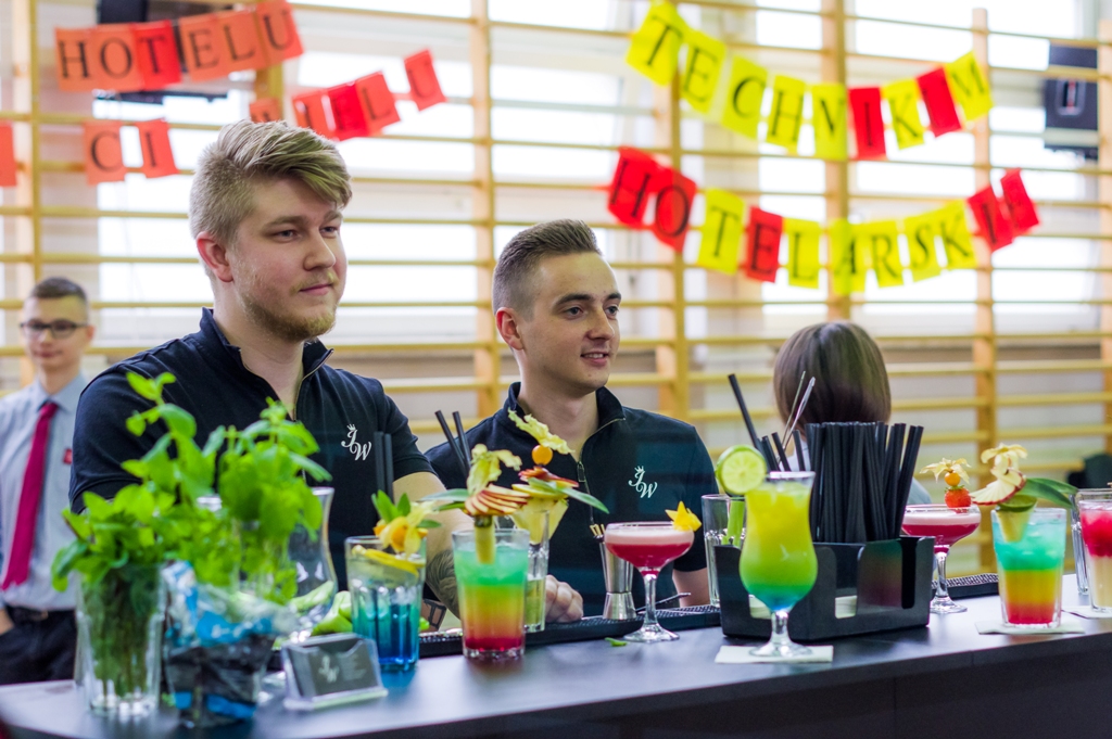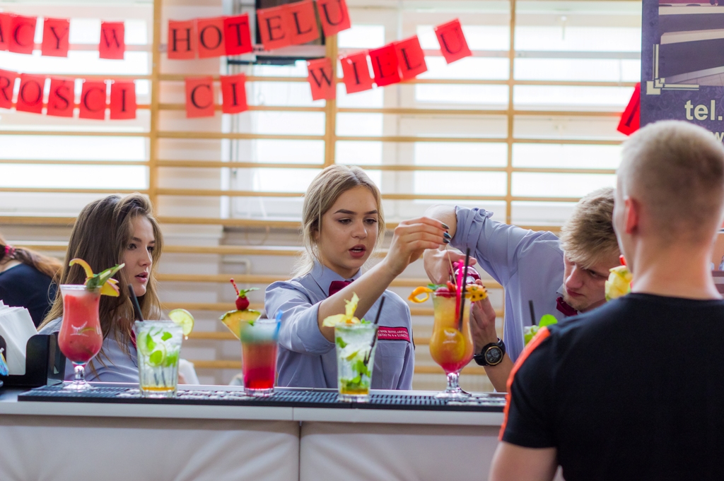 Z kolei młodzież z branży hotelarskiej zaskoczyła przybyłych prezentacją musztry kelnerskiej, obsługi klientów i gości w recepcji hotelu, sztuki baristycznej oraz pokazem barmańskim w stylu Flair. Uczniowie przyrządzali i serwowali bezalkoholowe drinki. Ogromną atrakcję dla uczestników Dnia Otwartego stanowiło obserwowanie podczas pracy profesjonalnych barmanów z drink baru „Imperium Weselne” - p. Jakuba Kosewskiego i p. Patryka Ciborowskiego.