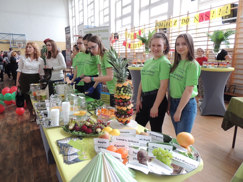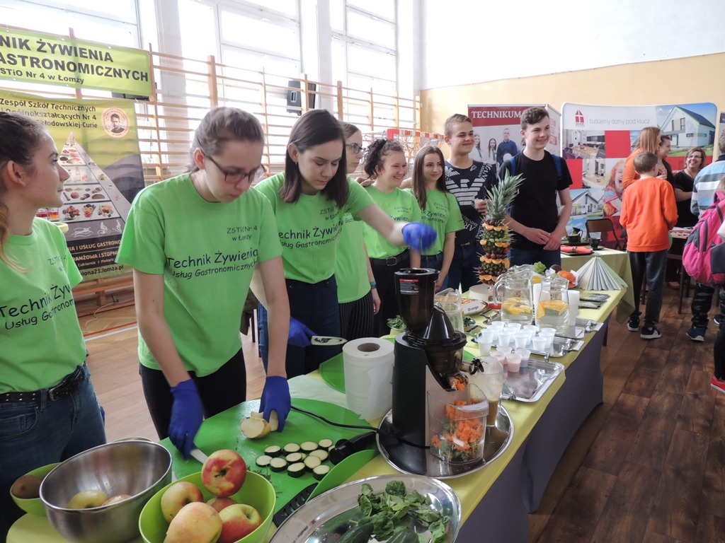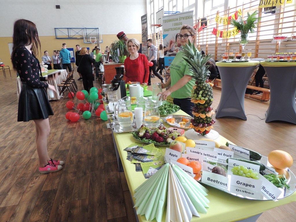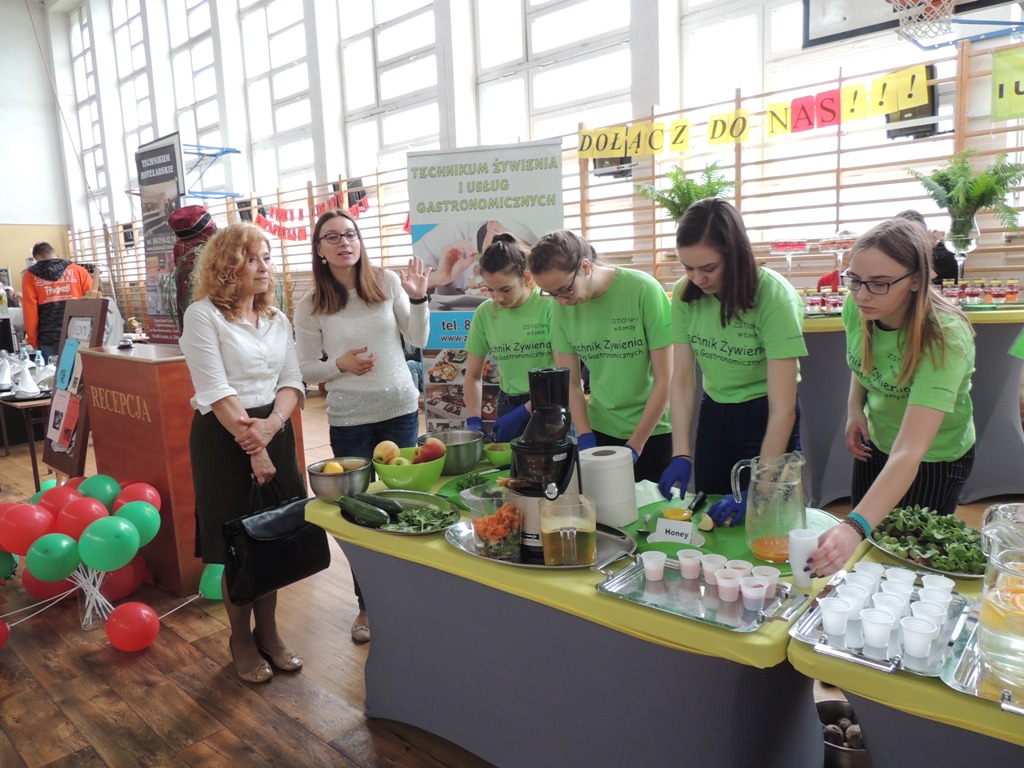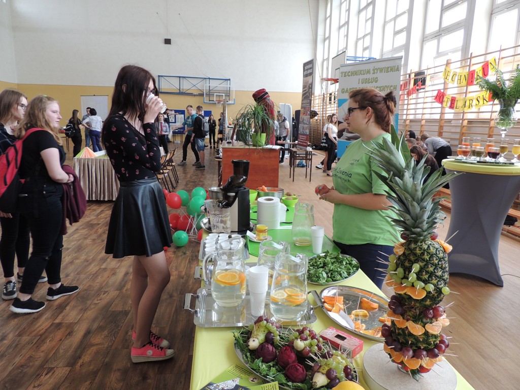 Natomiast młodzież ucząca się w zawodzie technik żywienia i usług gastronomicznych przygotowała prezentację pod hasłem ”Zdrowe żywienie i zdrowy styl życia”. Ekspozycja obejmowała: pokaz produkcji soków (owocowych, warzywnych, owocowo – warzywnych) , napojów na bazie wody, owoców i ziół, niskokalorycznych deserów (na bazie owoców i galaretek) oraz przygotowywanie przekąsek z wykorzystaniem warzyw i owoców. Uatrakcyjnieniu spotkania służył quiz o zdrowej żywności w języku angielskim. Ważny element estetyczny stoiska stanowiła przykładowa dekoracja stołu do śniadania.