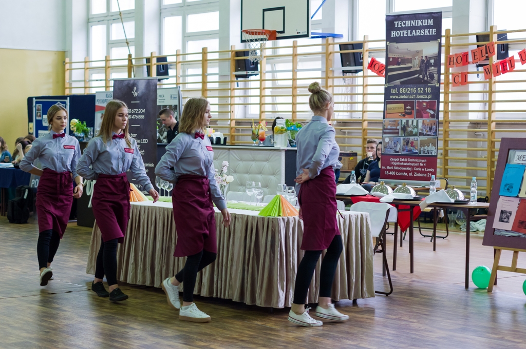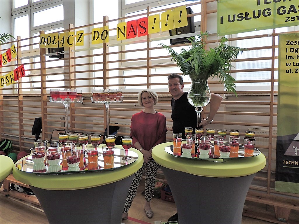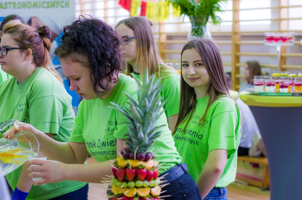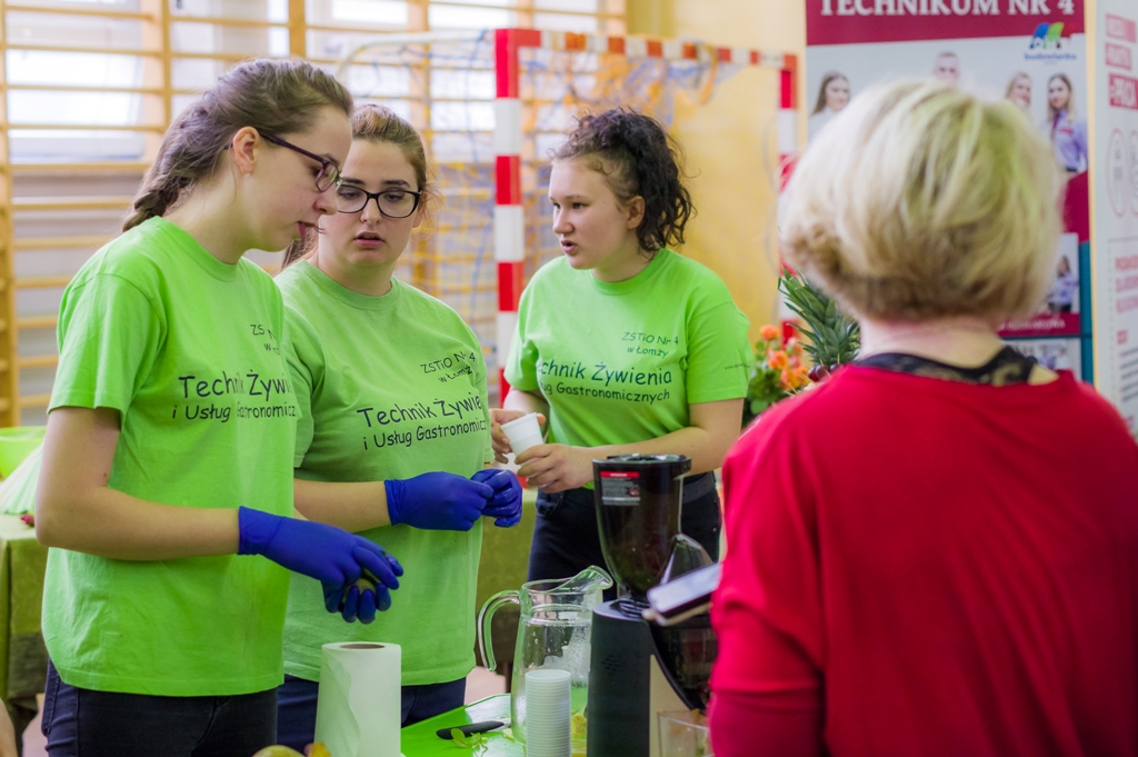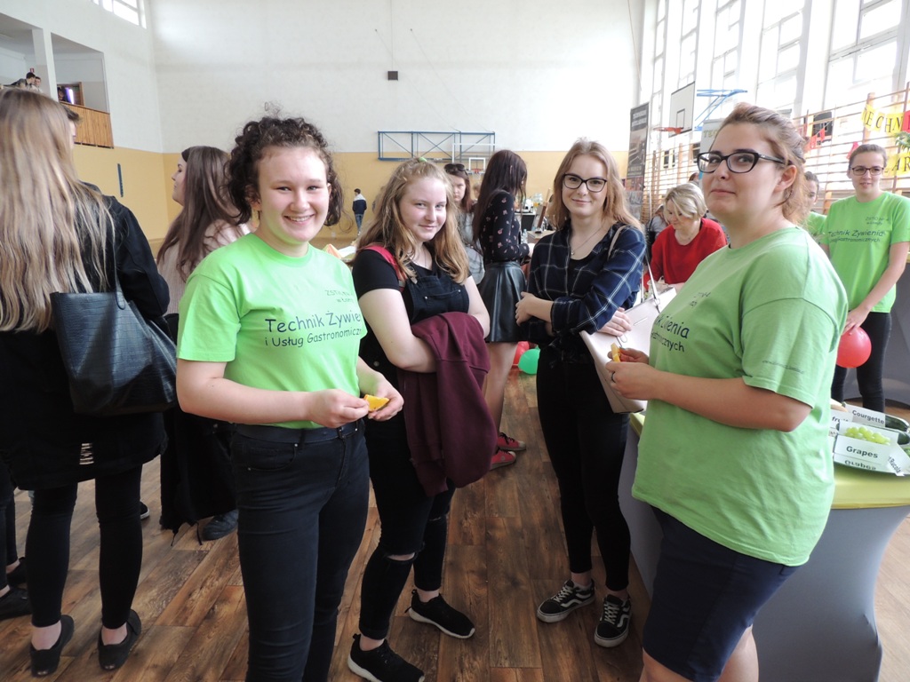 Natomiast młodzież ucząca się w zawodzie technik żywienia i usług gastronomicznych przygotowała prezentację pod hasłem ”Zdrowe żywienie i zdrowy styl życia”. Ekspozycja obejmowała: pokaz produkcji soków (owocowych, warzywnych, owocowo – warzywnych) , napojów na bazie wody, owoców i ziół, niskokalorycznych deserów (na bazie owoców i galaretek) oraz przygotowywanie przekąsek z wykorzystaniem warzyw i owoców. Uatrakcyjnieniu spotkania służył quiz o zdrowej żywności w języku angielskim. Ważny element estetyczny stoiska stanowiła przykładowa dekoracja stołu do śniadania.